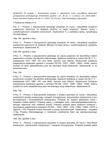 06.06.2016 W związku z otrzymaniem prośby o wyjaśnienie treści specyfikacji dotyczącej postępowania przetargowego ZP/10/2016, zgodnie z art. 38 ust. 1 i 2 ustawy z dn. 29.01.2004 r. Prawo Zamówień Publicznych (Dz. U. z 2010 r. Nr 113, poz. 759) Zamawiający odpowiada: 1.Pytania do Pakietu nr 4: Poz. 2 – Prosimy o dopuszczenie gotowego preparatu do mycia i dezynfekcji wszelkich powierzchni odpornych na działanie alkoholu na bazie propanolu, etanolu, aminy i czwartorzędowych związków amonowych. Opakowanie 1L z podwójną dyszą spryskującą lub spieniającą. Odp. Nie, zgodnie z siwz. 2.Poz. 3 - Prosimy o dopuszczenie gotowego preparatu do mycia i dezynfekcji wszelkich powierzchni odpornych na działanie alkoholu na bazie aminy i czwartorzędowych związków amonowych. Opakowanie 5L. Odp. Nie, zgodnie z siwz. 3.Poz. 4 – Prosimy o dopuszczenie gotowego do użycia preparatu do dezynfekcji małych powierzchni na bazie 72g alkoholu etanolowego. Spektrum biobójcze w czasie 30s (B, F, V – podstawowe HCV, HBV, HIV oraz Rota, Vaccina oraz Adeno). Skuteczność biobójcza potwierdzona badaniami zgodnie z normami PN EN: 13727, 13697, 13624, 14348. Jedyny produkt na rynku sklasyfikowany jako nie drażniący drogi oddechowe. Opakowanie 1L ze spryskiwaczem. Odp. Tak. 4.Poz. 5 - Prosimy o dopuszczenie gotowego do użycia preparatu do dezynfekcji małych powierzchni na bazie 72g alkoholu etanolowego. Spektrum biobójcze w czasie 30s (B, F, V – podstawowe HCV, HBV, HIV oraz Rota, Vaccina oraz Adeno). Skuteczność biobójcza potwierdzona badaniami zgodnie z normami PN EN: 13727, 13697, 13624, 14348. Jedyny produkt na rynku sklasyfikowany jako nie drażniący drogi oddechowe. Opakowanie 5L. Odp. Tak. 5.Poz. 8 - Prosimy o dopuszczenie preparatu w postaci granulatu do mycia i dezynfekcji powierzchni sprzętu medycznego, narzędzi chirurgicznych, instrumentów medycznych w tym termolabilnych i termostabilnych endoskopów. Preparat nie zawiera aldehydów, fenoli i związków metali ciężkich. Preparat oparty o nadwęglan sodu, czteroacetyloetylenodiaminy, tenzydy niejonowe oraz inhibitory korozji. Preparat posiada pełne spektrum biobójcze i sporobójcze potwierdzone badaniami PN EN – 1040, 14561, 1276, 14562, 14563, 14476 w stężeniu 1,5%. Preparat można stosować w pionie żywnościowym. Opakowanie - saszetka 17,5g. Prosimy Zamawiającego o możliwość przeliczenia ilości wg zaproponowanego opakowania. Odp. Nie, zgodnie z siwz. 6.Poz. 9 – Prosimy o dopuszczenie preparatu w postaci granulatu do mycia i dezynfekcji powierzchni, instrumentów medycznych i narzędzi chirurgicznych. Preparat posiada pełne spektrum biobójcze i sporobójcze w stężeniu 1,5%. Opakowanie - saszetka 17,5g. Prosimy Zamawiającego o możliwość przeliczenia ilości wg zaproponowanego opakowania. Odp. Nie, zgodnie z siwz. 7.Poz. 10 - Prosimy o dopuszczenie preparatu w postaci granulatu do mycia i dezynfekcji powierzchni sprzętu medycznego, narzędzi chirurgicznych, instrumentów medycznych w tym termolabilnych i termostabilnych endoskopów. Preparat nie zawiera aldehydów, fenoli i związków metali ciężkich. Preparat oparty o nadwęglan sodu, czteroacetyloetylenodiaminy, tenzydy niejonowe oraz inhibitory korozji. Preparat posiada pełne spektrum biobójcze i sporobójcze potwierdzone badaniami PN EN – 1040, 14561, 1276, 14562, 14563, 14476. w stężeniu 1,5%. Opakowanie z miarką dozującą – 1kg. Prosimy Zamawiającego o możliwość przeliczenia ilości wg zaproponowanego opakowania. Odp. Nie, zgodnie z siwz. 8.Poz. 11 – Prosimy o dopuszczenie preparatu spełniającego opis przedmiotu zamówienie w opakowaniu 5L. Prosimy Zamawiającego o możliwość przeliczenia ilości wg zaproponowanego opakowania. Odp. Nie, zgodnie z siwz. 9.Poz. 12 – Prosimy o dopuszczenie preparatu do mycia i dezynfekcji powierzchni wyposażenia medycznego i wyrobów medycznych również w pionie żywnościowych opartego o amine i czwartorzędowe związki amonowe. Posiada spektrum biobójcze w stężeniu 0,25%, pełne - wirusowe (Adeno + Polio) w stężeniu 1%. Skuteczność mikrobójcza potwierdzona badaniami wg norm PN EN: 13727, 13624, 14476. Opakowanie 1L z dozownikiem przelewowym. Prosimy Zamawiającego o możliwość przeliczenia ilości wg zaproponowanego opakowanie. Odp. Nie, zgodnie z siwz. 10.Poz. 13 - Prosimy o dopuszczenie preparatu do mycia i dezynfekcji powierzchni wyposażenia medycznego i wyrobów medycznych również w pionie żywnościowych opartego o amine i czwartorzędowe związki amonowe. Posiada spektrum biobójcze w stężeniu 0,25%, pełne - wirusowe (Adeno + Polio) w stężeniu 1%. Skuteczność mikrobójcza potwierdzona badaniami wg norm PN EN: 13727, 13624, 14476. Opakowanie 5L. Odp. Nie, zgodnie z siwz. 11.Poz. 14 - Prosimy o dopuszczenie preparatu do mycia i dezynfekcji powierzchni w tym wyposażenia medycznego i wyrobów medycznych również w pionie żywnościowych opartego o chlorek benzalkoniowy oraz bifenyl-2-ol. Preparat posiada spektrum biobójcze w stężeniu 0,5%, pełne - wirusowe (Adeno + Polio) w stężeniu 5%. Skuteczność mikrobójcza potwierdzona badaniami wg norm PN EN: 13727, 13697, 14561, 13624, 14562, 14348, 14563, 144761. Wyrób biobójczy. Opakowanie 1L z dozownikiem przelewowym. Odp. Tak. 12.Poz. 15 - Prosimy o dopuszczenie preparatu do mycia i dezynfekcji powierzchni wtym wyposażenia medycznego i wyrobów medycznych również w pionie żywnościowych opartego o chlorek benzalkoniowy oraz bifenyl-2-ol. Preparat posiada spektrum biobójcze w stężeniu 0,5%, pełne - wirusowe (Adeno + Polio) w stężeniu 5%. Skuteczność mikrobójcza potwierdzona badaniami wg norm PN EN: 13727, 13697, 14561, 13624, 14562, 14348, 14563, 144761. Wyrób biobójczy. Opakowanie 5L. Odp. Tak. 13.Poz. 16 – Prosimy o dopuszczenie preparatu do dezynfekcji powierzchni w tym powierzchni zanieczyszczonych organicznie. Preparat na bazie dichloroizocyjanuranu sodu w postaci rozpuszczalnych t