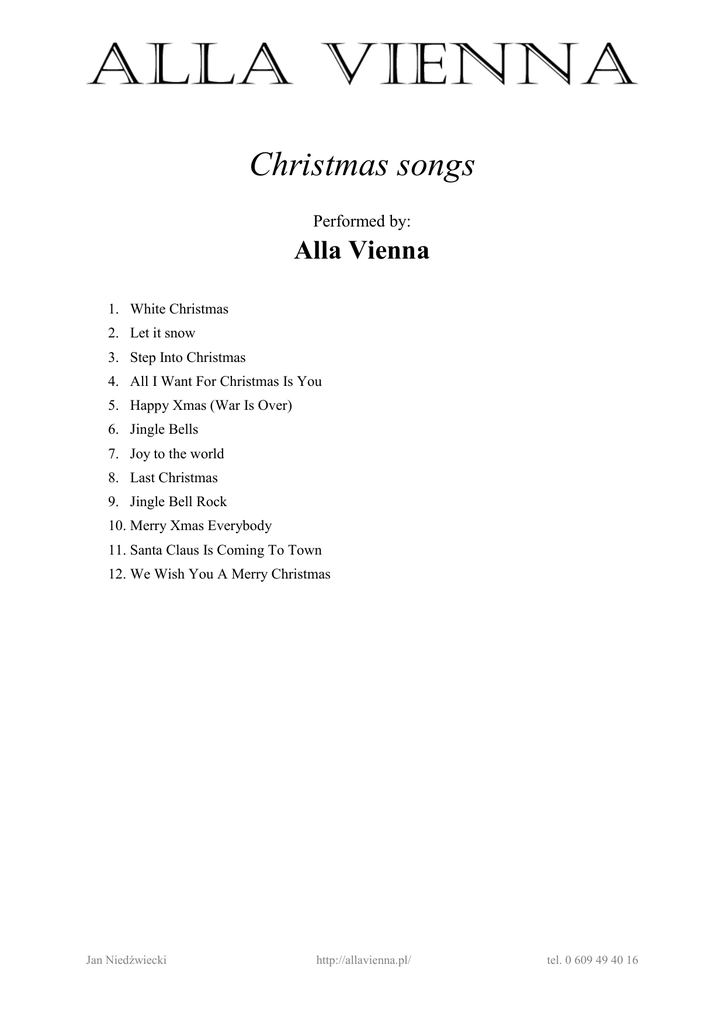 Christmas songs Performed by: Alla Vienna 1. White Christmas 2. Let it snow 3. Step Into Christmas 4. All I Want For Christmas Is You 5. Happy Xmas (War Is Over) 6. Jingle Bells 7. Joy to the world 8. Last Christmas 9. Jingle Bell Rock 10. Merry Xmas Everybody 11. Santa Claus Is Coming To Town 12. We Wish You A Merry Christmas Jan Niedźwiecki http://allavienna.pl/ tel. 0 609 49 40 16