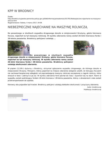 KPP W BRODNICY Źródło: http://brodnica.kujawsko-pomorska.policja.gov.pl/kb6/informacje/wiadomosci/51793,Niebezpieczne-najechanie-na-maszyne-r olnicza.html Wygenerowano: Sobota, 4 marca 2017, 04:06 NIEBEZPIECZNE NAJECHANIE NA MASZYNĘ ROLNICZĄ Do poważnego w skutkach wypadku drogowego doszło w miejscowości Drużyny, gdzie kierowca focusa, najechał na tył maszyny rolniczej. W wyniku zderzenia ranny został 26-letni kierowca forda i 28-letnia pasażerka. Brodniccy policjanci ustalają ... Do poważnego w skutkach wypadku drogowego doszło w miejscowości Drużyny, gdzie kierowca focusa, najechał na tył maszyny rolniczej. W wyniku zderzenia ranny został 26-letni kierowca forda i 28-letnia pasażerka. Brodniccy policjanci ustalają okoliczności zdarzenia. W piątek (12.09.) dyżurny z Brodnicy, otrzymał zgłoszenie wypadku drogowego, do którego doszło w miejscowości Drużyny. Policjanci, którzy pojechali na miejsce zdarzenia wstępnie ustalili, że kierujący focusem nie zachował bezpiecznej odległości od poprzedzającej maszyny rolniczej zaczepionej o ciągnik rolniczy, który skręcał w lewo i uderzył w jej tył. W wyniku zderzenia ford zjechał do rowu i wywrócił się na dach. Ranni w wypadku zostali podróżujący fordem 26-letni kierowca i 28-letnia pasażerka, którzy z obrażeniami ciała zostali przetransportowani do szpitala. Kierowcy obu pojazdów byli trzeźwi. Brodniccy policjanci ustalają dokładne okoliczności i przyczyny zdarzenia. Autor: brodnica-op Publikacja: brodnica-op Ocena: 0/5 (0) Tweetnij