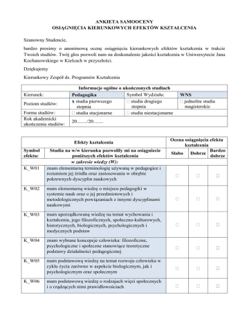 ANKIETA SAMOOCENY OSIĄGNIĘCIA KIERUNKOWYCH EFEKTÓW KSZTAŁCENIA Szanowny Studencie, bardzo prosimy o anonimową ocenę osiągnięcia kierunkowych efektów kształcenia w trakcie Twoich studiów. Twój głos pozwoli nam na doskonalenie jakości kształcenia w Uniwersytecie Jana Kochanowskiego w Kielcach w przyszłości. Dziękujemy Kierunkowy Zespół ds. Programów Kształcenia Kierunek: Poziom studiów: Forma studiów: Rok akademicki ukończenia studiów: Informacje ogólne o ukończonych studiach Symbol Wydziału: Pedagogika studia drugiego x studia pierwszego stopnia stopnia studia stacjonarne studia niestacjonarne 20......../20........ Efekty kształcenia Symbol efektu: K_W01 K_W02 K_W03 K_W04 K_W05 K_W06 WNS jednolite studia magisterskie Studia na w/w kierunku pozwoliły mi na osiągniecie poniższych efektów kształcenia w zakresie wiedzy (W): znam elementarną terminologię używaną w pedagogice i rozumiem jej źródła oraz zastosowania w obrębie pokrewnych dyscyplin naukowych Ocena osiągnięcia efektu kształcenia Bardzo Słabo Dobrze dobrze mam elementarną wiedzę o miejscu pedagogiki w systemie nauk oraz o jej przedmiotowych i metodologicznych powiązaniach z innymi dyscyplinami naukowymi mam uporządkowaną wiedzę na temat wychowania i kształcenia, jego filozoficznych, społeczno-kulturowych, historycznych, biologicznych, psychologicznych i medycznych podstaw znam wybrane koncepcje człowieka: filozoficzne, psychologiczne i społeczne stanowiące teoretyczne podstawy działalności pedagogicznej mam podstawową wiedzę na temat rozwoju człowieka w cyklu życia zarówno w aspekcie biologicznym, jak i psychologicznym oraz społecznym mam podstawową wiedzę o rodzajach więzi społecznych i o rządzących nimi prawidłowościach mam elementarną wiedzę o różnych rodzajach struktur społecznych i instytucjach życia społecznego oraz zachodzących między nimi relacjach mam elementarną wiedzę dotyczącą procesów komunikowania interpersonalnego i społecznego, ich prawidłowości i zakłóceń znam najważniejsze tradycyjne i współczesne nurty i systemy pedagogiczne, rozumiem ich historyczne i kulturowe uwarunkowania mam elementarną wiedzę o projektowaniu i prowadzeniu badań w pedagogice, a w szczególności o problemach badawczych, metodach, technikach i narzędziach badawczych; znam podstawowe tradycje paradygmatyczne badań społecznych, z których wywodzą się poszczególne metody mam podstawową wiedzę o uczestnikach działalności edukacyjnej, wychowawczej, opiekuńczej, kulturalnej i pomocowej mam elementarną wiedzę o metodyce wykonywania typowych zadań, normach, procedurach stosowanych w różnych obszarach działalności pedagogicznej mam elementarną wiedzę o bezpieczeństwie i higienie pracy w instytucjach edukacyjnych, wychowawczych, opiekuńczych, kulturalnych i pomocowych K_W18 mam elementarną wiedzę na temat projektowania ścieżki własnego rozwoju K_W19 mam uporządkowaną wiedzę na temat zasad i norm etycznych K_W07 K_W08 K_W09 K_W10 K_W11 K_W12 K_W13 K_W14 K_W15 K_W16 K_W17 znam podstawowe teorie dotyczące wychowania, uczenia się i nauczania, rozumiem różnorodne uwarunkowania tych procesów mam podstawową, uporządkowaną wiedzę o różnych środowiskach wychowawczych, ich specyfice i procesach w nich zachodzących mam elementarną, uporządkowaną wiedzę na temat różnych subdyscyplin pedagogiki, obejmującą terminologię, teorię i metodykę mam podstawową wiedzę o strukturze i funkcjach systemu edukacji; celach, podstawach prawnych, organizacji i funkcjonowaniu różnych instytucji edukacyjnych, wychowawczych, opiekuńczych, terapeutycznych, kulturalnych i pomocowych K_U01 K_U02 K_U03 K_U04 K_U05 K_U06 K_U07 K_U08 K_U09 w zakresie umiejętności (U): potrafię dokonać obserwacji i interpretacji zjawisk społecznych; analizuję ich powiązania z różnymi obszarami działalności pedagogicznej potrafię samodzielnie zdobywać wiedzę i rozwijać swoje profesjonalne umiejętności, korzystając z różnych źródeł (w języku rodzimym i obcym) i nowoczesnych technologii (ICT) posiadam elementarne umiejętności badawcze pozwalające na analizowanie przykładów badań oraz konstruowanie i prowadzenie prostych badań pedagogicznych; potrafię sformułować wnioski, opracować i zaprezentować wyniki (z wykorzystaniem ICT) oraz wskazywać kierunki dalszych badań potrafię w sposób precyzyjny i spójny wypowiadać się w mowie i na piśmie, na tematy dotyczące wybranych zagadnień pedagogicznych; z wykorzystaniem różnych ujęć teoretycznych, korzystając zarówno z dorobku pedagogiki, jak i innych dyscyplin mam rozwinięte umiejętności w zakresie komunikacji interpersonalnej, potrafię używać języka specjalistycznego i porozumiewać się w sposób precyzyjny i spójny przy użyciu różnych kanałów i technik komunikacyjnych ze specjalistami w zakresie pedagogiki, jak i z odbiorcami spoza grona specjalistów posiadam umiejętność prezentowania własnych pomysłów, wątpliwości i sugestii, popierając je argumentacją w kontekście wybranych perspektyw teoretycznych, poglądów różnych autorów potrafię ocenić przydatność typowych metod, procedur i dobrych praktyk do realizacji zadań związanych z różnymi sferami działalności pedagogicznej potrafię wykorzystywać podstawową wiedzę teoretyczną z zakresu pedagogiki oraz powiązanych z nią dyscyplin w celu analizowania i interpretowania problemów edukacyjnych, wychowawczych, opiekuńczych, kulturalnych i pomocowych, a także motywów i wzorów ludzkich zachowań potrafię posługiwać się podstawowymi ujęciami teoretycznymi w celu analizowania motywów i wzorów ludzkich zachowań, diagnozowania i prognozowania sytuacji oraz analizowania strategii działań praktycznych w odniesieniu do różnych kontekstów działalności pedagogicznej K_U10 K_U11 K_U12 K_U13 K_U14 K_K01 K_K02 K_K03 K_K04 potrafię posługiwać się podstawowymi ujęciam