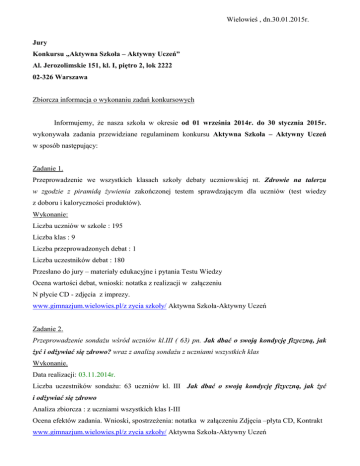 Wielowieś , dn.30.01.2015r. Jury Konkursu „Aktywna Szkoła – Aktywny Uczeń” Al. Jerozolimskie 151, kl. I, piętro 2, lok 2222 02-326 Warszawa Zbiorcza informacja o wykonaniu zadań konkursowych Informujemy, że nasza szkoła w okresie od 01 września 2014r. do 30 stycznia 2015r. wykonywała zadania przewidziane regulaminem konkursu Aktywna Szkoła – Aktywny Uczeń w sposób następujący: Zadanie 1. Przeprowadzenie we wszystkich klasach szkoły debaty uczniowskiej nt. Zdrowie na talerzu w zgodzie z piramidą żywienia zakończonej testem sprawdzającym dla uczniów (test wiedzy z doboru i kaloryczności produktów). Wykonanie: Liczba uczniów w szkole : 195 Liczba klas : 9 Liczba przeprowadzonych debat : 1 Liczba uczestników debat : 180 Przesłano do jury – materiały edukacyjne i pytania Testu Wiedzy Ocena wartości debat, wnioski: notatka z realizacji w załączeniu N płycie CD - zdjęcia z imprezy. www.gimnazjum.wielowies.pl/z zycia szkoły/ Aktywna Szkoła-Aktywny Uczeń Zadanie 2. Przeprowadzenie sondażu wśród uczniów kl.III ( 63) pn. Jak dbać o swoją kondycję fizyczną, jak żyć i odżywiać się zdrowo? wraz z analizą sondażu z uczniami wszystkich klas Wykonanie. Data realizacji: 03.11.2014r. Liczba uczestników sondażu: 63 uczniów kl. III Jak dbać o swoją kondycję fizyczną, jak żyć i odżywiać się zdrowo Analiza zbiorcza : z uczniami wszystkich klas I-III Ocena efektów zadania. Wnioski, spostrzeżenia: notatka w załączeniu Zdjęcia –płyta CD, Kontrakt www.gimnazjum.wielowies.pl/z zycia szkoły/ Aktywna Szkoła-Aktywny Uczeń Zadanie 3. Przeprowadzenie spotkania uczniów z regionalnym przedstawicielem sportu promującym zdrowy tryb życia nt. Bezpieczeństwo w sporcie oraz budowanie własnego systemu wartości poprzez osiągnięcia sportowe. Wykonanie. Liczba spotkań 1 + 1 warsztaty – realizacja w dn.23.10.2014r. W spotkaniach uczestniczyli przedstawiciele Rady Pedagogicznej , Rady Rodziców Liczba uczestników : 50 Ocena efektów zadania. Wnioski, spostrzeżeń : notatka z realizacji w załączeniu . Płyta CD- zdjęcia. www.gimnazjum.wielowies.pl/z zycia szkoły/ Aktywna Szkoła-Aktywny Uczeń Zadanie 4. Przeprowadzenie pogadanek i prac we wszystkich klasach nt. Wpływ osiągnięć technicznych XXI wieku wpływających negatywnie na rozwój i kondycję zdrowotną dzieci i młodzieży. Wykonanie: Liczba przeprowadzonych pogadanek : 9 Liczba uczestników: 187 Wnioski, ocena zadania, uwagi: Na lekcjach techniki i fizyki uczniowie wraz nauczycielami analizowali temat a następnie wykonali prace na w/w temat. Wykonanie zadania: www.gimwielowies.edupage.org Zadanie 5. Przeprowadzenie i rozstrzygniecie w dn.28.01.2015r. szkolnego konkursu na dowolne prace plastyczne z motywem przewodnim: Sposoby na ciekawy i zdrowy wypoczynek. Ocena na podstawie regulaminu ( w załączeniu). Wykonanie: Liczba prac plastycznych – wpłynęły tylko 3 prace. Wnioski, ocena zadania, uwagi: małe zainteresowanie tematyką konkursu . W załączeniu zdjęcia prac konkursowych ( na płycie CD) i regulamin konkursu. Zadanie 6. Przeprowadzenie we wszystkich klasach konwersatoriów nt. „Konsumenckie ABC” – przygotowanie gazetki informacyjnej lub wystawy szkolnej na temat: „Czy zdrowo żyje?”- w okresie X- XII2014r. Wykonanie: Liczba przeprowadzonych konwersatoriów: 9 Liczba uczestników :180 Wnioski, ocena zadania, uwagi: na godzinach wychowawczych- wybór formy zajęć należał do wychowawcy/realizatora. Były wykłady, prezentacje multimedialne, ćwiczenia praktyczne. W załączeniu: potwierdzenie przeprowadzenia zajęć w klasach ( w dziennikach lekcyjnych znajdują się odpowiednie zapisy). Płyta CD-zdjęcia, materiały z wybranych zajęć . Zadanie 7: Zorganizowanie we wszystkich klasach zajęć z wychowania fizycznego prowadzonych przez młodzież pod kierunkiem nauczycieli w-f: Mój zestaw ćwiczeń poprawiający kondycję oraz nauczenie innych ich właściwego stosowania. Wykonanie: Data przeprowadzenia zajęć: 30.11.2014 Liczba przeprowadzonych zajęć:9 klasowych i 1 ogólne dla szkoły Liczba uczestników: 190uczniów+21 nauczycieli Wnioski, ocena zadania, uwagi: notatka i spostrzeżenia w załączeniu .Płyta –zdjęcia -CD www.gimnazjum.wielowies.pl/z zycia szkoły/ Aktywna Szkoła-Aktywny Uczeń Zadanie 8 Przeprowadzenie we wszystkich klasach konwersatoriów pod hasłem: Zaburzenia stanu zdrowia i rozwoju związane z nieprawidłowym odżywianiem (anoreksja, bulimia) – jak rozpoznać chorobę i gdzie szukać pomocy? Wykonanie: Liczba konwersatoriów : 9 Liczba uczestników : 185 Opis realizacji zadania, ocena efektów, wnioski. We wszystkich klasach I i III przeprowadzono w okresie 26.01.2015-29.01.2015r. zajęcia : film „Bulimia i anoreksja” wraz z omówieniem problemu przez pedagoga szkolnego i higienistkę szkolną. Wszyscy uczniowie zostali poinformowani o miejscach pomocy, zwłaszcza podano adresy Poradni Zdrowia Psychicznego dla dzieci i młodzieży. Adresy są umieszczone na gazetce szkolnej i stronie internetowej szkoły. W załączeniu wykaz realizacji zajęć w poszczególnych klasach. Zadanie 9 Przeprowadzenie jednorazowych zajęć ruchowych z udziałem wszystkich klas pn. „Dzień ruchu w szkole -Tańczymy Zumbę” wraz z przeprowadzeniem ogólnoszkolnego testu wydolności/ sprawności fizycznej – wyłonienie zwycięzcy oraz omówienie wyników testu przez nauczycieli w-f’u. Wykonanie: Data realizacji: 30.11.2014 Liczba zajęć : 2 Liczba uczestników : 90 uczniów+ 8 pracowników szkoły( nauczyciele, pracownicy obsługi) Liczba przeprowadzonych testów : 2 Wnioski, ocena zadania, uwagi: notatka w załączeniu. Płyta CD– zdjęcia www.gimnazjum.wielowies.pl/z zycia szkoły/ Aktywna Szkoła-Aktywny Uczeń Zadanie 10 Zorganizowanie w dn.27.01.2015r. o godz.16.30 spotkania z rodzicami uczniów szkoły ( wszystkich klas) na temat „Rozwój fizyczny, psychiczny i społeczny młodzieży- potrzeby edukacji zdrowotnej „