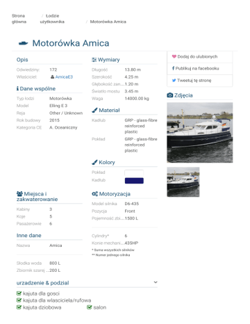 Strona główna / Łodzie użytkownika / Motorówka Amica Motorówka Amica Opis Dodaj do ulubionych Wymiary Odwiedziny: 172 Długość 13.80 m Właściciel: AmicaE3 Szerokość 4.25 m Dane wspólne Typ łodzi Motorówka Model Elling E 3 Reja Other / Unknown Rok budowy 2015 Kategoria CE A. Oceaniczny Publikuj na facebooku Tweetuj tę stronę Głębokość zan…1.20 m Światło mostu 3.45 m Waga 14000.00 kg Zdjęcia Materiał Kadłub GRP - glass-fibre reinforced plastic Pokład GRP - glass-fibre reinforced plastic Kolory Pokład Kadłub Miejsca i zakwaterowanie Motoryzacja Model silnika D6-435 Kabiny 3 Pozycja Front Koje 5 Pojemność zbi…1500 L Pasażerowie 6 Inne dane Nazwa Cylindry* Amica 6 Konie mechani…435HP * Suma wszystkich silników ** Numer jednego silnika Słodka woda 800 L Zbiornik szarej …200 L urzadzenie & podzial kajuta dla gosci kajuta dla wlasciciela/rufowa kajuta dziobowa salon wewnetrzne stanowisko manewrowe kuchnia kuchenka elektryczna kuchenka mikrofalowa z roznem lodówka lodówka gazowa wyciag oparów instrumentarium nautyczne echosonda radar samoster ploter do map radionadajnik UKF telefon pokladowy plandeki & pokrowce bimini sprayhood wyposazenie akumulator generator glówny wlacznik do akumulatora kotwica kotwica z lancuchem ladowarka do akumulatora Podkładka pompy most pompa odpompowujaca pralka przylacze ladowe 230V skrzynia kotwiczna winda kotwiczna (elektryczny) wycieraczki osprzet barek pokladowy dodatkowe wyposazenie drabinka kapielowa drzwi na poklad kapielowy na rufie dziobowy ster strumieniowy gasnica klapka wywazajaca kosz na dziobie kosz na rufie kosz na rufie z drewniana porecza luk pokladowy obicia na poduszki ze skóry ogrzewanie ogrzewanie klimatyzacja ogrzewanie przez silnik podgrzewacz wody poduszki do siedzenia na dziobie poklad kapielowy pompa zenzowa pompa zenzowa mechaniczna prysznic rufowy cieply/zimny radio reling pokladowy rufowy ster strumieniowy stól w kokpicie telewizor kolorowy urzadzenie hydrauliczne cy Go rą cy Go rą cy rą Go Go rą cy Podobne łodzie BIRMA 3 Silberfuchs Elaborat Rodina Sinning sinning Javiva