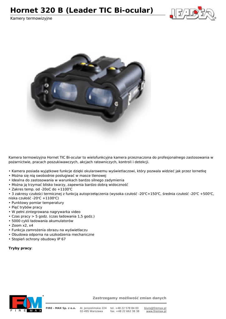 Hornet 320 B (Leader TIC Bi-ocular) Kamery termowizyjne Kamera termowizyjna Hornet TIC Bi-ocular to wielofunkcyjna kamera przeznaczona do profesjonalnego zastosowania w pożarnictwie, pracach poszukiwawczych, akcjach ratowniczych, kontroli i detekcji. • Kamera posiada wyjątkowe funkcje dzięki okularowemu wyświetlaczowi, który pozwala widzieć jak przez lornetkę • Można się nią swobodnie posługiwać w masce tlenowej • Idealna do zastosowania w warunkach bardzo silnego zadymienia • Można ją trzymać blisko twarzy, zapewnia bardzo dobrą widoczność • Zakres temp. od -20oC do +1100oC • 3 zakresy czułości termicznej z funkcją autoprzełączenia (wysoka czułość -20oC+150oC, średnia czułość -20oC +500oC, niska czułość -20oC +1100oC) • Punktowy pomiar temperatury • Pięć trybów pracy • W pełni zintegrowana nagrywarka video • Czas pracy > 5 godz. (czas ładowania 1,5 godz.) • 5000 cykli ładowania akumulatorów • Zoom x2, x4 • Funkcja zamrożenia obrazu na wyświetlaczu • Obudowa odporna na uszkodzenia mechaniczne • Stopień ochrony obudowy IP 67 Tryby pracy: Zastrzegamy możliwość zmian danych FIRE - MAX Sp. z o.o. Al. Jerozolimskie 224 02-495 Warszawa tel. +48 22 578 84 00 fax. +48 22 662 38 38 [email protected] www.firemax.pl Hornet 320 B (Leader TIC Bi-ocular) Kamery termowizyjne Tryb pełnego koloru Tryb biały = ciepło Tryb czarny = ciepło Tryb wyszukiwania ciepła Tryb wyszukiwania zimna Zastrzegamy możliwość zmian danych FIRE - MAX Sp. z o.o. Al. Jerozolimskie 224 02-495 Warszawa tel. +48 22 578 84 00 fax. +48 22 662 38 38 [email protected] www.firemax.pl Hornet 320 B (Leader TIC Bi-ocular) Kamery termowizyjne Dane techniczne Wymiary 205 x 160 x 95 mm Waga kamery gotowej do pracy ok. 1,55 kg (z akumulatorami) Wyświetlacz 3,5” LCD / 76.800 pikseli Zakres temperatury od -20°C do 1100°C Częstotliwość 60 Hz Tryby pracy 5 trybów: tryb biały = ciepło, tryb czarny = ciepło, tryb wyszukiwania ciepła, tryb wyszukiwania zimna, tryb pełnego koloru Materiał obudowy PUR / elastomer Stopień ochrony obudowy IP 67 Odporność na upadek z wysokości 2 m / beton Odporność na wysoką temperaturę 150°C / 12 min lub 260°C / 5 min Obiektyw german z powłoką węglową Zoom x2, x4 Pole widzenia 59° w poziomie, 39° w pionie, 71° diagonalnie Matryca / sensor niechłodzony mikrobolometr / aSi Rozdzielczość 384 x 288 Zakres widma 8 - 14 µm Czułość termiczna 0,06 - 0,08°C Gotowość do pracy - czas uruchomienia ok. 2 s Zasilanie 2 akumulatory LiFePo4, z możliwością ładowania Czas pracy w temp. +20°C >5h Czas ładowania akumulatorów ok. 1,5 h w stacji dokującej lub za pomocą ładowarki sieciowej Ilość cykli ładowania akumulatorów >5000 Napięcie ładowania 230 V AC lub 12 / 24 V DC GWARANCJA 5 lat na kamerę 6 lat na akumulatory 10 lat na matrycę / sensor Akcesoria standardowe ładowarka sieciowa 230 V AC, standardowa walizka transportowa, pasek do zawieszenia na szyi, akumulatory LiFePo4 (2 szt.) Akcesoria opcjonalne linka samozwijająca, ładowarka samochodowa (stacja dokująca) 12 / 24 V DC, udaroodporna walizka transportowa, system transmisji bezprzewodowej Zastrzegamy możliwość zmian danych FIRE - MAX Sp. z o.o. Al. Jerozolimskie 224 02-495 Warszawa tel. +48 22 578 84 00 fax. +48 22 662 38 38 [email protected] www.firemax.pl
