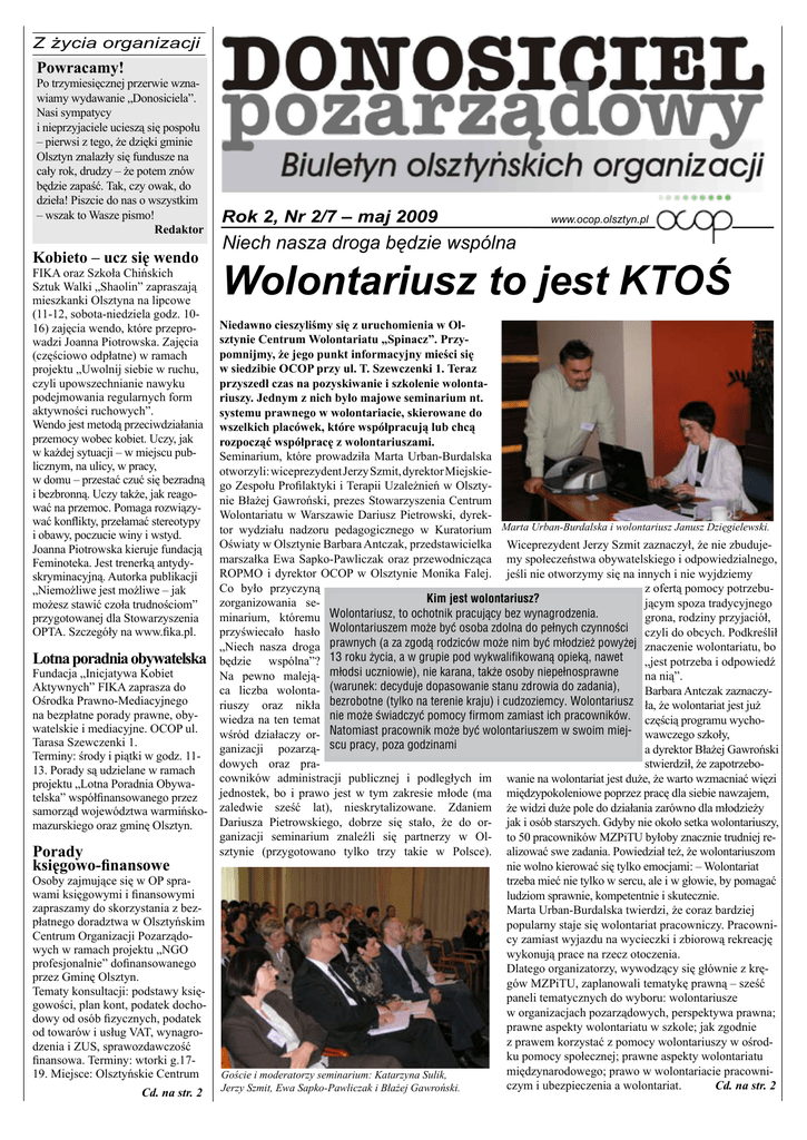 Z życia organizacji Powracamy! Po trzymiesięcznej przerwie wznawiamy wydawanie „Donosiciela”. Nasi sympatycy i nieprzyjaciele ucieszą się pospołu – pierwsi z tego, że dzięki gminie Olsztyn znalazły się fundusze na cały rok, drudzy – że potem znów będzie zapaść. Tak, czy owak, do dzieła! Piszcie do nas o wszystkim – wszak to Wasze pismo! Redaktor Kobieto – ucz się wendo FIKA oraz Szkoła Chińskich Sztuk Walki „Shaolin” zapraszają mieszkanki Olsztyna na lipcowe (11-12, sobota-niedziela godz. 1016) zajęcia wendo, które przeprowadzi Joanna Piotrowska. Zajęcia (częściowo odpłatne) w ramach projektu „Uwolnij siebie w ruchu, czyli upowszechnianie nawyku podejmowania regularnych form aktywności ruchowych”. Wendo jest metodą przeciwdziałania przemocy wobec kobiet. Uczy, jak w każdej sytuacji – w miejscu publicznym, na ulicy, w pracy, w domu – przestać czuć się bezradną i bezbronną. Uczy także, jak reagować na przemoc. Pomaga rozwiązywać konflikty, przełamać stereotypy i obawy, poczucie winy i wstyd. Joanna Piotrowska kieruje fundacją Feminoteka. Jest trenerką antydyskryminacyjną. Autorka publikacji „Niemożliwe jest możliwe – jak możesz stawić czoła trudnościom” przygotowanej dla Stowarzyszenia OPTA. Szczegóły na www.fika.pl. Rok 2, Nr 2/7 – maj 2009 www.ocop.olsztyn.pl Niech nasza droga będzie wspólna Wolontariusz to jest KTOŚ Niedawno cieszyliśmy się z uruchomienia w Olsztynie Centrum Wolontariatu „Spinacz”. Przypomnijmy, że jego punkt informacyjny mieści się w siedzibie OCOP przy ul. T. Szewczenki 1. Teraz przyszedł czas na pozyskiwanie i szkolenie wolontariuszy. Jednym z nich było majowe seminarium nt. systemu prawnego w wolontariacie, skierowane do wszelkich placówek, które współpracują lub chcą rozpocząć współpracę z wolontariuszami. Seminarium, które prowadziła Marta Urban-Burdalska otworzyli: wiceprezydent Jerzy Szmit, dyrektor Miejskiego Zespołu Profilaktyki i Terapii Uzależnień w Olsztynie Błażej Gawroński, prezes Stowarzyszenia Centrum Wolontariatu w Warszawie Dariusz Pietrowski, dyrektor wydziału nadzoru pedagogicznego w Kuratorium Marta Urban-Burdalska i wolontariusz Janusz Dzięgielewski. Oświaty w Olsztynie Barbara Antczak, przedstawicielka Wiceprezydent Jerzy Szmit zaznaczył, że nie zbudujemarszałka Ewa Sapko-Pawliczak oraz przewodnicząca my społeczeństwa obywatelskiego i odpowiedzialnego, ROPMO i dyrektor OCOP w Olsztynie Monika Falej. jeśli nie otworzymy się na innych i nie wyjdziemy Co było przyczyną z ofertą pomocy potrzebuKim jest wolontariusz? zorganizowania sejącym spoza tradycyjnego minarium, któremu Wolontariusz, to ochotnik pracujący bez wynagrodzenia. grona, rodziny przyjaciół, przyświecało hasło Wolontariuszem może być osoba zdolna do pełnych czynności czyli do obcych. Podkreślił „Niech nasza droga prawnych (a za zgodą rodziców może nim być młodzież powyżej znaczenie wolontariatu, bo Lotna poradnia obywatelska będzie wspólna”? 13 roku życia, a w grupie pod wykwalifikowaną opieką, nawet „jest potrzeba i odpowiedź Fundacja „Inicjatywa Kobiet Na pewno maleją- młodsi uczniowie), nie karana, także osoby niepełnosprawne na nią”. Aktywnych” FIKA zaprasza do ca liczba wolonta- (warunek: decyduje dopasowanie stanu zdrowia do zadania), Barbara Antczak zaznaczyOśrodka Prawno-Mediacyjnego riuszy oraz nikła bezrobotne (tylko na terenie kraju) i cudzoziemcy. Wolontariusz ła, że wolontariat jest już na bezpłatne porady prawne, obywiedza na ten temat nie może świadczyć pomocy firmom zamiast ich pracowników. częścią programu wychowatelskie i mediacyjne. OCOP ul. wśród działaczy or- Natomiast pracownik może być wolontariuszem w swoim miej- wawczego szkoły, Tarasa Szewczenki 1. ganizacji pozarzą- scu pracy, poza godzinami a dyrektor Błażej Gawroński Terminy: środy i piątki w godz. 11dowych oraz prastwierdził, że zapotrzebo13. Porady są udzielane w ramach cowników administracji publicznej i podległych im wanie na wolontariat jest duże, że warto wzmacniać więzi projektu „Lotna Poradnia Obywajednostek, bo i prawo jest w tym zakresie młode (ma międzypokoleniowe poprzez pracę dla siebie nawzajem, telska” współfinansowanego przez samorząd województwa warmińsko- zaledwie sześć lat), nieskrytalizowane. Zdaniem że widzi duże pole do działania zarówno dla młodzieży Dariusza Pietrowskiego, dobrze się stało, że do or- jak i osób starszych. Gdyby nie około setka wolontariuszy, mazurskiego oraz gminę Olsztyn. ganizacji seminarium znaleźli się partnerzy w Ol- to 50 pracowników MZPiTU byłoby znacznie trudniej resztynie (przygotowano tylko trzy takie w Polsce). alizować swe zadania. Powiedział też, że wolontariuszom Porady nie wolno kierować się tylko emocjami: – Wolontariat księgowo-finansowe Osoby zajmujące się w OP spratrzeba mieć nie tylko w sercu, ale i w głowie, by pomagać wami księgowymi i finansowymi ludziom sprawnie, kompetentnie i skutecznie. zapraszamy do skorzystania z bezMarta Urban-Burdalska twierdzi, że coraz bardziej płatnego doradztwa w Olsztyńskim popularny staje się wolontariat pracowniczy. PracowniCentrum Organizacji Pozarządocy zamiast wyjazdu na wycieczki i zbiorową rekreację wych w ramach projektu „NGO wykonują prace na rzecz otoczenia. profesjonalnie” dofinansowanego Dlatego organizatorzy, wywodzący się głównie z kręprzez Gminę Olsztyn. gów MZPiTU, zaplanowali tematykę prawną – sześć Tematy konsultacji: podstawy księpaneli tematycznych do wyboru: wolontariusze gowości, plan kont, podatek dochow organizacjach pozarządowych, perspektywa prawna; dowy od osób fizycznych, podatek prawne aspekty wolontariatu w szkole; jak zgodnie od towarów i usług VAT, wynagroz prawem korzystać z pomocy wolontariuszy w ośroddzenia i ZUS, sprawozdawczość ku pomocy społecznej; prawne aspekty wolontariatu finansowa. Terminy