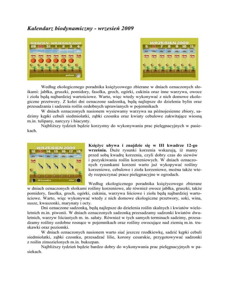 Kalendarz biodynamiczny - wrzesień 2009 Według ekologicznego poradnika księŜycowego zbierane w dniach oznaczonych słoikami: jabłka, gruszki, pomidory, fasolka, groch, ogórki, cukinia oraz inne warzywa, owoce i zioła będą najbardziej wartościowe. Warto, więc wtedy wykonywać z nich domowe ekologiczne przetwory. Z kolei dni oznaczone sadzonką, będą najlepsze do dzielenia bylin oraz przesadzania i sadzenia roślin ozdobnych uprawianych w pojemnikach W dniach oznaczonych nasionem wysiewamy warzywa na późnojesienne zbiory, sadzimy kępki cebuli siedmiolatki, ząbki czosnku oraz kwiaty cebulowe zakwitające wiosną m.in. tulipany, narcyzy i hiacynty. NajbliŜszy tydzień będzie korzystny do wykonywania prac pielęgnacyjnych w pasiekach. KsięŜyc ubywa i znajdzie się w III kwadrze 12-go września. DuŜe rysunki korzenia wskazują, iŜ mamy przed sobą kwadrę korzenia, czyli dobry czas do siewów i pozyskiwania roślin korzeniowych. W dniach oznaczonych rysunkami korzeni warto juŜ wykopywać rośliny korzeniowe, cebulowe i zioła korzeniowe, moŜna takŜe wtedy rozpoczynać prace pielęgnacyjne w ogrodach. Według ekologicznego poradnika księŜycowego zbierane w dniach oznaczonych słoikami rośliny korzeniowe, ale równieŜ owoce jabłka, gruszki, takŜe pomidory, fasolka, groch, ogórki, cukinia, warzywa liściowe i zioła będą najbardziej wartościowe. Warto, więc wykonywać wtedy z nich domowe ekologiczne przetwory, soki, wina, susze, kwaszonki, marynaty i octy. Dni oznaczone sadzonką, będą najlepsze do dzielenia roślin skalnych i kwiatów wieloletnich m.in. piwonii. W dniach oznaczonych sadzonką przesadzamy sadzonki kwiatów dwuletnich, warzyw liściastych m. in. sałaty. RównieŜ w tych samych terminach sadzimy, przesadzamy rośliny ozdobne rosnące w pojemnikach oraz rośliny owocujące nad ziemią m.in. truskawki oraz poziomki. W dniach oznaczonych nasionem warto siać jeszcze rzodkiewkę, sadzić kępki cebuli siedmiolatki, ząbki czosnku, przesadzać lilie, korony cesarskie, przygotowywać sadzonki z roślin zimozielonych m.in. bukszpan. NajbliŜszy tydzień będzie bardzo dobry do wykonywania prac pielęgnacyjnych w pasiekach. KsięŜyc w najbliŜszym tygodniu przybywa i znajdzie się w I kwadrze 26-go września. DuŜe rysunki liścia wskazują, iŜ mamy przed sobą najkorzystniejszy czas do siewów, zbiorów, przesadzania roślin wydających plony nad ziemią, zwłaszcza liściowych. W ekologicznym poradniku księŜycowym dni z rysunkami nasion i sadzonek są najkorzystniejsze do siewów poplonów m.in. szpinaku, zimowej sałaty, wysiewania roślin na zielony nawóz lub zimowe okrycie gleby m.in. Ŝyta. Warto teŜ wtedy wysiewać zioła oraz nasiona drzew, takŜe przesadzać dziczki do późniejszych szczepień. Warto równieŜ zbierać nasiona kwiatów i ziół. W najbliŜszym tygodniu warto kosić ostatni raz trawniki. W dniach z rysunkami sadzonek najlepiej przesadzać iglaki, wrzosy, rododendrony, ostrokrzewy i zaraz po nasadzeniu podlać. Wtedy równieŜ przesadzać i sadzić krzewy owocowe. Przed wsadzeniem do dołka korzenie maczać w papce z gliny i krowieńca. Taki zabieg ułatwi przyjęcie roślin i zapewni im następnej wiosny lepszy wzrost. Kończymy zbierać ogórki, cukinię, fasolkę szparagową, pozyskujemy teŜ nadal warzywa liściowe oraz owoce i wykonujemy z nich domowe ekologiczne przetwory m.in. smaŜymy powidła i kwasimy, najlepiej w dniach z rysunkami słoików. KsięŜyc w najbliŜszym tygodniu przybywa. W I kwadrze znajdzie się 26-go września. Rysunki owocu wskazują, iŜ mamy przed sobą kwadrę owocu, co oznacza, Ŝe dni po 26-tym września są najkorzystniejsze do wszelkich siewów, sadzenia, przesadzania, zbioru roślin wydających owoce nad ziemią. W ekologicznym kalendarzu księŜycowym dni z rysunkami nasion i sadzonek są jeszcze korzystne do ostatnich siewów roślin na zielone nawoŜenie m. in. Ŝyta, wyki ozimej lub specjalnych mieszanek. Warto teŜ wtedy wysiewać zioła oraz nasiona drzew, takŜe przesadzać dziczki do późniejszych szczepień. Wysiewamy równieŜ w dniach oznaczonych nasionami zimowe odmiany szpinaku, rozsadzamy sałatę zimową . Dni z rysunkami sadzonek będą najlepsze do sadzenia, przesadzania liściastych krzewów ozdobnych m.in. róŜ, berberysów oraz drzewek i krzewów owocowych. Przed wsadzeniem do dołka korzeni maczać je w papce z gliny i krowieńca, albo tylko w papce z gliny. Wtedy teŜ przesadzamy rośliny zimo-zielone np. iglaki, takŜe wrzosy. MoŜna teŜ w tych dniach sadzić jeszcze ozdobne rośliny cebulowe, tulipany, narcyzy, szafirki, takŜe ząbki czosnku. Dni z rysunkami owoców i słoików są korzystne do zbiorów: jabłek, gruszek oraz kapusty i wykonywania z nich przetworów. Jest to równieŜ dobry czas do zbiorów dziko rosnących owoców leśnych, dzielenia roślin skalnych i zbyt krzaczastych ziół przyprawowych m,in. lubczyku, estragonu.