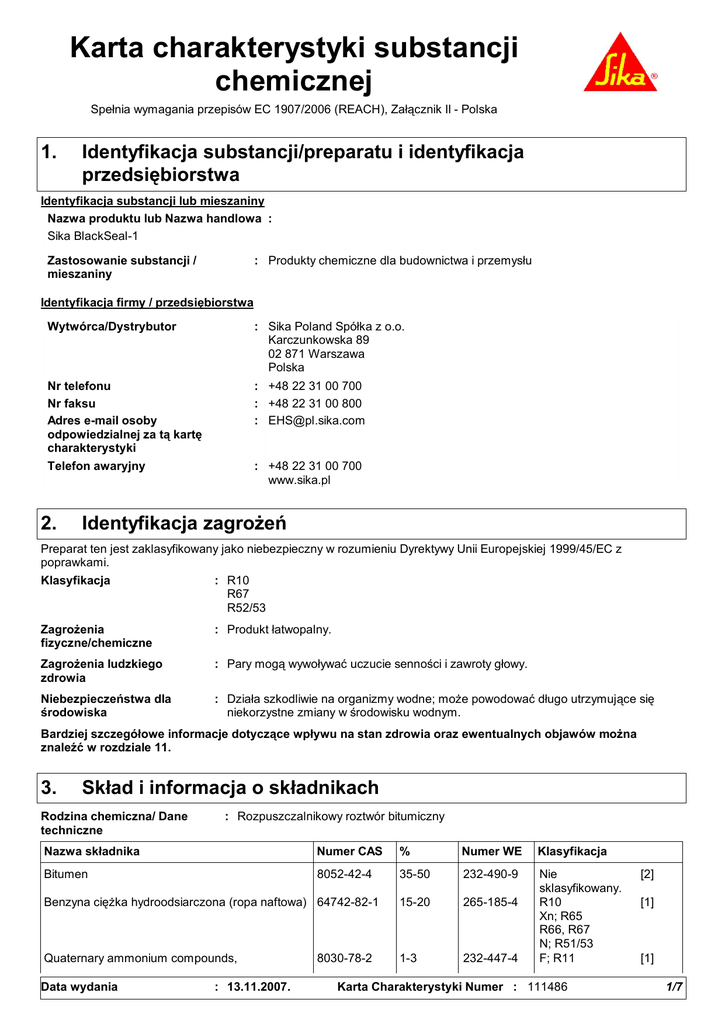 Karta charakterystyki substancji chemicznej Spełnia wymagania przepisów EC 1907/2006 (REACH), Załącznik II - Polska 1. Identyfikacja substancji/preparatu i identyfikacja przedsiębiorstwa Identyfikacja substancji lub mieszaniny Nazwa produktu lub Nazwa handlowa : Sika BlackSeal-1 Zastosowanie substancji / mieszaniny : Produkty chemiczne dla budownictwa i przemysłu Identyfikacja firmy / przedsiębiorstwa Wytwórca/Dystrybutor : Sika Poland Spółka z o.o. Karczunkowska 89 02 871 Warszawa Polska Nr telefonu Nr faksu Adres e-mail osoby odpowiedzialnej za tą kartę charakterystyki : +48 22 31 00 700 : +48 22 31 00 800 : [email protected] Telefon awaryjny : +48 22 31 00 700 www.sika.pl 2. Identyfikacja zagrożeń Preparat ten jest zaklasyfikowany jako niebezpieczny w rozumieniu Dyrektywy Unii Europejskiej 1999/45/EC z poprawkami. Klasyfikacja : R10 R67 R52/53 Zagrożenia fizyczne/chemiczne : Produkt łatwopalny. Zagrożenia ludzkiego zdrowia : Pary mogą wywoływać uczucie senności i zawroty głowy. Niebezpieczeństwa dla środowiska : Działa szkodliwie na organizmy wodne; może powodować długo utrzymujące się niekorzystne zmiany w środowisku wodnym. Bardziej szczegółowe informacje dotyczące wpływu na stan zdrowia oraz ewentualnych objawów można znaleźć w rozdziale 11. 3. Skład i informacja o składnikach Rodzina chemiczna/ Dane techniczne : Rozpuszczalnikowy roztwór bitumiczny Nazwa składnika Numer CAS % Numer WE Klasyfikacja Bitumen 8052-42-4 35-50 232-490-9 Benzyna ciężka hydroodsiarczona (ropa naftowa) 64742-82-1 15-20 265-185-4 Quaternary ammonium compounds, 1-3 232-447-4 Nie sklasyfikowany. R10 Xn; R65 R66, R67 N; R51/53 F; R11 Data wydania : 13.11.2007. 8030-78-2 Karta Charakterystyki Numer : 111486 [2] [1] [1] 1/7 Sika BlackSeal-1 3. 13.11.2007 2/7 Skład i informacja o składnikach trimethyltallow alkyl, chlori des Xn; R22 C; R34 Patrz Sekcja 16 - pełny tekst zadeklarowanych wyżej Fraz-R [1] Substancja sklasyfikowana jako szkodliwa dla zdrowia lub środowiska [2] Substancja, dla której wyznaczono dpouszczalne stężenie w środowisku pracy Najwyższe dopuszczalne stężenia, jeśli są dostępne, wymienione są wymienione w części 8. 4. Pierwsza pomoc Pierwsza pomoc Wdychanie Spożycie Kontakt ze skórą Kontakt z okiem Informacje dla lekarza : Jeśli podejrzewa się, że opary wciąż są obecne ratownik powinien załozyć właściwą maskę lub oddechowy aparat izolacyjny. Należy wezwać pomoc medyczną w przypadku dalszego występowania objawów lub w przypadku ich nasilania się. Jeśli pojawią się objawy, należy skorzystać z pomocy lekarskiej. : Nie wywoływać wymiotów, jeśli nie jest to zalecane przez personel medyczny. Zapewnić otwartą wentylację. Należy natychmiast zwrócić się po pomoc lekarską. : Spłukać skażoną skórę dużą ilością wody. Zdjąć skażoną odzież i buty. Jeśli pojawią się objawy, zasięgnąć porady lekarskiej. : Natychmiast przepłukać oczy dużą ilością wody, od czasu do czasu podnosząc górna i dolna powiekę. Usunąć szkła kontaktowe jeżeli są. Należy kontynuować płukanie przez co najmniej 10 minut. Zasięgnąć porady medycznej. : Bez specjalnego leczenia. Leczyć objawowo. W przypadku połknięcia lub wdychania dużej ilości, natychmiast skontaktować się z lekarzem specjalizującym się w leczeniu zatruć truciznami. Bardziej szczegółowe informacje dotyczące wpływu na stan zdrowia oraz ewentualnych objawów można znaleźć w rozdziale 11. 5. Postępowanie w przypadku pożaru Środki gaśnicze Odpowiednie Nieodpowiednie Szczególne ryzyko narażenia Niebezpieczne produkty spalania Specjalne wyposażenie ochronne dla strażaków 6. : Używać suchych środków chemicznych, CO2, zraszania wodą lub piany. : Nie używać strumienia wody. : Łatwopalna ciecz. W ogniu oraz w razie ogrzania dochodzi do wzrostu ciśnienia i pojemnik może pęknąć, co stwarza ryzyko eksplozji. Wyciek do kanalizacji może spowodować pożar lub niebezpieczeństwo wybuchu. : Brak konkretych danych. : Strażacy powinni nosić odpowiednie urządzenia ochronne oraz indywidualne aparaty oddechowe (SCBA) z maska zakrywającą całą twarz działająca przy dodatnim ciśnieniu. Postępowanie w przypadku niezamierzonego uwolnienia do środowiska Osobiste środki ostrożności : Nie udzielać zezwolenia na wejście - niepotrzebnemu i nie zabezpieczonemu personelowi. Nie dotykać, ani nie przechodzić, po rozlanym materiale. Wyłączyć wszystkie źródła zapłonu. Wzniecanie ognia i iskier, rozbłysków i palenie tytoniu na niebezpiecznym terenie jest zabronione. Nosić właściwe wyposażenie ochrony osobistej (patrz część 8). Ewakuować ludzi z okolicznych terenów. Zabezpieczenia środowiskowe : Należy unikać rozprzestrzeniania się rozlanego materiału jego spływania do gleby lub kontaktu z glebą, ciekami wodnymi, drenami i kanalizacją. Należy poinformować odpowiednie władze, w przypadku kiedy produkt spowodował zanieczyszczenie środowiska (ścieków, cieków wodnych, gleby lub powietrza). Materiał zanieczyszczający wodę. Data wydania : 13.11.2007. Karta Charakterystyki Numer : 111486 2/7 Sika BlackSeal-1 6. 13.11.2007 3/7 Postępowanie w przypadku niezamierzonego uwolnienia do środowiska Duże rozlanie : Zatrzymać wyciek, jeśli jest to możliwe bez narażenia na niebezpieczeństwo. Wynieść pojemniki z obszaru rozlania. Zabezpieczyć ujścia kanalizacji, instalacji wodnych oraz wejścia do piwnic i obszarów zamkniętych. Należy zmyć rozlany/rozsypany materiał do oczyszczalni ścieków lub postępować w następujący sposób. Rozlane lub rozsypane substancje, należy zebrać za pomocą niepalnych substancji, takich jak: piasek, ziemia, wermikulit, ziemia okrzemkowa. Następnie umieścić w pojemnikach i utylizować zgodnie z miejscowymi przepisami (patrz sekcja 13). Należy używać narzędzi nie wytwarzających iskier oraz wyposażenia zapobiegającego wybuchom. Małe rozlanie