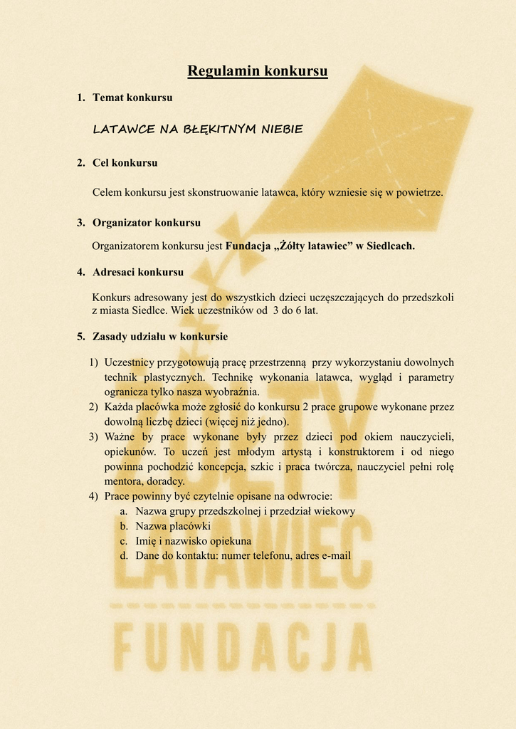 Regulamin konkursu 1. Temat konkursu LATAWCE NA BŁĘKITNYM NIEBIE 2. Cel konkursu Celem konkursu jest skonstruowanie latawca, który wzniesie się w powietrze. 3. Organizator konkursu Organizatorem konkursu jest Fundacja „Żółty latawiec” w Siedlcach. 4. Adresaci konkursu Konkurs adresowany jest do wszystkich dzieci uczęszczających do przedszkoli z miasta Siedlce. Wiek uczestników od 3 do 6 lat. 5. Zasady udziału w konkursie 1) Uczestnicy przygotowują pracę przestrzenną przy wykorzystaniu dowolnych technik plastycznych. Technikę wykonania latawca, wygląd i parametry ogranicza tylko nasza wyobraźnia. 2) Każda placówka może zgłosić do konkursu 2 prace grupowe wykonane przez dowolną liczbę dzieci (więcej niż jedno). 3) Ważne by prace wykonane były przez dzieci pod okiem nauczycieli, opiekunów. To uczeń jest młodym artystą i konstruktorem i od niego powinna pochodzić koncepcja, szkic i praca twórcza, nauczyciel pełni rolę mentora, doradcy. 4) Prace powinny być czytelnie opisane na odwrocie: a. Nazwa grupy przedszkolnej i przedział wiekowy b. Nazwa placówki c. Imię i nazwisko opiekuna d. Dane do kontaktu: numer telefonu, adres e-mail 6. Składanie prac Termin przyjmowania prac konkursowych upływa 29.04.2016 roku. Prace konkursowe wraz z formularzem zgłoszeniowym należy dostarczyć pod adres: Fundacja „Żółty Latawiec” Ul. Warszawska 133 08-110 Siedlce 7. Ogłoszenie wyników konkursu Ogłoszenie wyników nastąpi na stronie internetowej organizatorów konkursu www.zoltylatawiec.pl, profilu Facebook, a także zostanie rozesłane mailem do uczestniczących w konkursie placówek. Komisja powołana przez organizatorów konkursu wyłoni zwycięzców najpóźniej do dnia 31.05.2016 roku. 8. Organizator przewiduje: a. Atrakcyjne nagrody dla placówek za trzy pierwsze miejsca oraz specjalną nagrodę pocieszenia. b. Wszyscy uczestnicy konkursu otrzymają dyplomy lub podziękowania za udział w konkursie. c. Zwycięzcy konkursu oraz uczestnicy zostaną zaproszeni na uroczyste wręczenie nagród, które zwieńczy błękitne niebo pełne latawców, przygotowanych na konkurs przez uczniów, czyli wspólne puszczanie latawców ! 9. Postanowienia końcowe a. Udział w konkursie jest jednoznaczny z wyrażeniem zgody na przetwarzanie danych osobowych przez Organizatora na potrzeby konkursu. b. Dostarczone na konkurs prace, przechodzą na własność organizatorów. c. Organizatorzy zastrzegają sobie prawo do nieodpłatnego reprodukowania prac konkursowych w celach reklamowych. d. Biorąc udział w konkursie uczestnik potwierdza, że wyraża zgodę na wszystkie zasady zawarte w Regulaminie. e. Regulamin może być w każdej chwili zmieniony przez Organizatora . f. Wszelkie pytania prosimy kierować pod numer telefonu 790 342 300