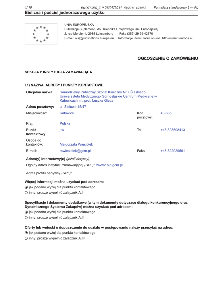 Bielizna i pościel jednorazowego użytku OGŁOSZENIE O