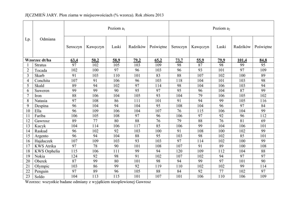 JĘCZMIEŃ JARY. Plon ziarna w miejscowościach (% wzorca). Rok zbioru 2013 Poziom a1 Lp. Poziom a2 Odmiana Seroczyn Kawęczyn Laski Radzików Poświętne Wzorzec dt/ha 63,4 50,2 58,9 79,2 1 Stratus 97 102 105 103 2 Tocada 102 100 97 96 3 Skarb 91 103 110 101 4 Conchita 107 91 106 96 5 Skald 89 94 102 97 6 Suweren 99 99 90 95 7 Iron 88 106 104 105 8 Natasia 97 108 86 111 9 Despina 96 104 94 104 10 Ella 96 109 106 104 11 Fariba 106 105 108 97 12 Gawrosz 89 77 80 88 13 Kucyk 104 114 106 117 14 Raskud 96 102 92 103 15 Argento 96 94 104 88 16 Hajduczek 107 109 103 93 17 KWS Atrika 97 78 90 101 18 KWS Orphelia 115 106 111 99 19 Nokia 124 92 98 91 20 Oberek 87 99 80 101 21 Olympic 103 86 99 92 22 Penguin 97 89 96 105 23 Soldo 104 113 115 101 Wzorzec: wszystkie badane odmiany z wyjątkiem nieoplewionej Gawrosz 65,2 109 103 83 103 114 97 93 101 95 107 96 76 85 100 95 103 108 94 102 98 119 88 107 Seroczyn Kawęczyn Laski 73,7 98 96 88 118 98 95 104 91 108 76 106 79 106 91 103 97 107 120 107 94 110 84 101 55,9 87 93 107 104 104 96 79 94 104 115 97 88 99 108 98 114 91 109 102 99 102 92 106 79,9 98 101 102 101 106 104 106 99 96 106 92 76 104 100 102 102 89 112 94 97 102 77 110 Radzików Poświętne 101,4 99 97 100 103 103 87 105 105 97 104 96 81 106 102 85 100 100 104 97 101 99 102 106 84,8 95 109 89 98 94 99 102 116 84 99 112 69 101 99 101 99 108 88 97 90 114 97 109 JĘCZMIEŃ JARY. Plon ziarna odmian (%wzorca). Lata zbioru: 2013, 2012, 2011 Lp. Odmiana Wzorzec dt/ha 1 Stratus 2 Tocada 3 Skarb 4 Conchita 5 Skald 6 Suweren 7 Iron 8 Natasia 9 Despina 10 Ella 11 Fariba 12 Gawrosz 13 Kucyk 14 Raskud 15 Argento 16 Hajduczek 17 KWS Atrika 18 KWS Orphelia 19 Nokia 20 Oberek 21 Olympic 22 Penguin 23 Soldo Liczba doświadczeń Wartość browarna (skala 90) 4,15 6,70 8,25 6,80 6,55 6,55 Poziom a1 2013 2012 2011 63,4 103 100 97 100 99 96 99 101 99 104 102 83 105 99 95 102 96 104 101 93 100 96 108 5 66,5 99 100 101 100 101 101 103 104 101 100 100 79 101 100 5 61,2 103 103 104 99 100 99 103 100 4 Poziom a2 20122013 65,0 101 100 99 100 100 98 101 102 100 102 101 81 103 99 10 Wzorzec: wszystkie badane odmiany z wyjątkiem nieoplewionej Gawrosz 20112013 63,7 102 101 101 100 100 98 102 102 14 2013 2012 2011 79,1 96 100 97 105 101 96 101 102 97 99 101 78 104 100 97 102 100 106 99 96 105 91 107 5 76,4 103 103 98 100 100 101 103 105 103 103 104 83 101 100 5 69,1 99 105 101 108 105 100 104 101 4 20122013 77,8 99 101 97 102 101 98 102 104 100 101 103 81 102 100 10 20112013 74,9 99 102 99 104 102 99 102 103 14