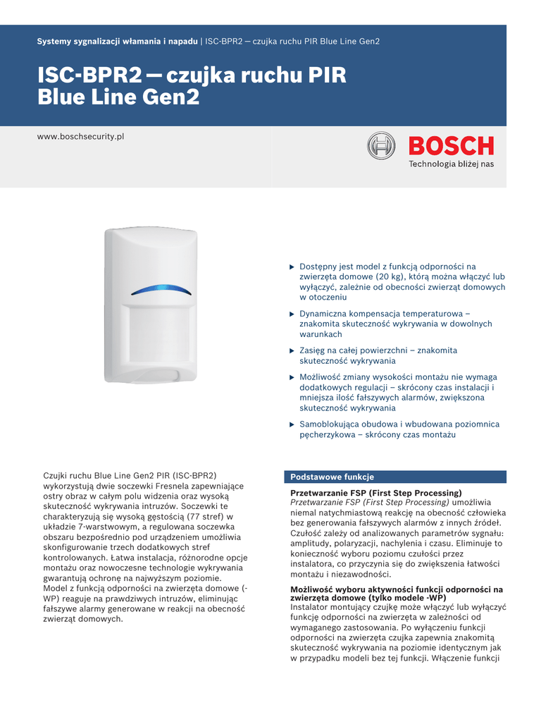 Systemy sygnalizacji włamania i napadu | ISC-BPR2 — czujka ruchu PIR Blue Line Gen2 ISC-BPR2 — czujka ruchu PIR Blue Line Gen2 www.boschsecurity.pl Czujki ruchu Blue Line Gen2 PIR (ISC-BPR2) wykorzystują dwie soczewki Fresnela zapewniające ostry obraz w całym polu widzenia oraz wysoką skuteczność wykrywania intruzów. Soczewki te charakteryzują się wysoką gęstością (77 stref) w układzie 7-warstwowym, a regulowana soczewka obszaru bezpośrednio pod urządzeniem umożliwia skonfigurowanie trzech dodatkowych stref kontrolowanych. Łatwa instalacja, różnorodne opcje montażu oraz nowoczesne technologie wykrywania gwarantują ochronę na najwyższym poziomie. Model z funkcją odporności na zwierzęta domowe (WP) reaguje na prawdziwych intruzów, eliminując fałszywe alarmy generowane w reakcji na obecność zwierząt domowych. u Dostępny jest model z funkcją odporności na zwierzęta domowe (20 kg), którą można włączyć lub wyłączyć, zależnie od obecności zwierząt domowych w otoczeniu u Dynamiczna kompensacja temperaturowa – znakomita skuteczność wykrywania w dowolnych warunkach u Zasięg na całej powierzchni – znakomita skuteczność wykrywania u Możliwość zmiany wysokości montażu nie wymaga dodatkowych regulacji – skrócony czas instalacji i mniejsza ilość fałszywych alarmów, zwiększona skuteczność wykrywania u Samoblokująca obudowa i wbudowana poziomnica pęcherzykowa – skrócony czas montażu Podstawowe funkcje Przetwarzanie FSP (First Step Processing) Przetwarzanie FSP (First Step Processing) umożliwia niemal natychmiastową reakcję na obecność człowieka bez generowania fałszywych alarmów z innych źródeł. Czułość zależy od analizowanych parametrów sygnału: amplitudy, polaryzacji, nachylenia i czasu. Eliminuje to konieczność wyboru poziomu czułości przez instalatora, co przyczynia się do zwiększenia łatwości montażu i niezawodności. Możliwość wyboru aktywności funkcji odporności na zwierzęta domowe (tylko modele ‑WP) Instalator montujący czujkę może włączyć lub wyłączyć funkcję odporności na zwierzęta w zależności od wymaganego zastosowania. Po wyłączeniu funkcji odporności na zwierzęta czujka zapewnia znakomitą skuteczność wykrywania na poziomie identycznym jak w przypadku modeli bez tej funkcji. Włączenie funkcji 2 | ISC-BPR2 — czujka ruchu PIR Blue Line Gen2 odporności na zwierzęta umożliwia odróżnianie sygnałów wywoływanych przez ludzi od sygnałów wywoływanych przez zwierzęta domowe. Urządzenie ignoruje sygnały wywołane przez jedno lub dwa zwierzęta domowe o wadze do 20 kg lub większą liczbę gryzoni. Dynamiczna kompensacja temperaturowa Czujka samodzielnie dostosowuje swoją czułość, dzięki czemu może identyfikować intruzów przy praktycznie dowolnych temperaturach. Zasięg na całej powierzchni Udoskonalone parametry monitorowania strefy bezpośrednio pod urządzeniem oraz obszaru monitorowania rzędu 12 m x 12 m pozwoliły na uzyskanie zasięgu na całej powierzchni. Samoblokująca obudowa Rozsuwana, samoblokująca obudowa zawiera zintegrowaną poziomnicę pęcherzykową oraz specjalną, dopasowaną i wyjmowaną listwę zaciskową, co ułatwia montaż. Region Certyfikacja Stany Zjednoczone UL cULs - ANSR: Intrusion-detection Units (UL 639), ANSR7: Intrusion-detection Units Certified for Canada (ULC-S306) [-W12 i -WP12] Francja AFNOR 2620200001A0 [-W12] AFNOR 2620200001B0 [-WP12] Chiny CCC 2010031901000322 [-CHI] Szwecja INTYG 11-268 [-WP12] INTYG 11-269 [-W12] Holandia NCP 2011062 [ISC-BPR2-w12, -WP12, ISCBPQ2-W12, ISC-BDL2-W12G, ISCBDL2-WP12G, ISC-BDL2-WP6G]] Bułgaria GD FSPP GODKJENNELSESBEVIS [-W12, -WP12] Planowanie Zasięg Hermetycznie zamknięta komora optyczna i układy elektroniczne Komora optyczna i układy elektroniczne są hermetycznie zamknięte w płycie czołowej z osłoną ochronną zapobiegającą uszkodzeniom w trakcie montażu. Dzięki hermetycznie zamkniętej komorze optycznej na działanie czujki nie mają wpływu również cyrkulacja powietrza i owady. Funkcje testowe Widoczna z zewnątrz dioda LED może zostać dezaktywowana po instalacji. Certyfikaty i świadectwa Czujki spełniają wymagania następujących norm. Europa Zgodność z normą EN50131-2-2, stopień 2 Zgodność z normą EN50130-5, klasa II Zgodność z normami EN60529, EN50102 (IP30, IK04) Zgodność z Dyrektywą 2002/95/WE dotyczącą ograniczenia stosowania substancji niebezpiecznych (RoHS) Chiny Zgodność z normami CCC GB10408.1 oraz GB10408.5 Region Certyfikacja Europa CE 2004/108/EC: EMC Directive and 2006/95/EC: Low-Voltage Directive; 2011/65/EU Restriction of the use of certain hazardous substances in electrical and electronic equipment EN5013 1 EN50131-2-2 [-W12] EN5013 1 EN50131-2-2 [-WP12] 12 x 12 m INCERT B-509-0051/d [ISC-BPR2-W12, WP12; ISC-BPQ2-W12] Montaż Zalecana wysokość montażu wynosi 2,2 ÷ 2,75 m bez konieczności regulacji. Belgia 3 | ISC-BPR2 — czujka ruchu PIR Blue Line Gen2 Czujkę można zamontować: • na płaskiej ścianie (powierzchniowo, natynkowo) przy użyciu opcjonalnego uchwytu uchylnego B335 lub opcjonalnego uchwytu przegubowego B328; • w rogu (u zbiegu dwóch prostopadłych ścian); • na suficie na opcjonalnym uchwycie sufitowym B338. Dołączone części Ilość Element 1 Czujka 1 Zestaw montażowy • 2 kołki (#6, #8 x 7/8) • 2 wkręty (#6 x 1,25) • 1 opaska zaciskowa do kabli (2,5 mm) 1 Wyjścia Przekaźnik: Półprzewodnikowe nadzorowane styki typu A rozwierne o obciążalności ≤ 100 mA, 25 VDC, 2,5 W, < 20 Ω przy zwarciu Zabezpieczen ie antysabotażo we: Styki rozwierne (przy założonej pokrywie) o obciążalności maksymalnej ≤ 100 mA, 25 VDC, 2,5 W Obwód zabezpieczenia antysabotażowego jest dołączany do obwodu 24-godzinnego. Zamówienia - informacje Dokumentacja – instrukcja instalacji Dane techniczne Czujka ruchu PIR Blue Line Gen2 (zasięg: 12 m) Czujka PIR, zasięg 12 x 12 m. Numer