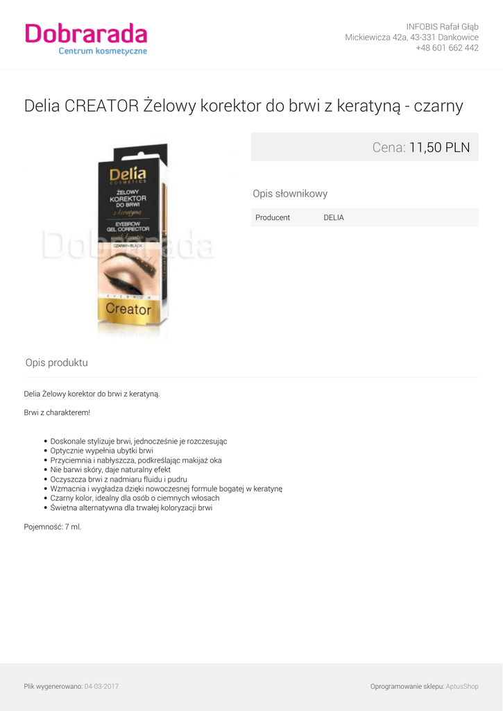 INFOBIS Rafał Głąb Mickiewicza 42a, 43-331 Dankowice +48 601 662 442 Delia CREATOR Żelowy korektor do brwi z keratyną - czarny Cena: 11,50 PLN Opis słownikowy Producent DELIA Opis produktu Delia Żelowy korektor do brwi z keratyną. Brwi z charakterem! Doskonale stylizuje brwi, jednocześnie je rozczesując Optycznie wypełnia ubytki brwi Przyciemnia i nabłyszcza, podkreślając makijaż oka Nie barwi skóry, daje naturalny efekt Oczyszcza brwi z nadmiaru fluidu i pudru Wzmacnia i wygładza dzięki nowoczesnej formule bogatej w keratynę Czarny kolor, idealny dla osób o ciemnych włosach Świetna alternatywna dla trwałej koloryzacji brwi Pojemność: 7 ml. Plik wygenerowano: 04-03-2017 Oprogramowanie sklepu: AptusShop INFOBIS Rafał Głąb Mickiewicza 42a, 43-331 Dankowice +48 601 662 442 Galeria Plik wygenerowano: 04-03-2017 Powered by TCPDF (www.tcpdf.org) Oprogramowanie sklepu: AptusShop