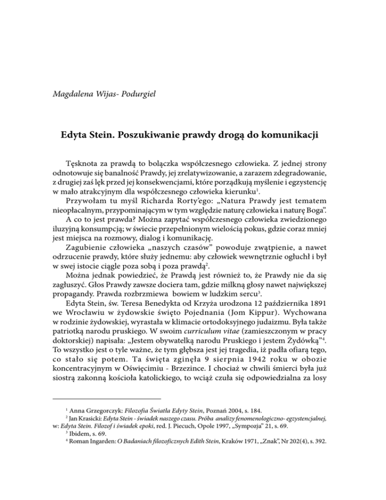 Magdalena Wijas- Podurgiel Edyta Stein. Poszukiwanie prawdy drogą do komunikacji Tęsknota za prawdą to bolączka współczesnego człowieka. Z jednej strony odnotowuje się banalność Prawdy, jej zrelatywizowanie, a zarazem zdegradowanie, z drugiej zaś lęk przed jej konsekwencjami, które porządkują myślenie i egzystencję w mało atrakcyjnym dla współczesnego człowieka kierunku1. Przywołam tu myśl Richarda Rorty’ego: „Natura Prawdy jest tematem nieopłacalnym, przypominającym w tym względzie naturę człowieka i naturę Boga”. A co to jest prawda? Można zapytać współczesnego człowieka zwiedzionego iluzyjną konsumpcją; w świecie przepełnionym wielością pokus, gdzie coraz mniej jest miejsca na rozmowy, dialog i komunikację. Zagubienie człowieka „naszych czasów” powoduje zwątpienie, a nawet odrzucenie prawdy, które służy jednemu: aby człowiek wewnętrznie ogłuchł i był w swej istocie ciągle poza sobą i poza prawdą2. Można jednak powiedzieć, że Prawdą jest również to, że Prawdy nie da się zagłuszyć. Głos Prawdy zawsze dociera tam, gdzie milkną głosy nawet największej propagandy. Prawda rozbrzmiewa bowiem w ludzkim sercu3. Edyta Stein, św. Teresa Benedykta od Krzyża urodzona 12 października 1891 we Wrocławiu w żydowskie święto Pojednania (Jom Kippur). Wychowana w rodzinie żydowskiej, wyrastała w klimacie ortodoksyjnego judaizmu. Była także patriotką narodu pruskiego. W swoim curriculum vitae (zamieszczonym w pracy doktorskiej) napisała: „Jestem obywatelką narodu Pruskiego i jestem Żydówką”4. To wszystko jest o tyle ważne, że tym głębsza jest jej tragedia, iż padła ofiarą tego, co stało się potem. Ta święta zginęła 9 sierpnia 1942 roku w obozie koncentracyjnym w Oświęcimiu - Brzezince. I chociaż w chwili śmierci była już siostrą zakonną kościoła katolickiego, to wciąż czuła się odpowiedzialna za losy 1 Anna Grzegorczyk: Filozofia Światła Edyty Stein, Poznań 2004, s. 184. Jan Krasicki: Edyta Stein - świadek naszego czasu. Próba analizy fenomenologiczno- egzystencjalnej, w: Edyta Stein. Filozof i świadek epoki, red. J. Piecuch, Opole 1997, „Sympozja” 21, s. 69. 3 Ibidem, s. 69. 4 Roman Ingarden: O Badaniach filozoficznych Edith Stein, Kraków 1971, „Znak”, Nr 202(4), s. 392. 2 EDYTA STEIN. POSZUKIWANIE PRAWDY ... 41 narodu żydowskiego. Jej twórczość była zapisana na kartach jej życia. Dlatego też nie można zapomnieć o drogach życiowych, które ją wiodły ku nowym wyborom. Filozofia i życie stanowią tu zintegrowana całość, w której każdy element odpowiedzialny jest za drugi. Edyta Stein poszukuje Prawdy na własną fenomenologiczną rękę. Na kartach swego największego dzieła Byt Skończony a Byt Wieczny powie: „Prawda jest tylko jedna, prawda głęboka”5. Dla niej Prawda to ciągła gotowość do komunikacji i oczekiwanie komunikacji od innych. Komunikacja to miejsce spotkań. Człowieka z człowiekiem, człowieka z Bogiem jak również człowieka z samym sobą. Taka droga do Prawdy wyznacza nowy szlak dla współczesnego człowieka. Życie Edyty Stein cechuje, jakże przenikliwa egzystencjalna interpretacja własnego losu i własnego przeznaczenia, tajemniczego związku wolności człowieka i odwiecznej woli Boga; związku Dobra i Zła, wolności i konieczności, tego co jest ciągle otwartą możliwością ludzkiej wolności i decyzji, wyboru siebie6. Swoją postawą pokazała, że dążąc do prawdy naukowej można dążyć również do prawdy egzystencjalnej, do prawdy jako pewnego Absolutu, a zatem nieuchronnie do najwyższego dobra moralnego i dlatego ostatecznie do Boga i mistyki chrześcijańskiej. Jej drogą do Prawdy nie ma być zatem prawda naukowa, lecz egzystencjalna, w której można żyć i dzięki której można mieć nadzieję7. Edmund Husserl w swej fenomenologii odwraca spojrzenie na filozofię. Jego zwrot ku samym rzeczom [zu den Sachen selbst], odwołuje się do istoty bytu. Edyta Stein, tak jak i większość jego uczniów, rozumie to jako przygotowanie drogi dla prawdy i rzeczywistości wolnej od wszelkiej subiektywności. Była to próba wydobycia myślenia i poznania oraz skierowania go ku realności, która byłaby niezależna od świadomości, czyli istniała sama w sobie. W poszukiwaniu prawdy pojawiło się pytanie o możliwość ponownego zwrotu metafizyki do teologii naturalnej8. Taka metafizyka miała być filozoficznym pytaniem o ostateczne uzasadnienie. Tą ostateczną racją staje się Absolut. Bez niego wszelki byt, a przy tym nasza świadomość byłaby bez ostatecznej przyczyny i celu oraz bez ugruntowania swej istoty, czyli bez sensu9. Dlatego dopiero Bóg może być dla szukającego ostatecznej prawdy odpowiedzią. Husserl unika jednak pojęcia Boga. Byłoby ono bowiem przedmiotem świadomości i znajdowałoby się w pewnej od niej zależności. 5 Anna Grzegorczyk: op. cit., s. 11. Jan Krasicki: op. cit., s. 57. 7 Josef Stallach: Edyta Stein – od Husserla do Tomasza z Akwinu, w: Tajemnica osoby ludzkiej. Antropologia Edyty Stein, red. J. Machnacz, Wrocław 1999, s. 38. 8 Ibidem, s. 34. 9 Ibidem, s. 35. 6 42 MAGDALENA WIJAS-PODURGIEL Edyta Stein wyrosła w fenomenologii Husserla i rozwijała się dzięki rozstaniu z jego idealizmem transcendentalnym10. Jest przekonana, że jeśli dokona się konstytucji transcendentnych obiektów w tym, co dane immanentne, w czystej świadomości, to wówczas osiągamy ostateczną jasność i już nie pozostaje więcej żadne pytanie nierozwiązane. I doda: To właśnie jest cel fenomenologii11. Dzięki wyjaśnieniu postępowania nauk dogmatycznych można szukać odpowiedzi, na pytanie czym jest wiedza. Stein przeciwstawia się relatywizmowi i sceptycyzmowi, nie tylko ufając intelektowi, lecz widząc w filozofii ( chodzi o fenomenologię) ostateczną instancję w daniu niepowątpiewalnej odpowiedzi na nierozwiązane pytania12. Zarówno uczennica, jak i mistrz, odwołują