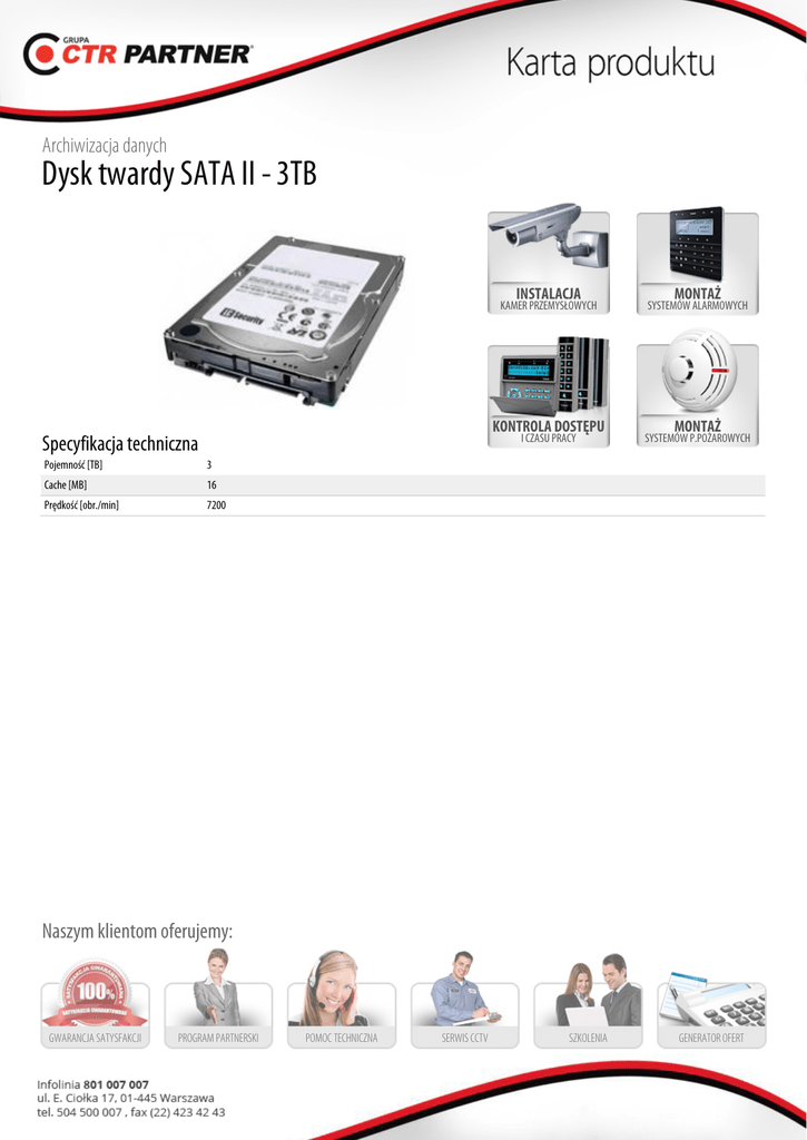 Archiwizacja danych Dysk twardy SATA II - 3TB INSTALACJA KAMER PRZEMYSŁOWYCH KONTROLA DOSTĘPU I CZASU PRACY Specyfikacja techniczna Pojemność [TB] 3 Cache [MB] 16 Prędkość [obr./min] 7200 MONTAŻ SYSTEMÓW ALARMOWYCH MONTAŻ SYSTEMÓW P.POŻAROWYCH Naszym klientom oferujemy: GWARANCJA SATYSFAKCJI PROGRAM PARTNERSKI POMOC TECHNICZNA SERWIS CCTV SZKOLENIA GENERATOR OFERT
