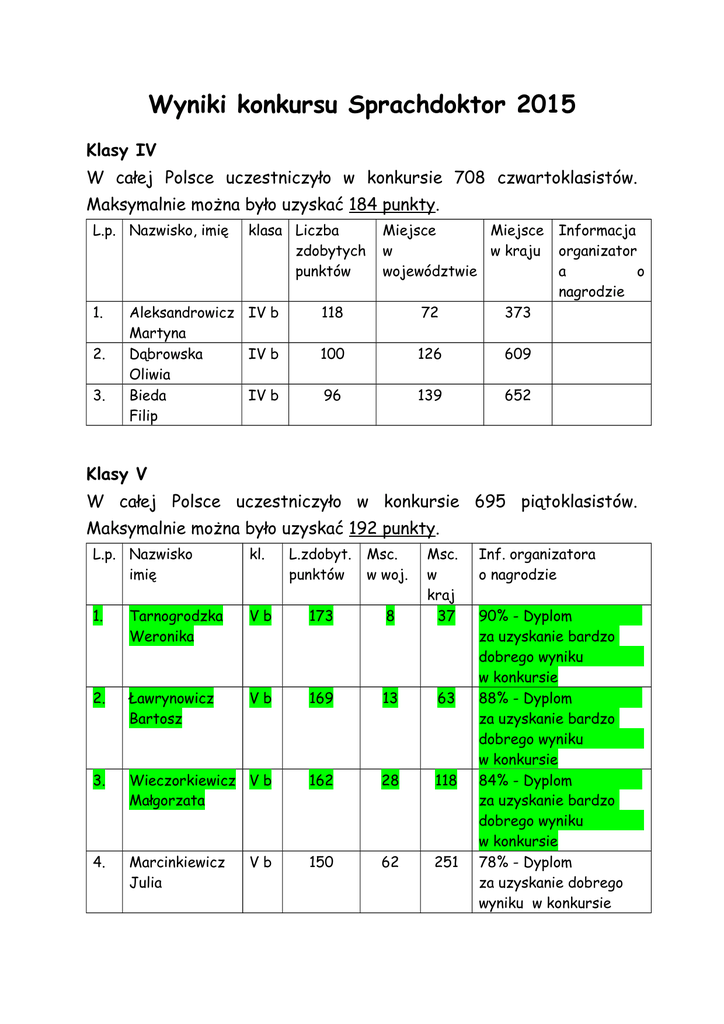 Wyniki konkursu Sprachdoktor 2015 Klasy IV W całej Polsce uczestniczyło w konkursie 708 czwartoklasistów. Maksymalnie można było uzyskać 184 punkty. L.p. Nazwisko, imię 1. 2. 3. klasa Liczba zdobytych punktów Aleksandrowicz IV b Martyna Dąbrowska IV b Oliwia Bieda IV b Filip Miejsce Miejsce w w kraju województwie 118 72 373 100 126 609 96 139 652 Informacja organizator a o nagrodzie Klasy V W całej Polsce uczestniczyło w konkursie 695 piątoklasistów. Maksymalnie można było uzyskać 192 punkty. L.p. Nazwisko imię kl. L.zdobyt. punktów Msc. w woj. 1. Tarnogrodzka Weronika Vb 173 8 Msc. w kraj 37 2. Ławrynowicz Bartosz Vb 169 13 63 3. Wieczorkiewicz V b Małgorzata 162 28 118 4. Marcinkiewicz Julia 150 62 251 Vb Inf. organizatora o nagrodzie 90% - Dyplom za uzyskanie bardzo dobrego wyniku w konkursie 88% - Dyplom za uzyskanie bardzo dobrego wyniku w konkursie 84% - Dyplom za uzyskanie bardzo dobrego wyniku w konkursie 78% - Dyplom za uzyskanie dobrego wyniku w konkursie 5. 6. 7. 8. 9. Dubiniak Matylda Jaremowicz Adrian Kubiak Bartłomiej Zieliński Dominik Szachniewicz Monika Vb 136 105 443 Vb 122 126 572 Vb 120 129 587 Va 116 135 615 Vb 98 144 682 Klasy VI W całej Polsce uczestniczyło w konkursie 823 szóstoklasistów. Maksymalnie można było uzyskać 200 punktów. L.p. Nazwisko, imię klasa Liczba zdobytych punktów 1. VI a 134 84 402 VI b 131 95 446 VI a 124 117 525 VI a 120 134 571 VI a 116 142 623 VI a 116 142 623 2. 3. 4. 5. Oczkowski Oktawian Kuśmierczyk Małgorzata Wójcik Jakub Janowski Kamil Sopata Ludwik Kuriata Wojciech Miejsce Miejsce w w kraju województwie Informacja organizator a o nagrodzie Gratuluję !!! Wasze osiągnięcia są bardzo dobre. Wszyscy otrzymują celującą ocenę cząstkową. Weronika, Bartosz i Małgorzata celującą ocenę końcoworoczną (oczywiście przy dalszym takim zaangażowaniu w naukę języka niemieckiego). Lucyna Wasinkiewicz