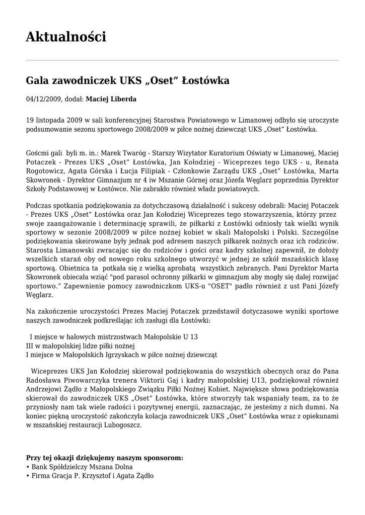 Aktualności Gala zawodniczek UKS „Oset” Łostówka 04/12/2009, dodał: Maciej Liberda 19 listopada 2009 w sali konferencyjnej Starostwa Powiatowego w Limanowej odbyło się uroczyste podsumowanie sezonu sportowego 2008/2009 w piłce nożnej dziewcząt UKS „Oset” Łostówka. Goścmi gali byli m. in.: Marek Twaróg - Starszy Wizytator Kuratorium Oświaty w Limanowej, Maciej Potaczek - Prezes UKS „Oset” Łostówka, Jan Kołodziej - Wiceprezes tego UKS - u, Renata Rogotowicz, Agata Górska i Łucja Filipiak - Członkowie Zarządu UKS „Oset” Łostówka, Marta Skowronek - Dyrektor Gimnazjum nr 4 iw Mszanie Górnej oraz Józefa Węglarz poprzednia Dyrektor Szkoły Podstawowej w Łostówce. Nie zabrakło również władz powiatowych. Podczas spotkania podziękowania za dotychczasową działalność i sukcesy odebrali: Maciej Potaczek - Prezes UKS „Oset” Łostówka oraz Jan Kołodziej Wiceprezes tego stowarzyszenia, którzy przez swoje zaangażowanie i determinację sprawili, że piłkarki z Łostówki odniosły tak wielki wynik sportowy w sezonie 2008/2009 w piłce nożnej kobiet w skali Małopolski i Polski. Szczególne podziękowania skeirowane były jednak pod adresem naszych piłkarek nożnych oraz ich rodziców. Starosta Limanowski zwracając się do rodziców i gości oraz kadry szkolnej zapewnił, że dołoży wszelkich starań oby od nowego roku szkolnego utworzyć w jednej ze szkół mszańskich klasę sportową. Obietnica ta potkała się z wielką aprobatą wszystkich zebranych. Pani Dyrektor Marta Skowronek obiecała wziąć "pod parasol ochronny piłkarki w gimnazjum aby mogły się dalej rozwijać sportowo.” Zapewnienie pomocy zawodniczkom UKS-u "OSET" padło również z ust Pani Józefy Węglarz. Na zakończenie uroczystości Prezes Maciej Potaczek przedstawił dotyczasowe wyniki sportowe naszych zawodniczek podkreślając ich zasługi dla Łostówki: I miejsce w halowych mistrzostwach Małopolskie U 13 III w małopolskiej lidze piłki nożnej I miejsce w Małopolskich Igrzyskach w piłce nożnej dziewcząt Wiceprezes UKS Jan Kołodziej skierował podziękowania do wszystkich obecnych oraz do Pana Radosława Piwowarczyka trenera Viktorii Gaj i kadry małopolskiej U13, podziękował również Andrzejowi Żądło z Małopolskiego Związku Piłki Nożnej Kobiet. Największe słowa podziękowania skierował do zawodniczek UKS „Oset” Łostówka, które stworzyły tak wspaniały team, za to że przyniosły nam tak wiele radości i pozytywnej energii, zaznaczając, że jesteśmy z nich dumni. Na koniec piękną uroczystość zakończyła kolacja zawodniczek UKS „Oset” Łostówka wraz z opiekunami w mszańskiej restauracji Lubogoszcz. Przy tej okazji dziękujemy naszym sponsorom: • Bank Spółdzielczy Mszana Dolna • Firma Gracja P. Krzysztof i Agata Żądło • Firma Żak przewoźnik. Lista zawodniczek UKS „Oset” Łostówka: • Karolina Kołodziej - napastnik, kapitan drużyny • Ania Kulka - bramkarz • Karolina Antosz – lewa obrona • Agnieszka Antosz – środek obrony • Dorota Świerk – pomoc, atak • Ewelina Dudzik – pomoc • Weronika Wacławik – lewy napastnik • Karolina Kręcichwost – prawy napastnik • Maria Szymczak – prawy pomocnik • Natalia Łacna – pomoc • Ewelina Filipiak – atak • Patrycja Szczypka – środek obrony • Monika Malec – pomoc • Daria Myszogląd – atak • Aneta Chrągwicka – obrona • Edyta Chorągwicka – atak • Karolina Wąchała – atak, bramkarz rezerwowy • Dominika Haras – obrona. Jan Kołodziej Galeria