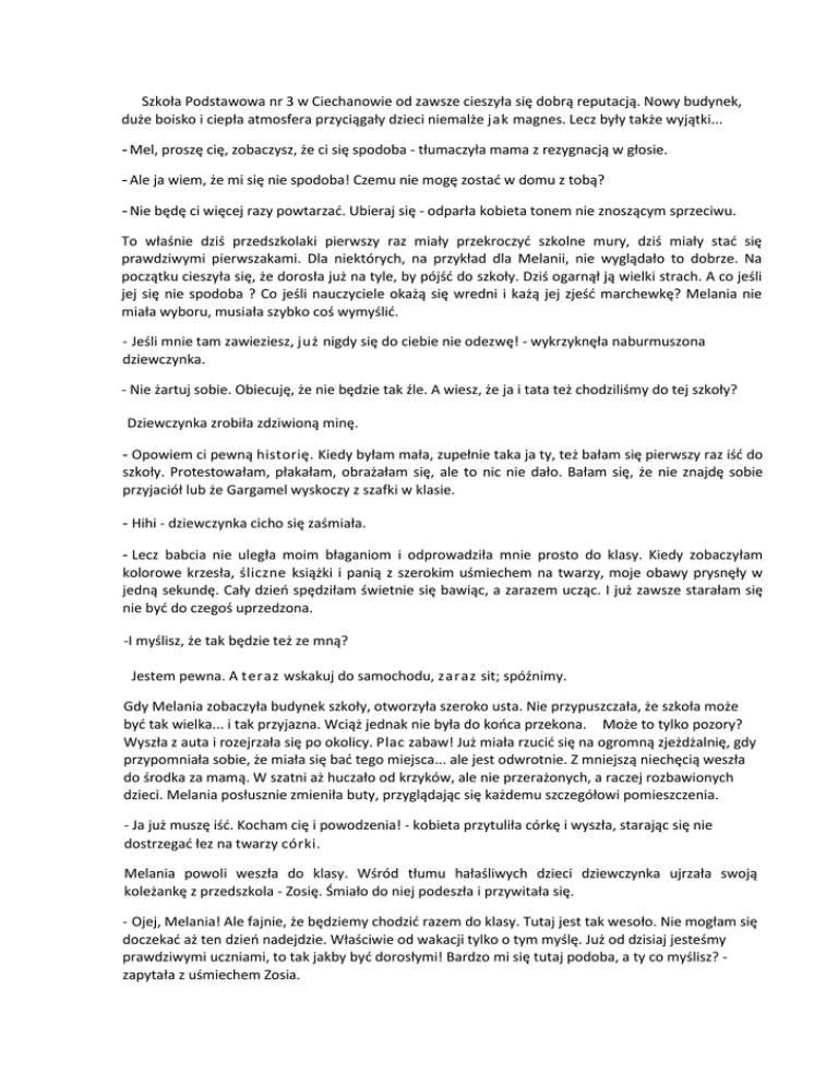 Szkoła Podstawowa nr 3 w Ciechanowie od zawsze cieszyła się dobrą reputacją. Nowy budynek, duże boisko i ciepła atmosfera przyciągały dzieci niemalże jak magnes. Lecz były także wyjątki... - Mel, proszę cię, zobaczysz, że ci się spodoba - tłumaczyła mama z rezygnacją w głosie. - Ale ja wiem, że mi się nie spodoba! Czemu nie mogę zostać w domu z tobą? - Nie będę ci więcej razy powtarzać. Ubieraj się - odparła kobieta tonem nie znoszącym sprzeciwu. To właśnie dziś przedszkolaki pierwszy raz miały przekroczyć szkolne mury, dziś miały stać się prawdziwymi pierwszakami. Dla niektórych, na przykład dla Melanii, nie wyglądało to dobrze. Na początku cieszyła się, że dorosła już na tyle, by pójść do szkoły. Dziś ogarnął ją wielki strach. A co jeśli jej się nie spodoba ? Co jeśli nauczyciele okażą się wredni i każą jej zjeść marchewkę? Melania nie miała wyboru, musiała szybko coś wymyślić. - Jeśli mnie tam zawieziesz, już nigdy się do ciebie nie odezwę! - wykrzyknęła naburmuszona dziewczynka. - Nie żartuj sobie. Obiecuję, że nie będzie tak źle. A wiesz, że ja i tata też chodziliśmy do tej szkoły? Dziewczynka zrobiła zdziwioną minę. - Opowiem ci pewną historię. Kiedy byłam mała, zupełnie taka ja ty, też bałam się pierwszy raz iść do szkoły. Protestowałam, płakałam, obrażałam się, ale to nic nie dało. Bałam się, że nie znajdę sobie przyjaciół lub że Gargamel wyskoczy z szafki w klasie. - Hihi - dziewczynka cicho się zaśmiała. - Lecz babcia nie uległa moim błaganiom i odprowadziła mnie prosto do klasy. Kiedy zobaczyłam kolorowe krzesła, śliczne książki i panią z szerokim uśmiechem na twarzy, moje obawy prysnęły w jedną sekundę. Cały dzień spędziłam świetnie się bawiąc, a zarazem ucząc. I już zawsze starałam się nie być do czegoś uprzedzona. -I myślisz, że tak będzie też ze mną? Jestem pewna. A teraz wskakuj do samochodu, zaraz sit; spóźnimy. Gdy Melania zobaczyła budynek szkoły, otworzyła szeroko usta. Nie przypuszczała, że szkoła może być tak wielka... i tak przyjazna. Wciąż jednak nie była do końca przekona. Może to tylko pozory? Wyszła z auta i rozejrzała się po okolicy. Plac zabaw! Już miała rzucić się na ogromną zjeżdżalnię, gdy przypomniała sobie, że miała się bać tego miejsca... ale jest odwrotnie. Z mniejszą niechęcią weszła do środka za mamą. W szatni aż huczało od krzyków, ale nie przerażonych, a raczej rozbawionych dzieci. Melania posłusznie zmieniła buty, przyglądając się każdemu szczegółowi pomieszczenia. - Ja już muszę iść. Kocham cię i powodzenia! - kobieta przytuliła córkę i wyszła, starając się nie dostrzegać łez na twarzy córki. Melania powoli weszła do klasy. Wśród tłumu hałaśliwych dzieci dziewczynka ujrzała swoją koleżankę z przedszkola - Zosię. Śmiało do niej podeszła i przywitała się. - Ojej, Melania! Ale fajnie, że będziemy chodzić razem do klasy. Tutaj jest tak wesoło. Nie mogłam się doczekać aż ten dzień nadejdzie. Właściwie od wakacji tylko o tym myślę. Już od dzisiaj jesteśmy prawdziwymi uczniami, to tak jakby być dorosłymi! Bardzo mi się tutaj podoba, a ty co myślisz? zapytała z uśmiechem Zosia. - No wiesz... jest całkiem fajnie. A nie boisz się, że nauczyciele będą niemili? A co jeśli nie dasz sobie rady z ćwiczeniami? - Nie martwię się tym. Przed chwilą była tu nasza pani, wydawała się super. Nie będzie źle. Nagle Melanii zrobiło się strasznie głupio. Przecież jej koleżanka ma rację, nie ma się czego bać. W końcu mama nie wysłałaby jej gdzieś, gdzie będzie się czuła niedobrze. W tej chwili zadzwonił pierwszy dzwonek. Dziewczynka usiadła w ławce obok swojej koleżanki. Teraz, gdy rozejrzała się po pomieszczeniu, zauważyła, że wszyscy podskakują na krzesłach, nie mogąc doczekać się rozpoczęcia lekcji. W tej chwili do klasy weszła wysoka, szczupła kobieta ubrana w kolorową sukienkę i serdecznie przywitała pierwszoklasistów. - Dzień dobry - zabrzmiała chóralna odpowiedź. - Mam na imię Agnieszka i będę waszą nauczycielką przez następne trzy lata nauki. Nie bójcie się, zapewniam, że spędzicie ten czas świetnie się bawiąc. To może na początek przedstawicie się? Każdy po kolei zaczął wypowiadać swoje imię. Chwilę później rozpoczęła się gra zwana „setką". Zadaniem każdej z grup było znalezienie w klasie karteczki z zadaniem, na której namalowana jest liczba oczek, która wypadła przy rzuceniu kostką. Kapitanem drużyny A został chłopiec z pierwszej ławki - Jacek, natomiast drużyny B - Melania. Dziewczynka nie wiedziała, czy sobie poradzi. Postanowiła dać z siebie wszystko i nie zawieść kolegów już pierwszego dnia. Gdy gra się rozpoczęła, wszyscy rzucili się w poszukiwaniu kartek z odpowiednimi numerami. Sala w sekundę zmieniła się w istne pobojowisko. Melania zaraz zapomniała o swojej nieśmiałości i całkowicie pochłonięta zabawą zdobywała kolejne punkty dla swojej drużyny. Skupienie i silna motywacja dziewczynki dały wymarzony efekt - drużyna B wygrała. Masa uśmiechów pojawiła się na twarzach jej rówieśników. Okrzykom zachwytu nie było końca. Kilku uczniów zaczęło skakać aż do sufitu, wywołując małe „trzęsienie ziemi". Melania zebrała mnóstwo miłych słów i w końcu poczuła się dobrze w nowej szkole. Pani serdecznie pogratulowała obu drużynom i ostatecznie wszyscy dostali piątki za wspaniałą pracę w grupach. Dziewczynka nie mogła w to uwierzyć - udało jej się. Nie tylko poprowadziła swoją drużynę do zwycięstwa, ale także przezwyciężyła swoją niechęć do szkoły. Wkrótce dobiegł koniec lekcji i wszyscy uśmiechnięci wybiegli z klasy. Mama Melanii już czekała na swoją córeczkę przy wejściu. -I co jak było? Opowiadaj ! - rzekła kobieta. - Nie wiedziałam, ż