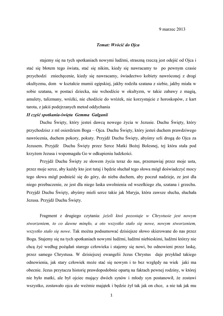 9 marzec 2013 Temat: Wrócić do Ojca stajemy się na tych spotkaniach nowymi ludźmi, straszną rzeczą jest odejść od Ojca i stać się błotem tego świata, stać się nikim, kiedy się nawracamy to po pewnym czasie przychodzi zniechęcenie, kiedy się nawracamy, świadectwo kobiety nawróconej z drogi okultyzmu, dom w kształcie mumii egipskiej, jakby rodziła szatana z siebie, jakby miała w sobie szatana, w postaci dziecka, nie wchodźcie w okultyzm, w takie zabawy z magią, amulety, talizmany, wróżki, nie chodźcie do wróżek, nie korzystajcie z horoskopów, z kart tarota, z jakiś podejrzanych metod oddychania II część spotkania-święta Gemma Galganii Duchu Święty, który jesteś dawcą nowego życia w Jezusie. Duchu Święty, który przychodzisz z ml osierdziem Boga – Ojca. Duchu Święty, który jesteś duchem prawdziwego nawrócenia, duchem pokory, pokuty. Przyjdź Duchu Święty, abyśmy szli drogą do Ojca za Jezusem. Przyjdź Duchu Święty przez Serce Matki Bożej Bolesnej, tej która stała pod krzyżem Jezusa i wspomagała Go w odkupieniu ludzkości. Przyjdź Duchu Święty ze słowem życia teraz do nas, przemawiaj przez moje usta, przez moje serce, aby każdy kto jest tutaj i będzie słuchał tego słowa mógł doświadczyć mocy tego słowa mógł podnieść się do góry, do nieba duchem, aby poczuł nadzieje, ze jest dla niego przebaczenie, ze jest dla niego laska uwolnienia od wszelkiego zła, szatana i grzechu. Przyjdź Duchu Święty, abyśmy mieli serce takie jak Maryja, która zawsze słucha, słuchała Jezusa. Przyjdź Duchu Święty. Fragment z drugiego czytania: jeżeli ktoś pozostaje w Chrystusie jest nowym stworzeniem, to co dawne minęło, a oto wszystko stało się nowe, nowym stworzeniem, wszystko stało się nowe. Tak można podsumować dzisiejsze słowo skierowane do nas przez Boga. Stajemy się na tych spotkaniach nowymi ludźmi, ludźmi niebieskimi, ludźmi którzy nie chcą żyć według pożądań starego człowieka i stajemy się nowi, bo odnowieni przez laskę, przez samego Chrystusa. W dzisiejszej ewangelii Jezus Chrystus daje przykład takiego odnowienia, jak stary człowiek może stać się nowym i to bez względy na wiek jaki ma obecnie. Jezus przytacza historię prawdopodobnie opartą na faktach pewnej rodziny, w której nie było matki, ale był ojciec mający dwóch synów i młody syn postanowił, że zostawi wszystko, zostawało ojca ale weźmie majątek i będzie żył tak jak on chce, a nie tak jak mu 1 ojciec proponuje. Nie tak jako ojciec go wychował, pragnął życia, które będzie bez zasad, w wolności. Jezus Chrystus pokazuje, że nawet dla takich ludzi, dla takiego człowieka jest miłosierdzie. Ten człowiek z dzisiejszej ewangelii wszedł w najgorsze zło. Stracił wszystko, zszedł do poziomu bycia pastuchem świń, a w tamtych czasach, bycie pastuchem świń, bo tak mówiono, nawet nie pasterzem, tylko pastuchem świń, było cos najgorszego, najpodlejszego, taplać się w błocie razem ze swingami, karmić się świnie i nawet nie móc zjeść tego, co jedzą świnie, to jeszcze być niżej od świń. To straszne. Tak nam Jezus dzisiaj pokazuje jak straszną rzeczą jest odejść od Ojca i stać się błotem tego świata, stać się nikim. Kto wchodzi w grzech, oddala się od Ojca niebieskiego to traci kontakt w Ojcem i wchodzi w ciemność, w upodlenie, w zranienia, w śmierć. Jednak ta historia dzisiejszej ewangelii kończy się bardzo pięknie, cudownie, można by powiedzieć, prawie, ze bajkowo, bo ten, który został stracony po ludzku, tak się wydaje, został odzyskany, zaginął a odnalazł się, był umarły a ożył, stal się na nowo synem swojego ojca. Ojciec dla mu o wiele więcej niż dal mu wcześniej. Kiedy ten nawraca się do Ojca, Ojciec daje mu swój pierścień, swoje szaty, swoje sandały, odnawia jego godność, syna, nie upokarza go, nie krytykuje, nie mówi, że ty jesteś sługą moim, nie ubliża mu, ale podnosi, cieszy się, że ten syn jego wrócił. Dzisiaj Jezus Chrystus pokazuje nam, że tak samo my, którzy tutaj jesteśmy powinniśmy wszyscy wracać do Ojca. Nie ma żadnego człowieka, który byłyby już na tyle święty, sprawiedliwy, który by nie potrzebował każdego dnia na nowo wracać do Boga Ojca, na nowo zrywać ze starym człowiekiem, ze starym życiem. I my często doświadczamy tego, że nawet kiedy się nawracamy, kiedy jest jakaś głęboka spowiedź z całego życia, kiedy nawet następuje nawrócenie na spotkaniach, bo takie tez mają miejsca, wiele osób się na spotkaniach nawraca, również i naszych, to potem jest jakieś też zniechęcenie, po pewnym etapie nawrócenia, radości, zachwytu nad nowym życiem, nad tym, ze Bóg jest taki wspaniały, taki zachwycający, taki piękny, taki inny niż się kiedyś myślało, taki nowy, takie nieprzewidywalny, taki, który za człowiekiem tęskni, który pragnie być z człowiekiem, który pragnie jego miłości. To potem przychodzi czas zniechęcenia, kiedy się wydaje, że takie życie z Bogiem jest niemożliwe, że to jest za trudne, że to jest nierealne na tym świecie, gdzie jest wiele oszustwa, kłamstwa, kombinacji, złości, kiedy jeden drugiego chce wykorzystać, zranić, kiedy tak mało jest miłości albo w ogóle tej miłości nie ma. Tyle zła, jak żyć Bogiem? Nawet w zakonach, czy w kapłaństwie jest to trudne, nawet bardzo trudne, nawet bardziej trudne niż życie w świecie czasami, albo można powiedzieć, bardzo często trudniejsze, żeby nie poddawać się taj pokusie złego, bo po pozostaje – wracać do starego 2 życia? Do starych nałogów, grzechów? Niektórzy załamują się. Ja tez czasami spotykam takie osoby, które wchodzą znowu, po czasie nawrócenia, euforii, bycia z Panem, znowu wracają do tego samego. Można powiedzieć, jak mówi św. Piotr, takie dosadne słowa, o ludziach którzy nawracają się, idą do Pana Boga, a potem znów wracają do starego stylu życia, do s