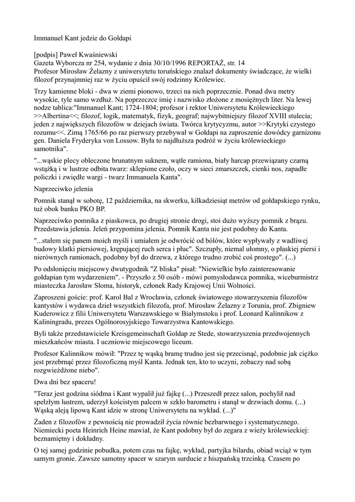 Immanuel Kant jedzie do Gołdapi [podpis] Paweł Kwaśniewski Gazeta Wyborcza nr 254, wydanie z dnia 30/10/1996 REPORTAŻ, str. 14 Profesor Mirosław Żelazny z uniwersytetu toruńskiego znalazł dokumenty świadczące, że wielki filozof przynajmniej raz w życiu opuścił swój rodzinny Królewiec. Trzy kamienne bloki - dwa w ziemi pionowo, trzeci na nich poprzecznie. Ponad dwa metry wysokie, tyle samo wzdłuż. Na poprzeczce imię i nazwisko złożone z mosiężnych liter. Na lewej nodze tablica:"Immanuel Kant; 1724-1804; profesor i rektor Uniwersytetu Królewieckiego >>Albertina<<; filozof, logik, matematyk, fizyk, geograf; najwybitniejszy filozof XVIII stulecia; jeden z największych filozofów w dziejach świata. Twórca krytycyzmu, autor >>Krytyki czystego rozumu<<. Zimą 1765/66 po raz pierwszy przebywał w Gołdapi na zaproszenie dowódcy garnizonu gen. Daniela Fryderyka von Lossow. Była to najdłuższa podróż w życiu królewieckiego samotnika". "...wąskie plecy obleczone brunatnym suknem, wątłe ramiona, biały harcap przewiązany czarną wstążką i w lustrze odbita twarz: sklepione czoło, oczy w sieci zmarszczek, cienki nos, zapadłe policzki i zwiędłe wargi - twarz Immanuela Kanta". Naprzeciwko jelenia Pomnik stanął w sobotę, 12 października, na skwerku, kilkadziesiąt metrów od gołdapskiego rynku, tuż obok banku PKO BP. Naprzeciwko pomnika z piaskowca, po drugiej stronie drogi, stoi dużo wyższy pomnik z brązu. Przedstawia jelenia. Jeleń przypomina jelenia. Pomnik Kanta nie jest podobny do Kanta. "...stałem się panem moich myśli i umiałem je odwrócić od bólów, które wypływały z wadliwej budowy klatki piersiowej, krępującej ruch serca i płuc". Szczupły, niemal ułomny, o płaskiej piersi i nierównych ramionach, podobny był do drzewa, z którego trudno zrobić coś prostego". (...) Po odsłonięciu miejscowy dwutygodnik "Z bliska" pisał: "Niewielkie było zainteresowanie gołdapian tym wydarzeniem". - Przyszło z 50 osób - mówi pomysłodawca pomnika, wiceburmistrz miasteczka Jarosław Słoma, historyk, członek Rady Krajowej Unii Wolności. Zaproszeni goście: prof. Karol Bal z Wrocławia, członek światowego stowarzyszenia filozofów kantystów i wydawca dzieł wszystkich filozofa, prof. Mirosław Żelazny z Torunia, prof. Zbigniew Kuderowicz z filii Uniwersytetu Warszawskiego w Białymstoku i prof. Leonard Kalinnikow z Kaliningradu, prezes Ogólnorosyjskiego Towarzystwa Kantowskiego. Byli także przedstawiciele Kreisgemeinschaft Goldap ze Stede, stowarzyszenia przedwojennych mieszkańców miasta. I uczniowie miejscowego liceum. Profesor Kalinnikow mówił: "Przez tę wąską bramę trudno jest się przecisnąć, podobnie jak ciężko jest przebrnąć przez filozoficzną myśl Kanta. Jednak ten, kto to uczyni, zobaczy nad sobą rozgwieżdżone niebo". Dwa dni bez spaceru! "Teraz jest godzina siódma i Kant wypalił już fajkę (...) Przeszedł przez salon, pochylił nad spełzłym lustrem, uderzył kościstym palcem w szkło barometru i stanął w drzwiach domu. (...) Wąską aleją lipową Kant idzie w stronę Uniwersytetu na wykład. (...)" Żaden z filozofów z pewnością nie prowadził życia równie bezbarwnego i systematycznego. Niemiecki poeta Heinrich Heine mawiał, że Kant podobny był do zegara z wieży królewieckiej: beznamiętny i dokładny. O tej samej godzinie pobudka, potem czas na fajkę, wykład, partyjka bilardu, obiad wciąż w tym samym gronie. Zawsze samotny spacer w szarym surducie z hiszpańską trzcinką. Czasem po spacerze wizyta u angielskiego kupca Greena. To był czas na drzemkę gospodarza. Filozof cicho wsuwał się do pokoju i siadał w fotelu. Drzemali razem. Podobno ówcześni mieszkańcy Królewca regulowali zegarki według rozkładu jego dnia. Podobno Kant nigdy nie ruszył się ze swego prowincjonalnego Królewca, choć w XVIII stuleciu wielu jeździło studiować do Niemiec, Francji, Anglii. Profesor Mirosław Żelazny, kantysta z Uniwersytetu Mikołaja Kopernika w Toruniu, znalazł dokumenty świadczące, że Kant ruszył w świat. W świat, czyli do Gołdapi. Być może podróży było więcej, ale pewna jest ta jedna. W styczniu 1766 r. J.J. Kanter, królewiecki wydawca i drukarz, przedstawił uniwersyteckiej cenzurze nie rękopis, jak wymagano, lecz gotową już książkę Kanta "Sny o upiorach". Ukarano go grzywną dziesięciu talarów. W piśmie z 5 marca 1766 r. tłumaczył, że nie dopełnił wymaganej procedury, gdyż Kant wyjechał do Gołdapi. Prawdopodobnie filozof odwiedził wtedy swojego przyjaciela gen. Daniela Fryderyka von Lossowa, dowódcę gołdapskiego garnizonu (von Lossow zasłynął ze zbudowania w pobliskiej Niedrzwicy oranżerii - celu niedzielnych spacerów gołdapian. Dziś po oranżerii nie ma śladu). Podróż, w linii prostej 125 km, Kant odbył najprawdopodobniej saniami; była przecież zima. Musiał jechać pełne dwa dni. Dwa dni bez wykładu, bilardu, spaceru lipową aleją i rozmyślań w gabinecie z portretem Rousseau! "Upór, z jakim obstawał przy regulaminie życia codziennego, zdradzał osłabione poczucie rzeczywistości. (...) Teraźniejszość, jeśli jej z góry nie przewidział, była intruzem i stawała w drzwiach gabinetu jak nieoczekiwany gość, jak anioł śmierci, który drwi z czasu. (...) Zdarzyło się, że dostrzegłszy brak guzika przy surducie studenta przerwał wykład. Tak samo się zająknął i splątał myśl, gdy student guzik przyszył: >>zechce pan odciąć guzik, od którego odwykłem<< - poprosił nieśmiało". Chciał odkupić koguta Czy Kant jechał tą samą drogą, na której trzy kilometry od Gołdapi zbudowano polsko-rosyjskie przejście graniczne - otwarte tylko pół doby, tylko dla ruchu kołowego i tylko dla obywateli dwóch graniczących państw. Wieczorem, po pracy, Polacy pedałują na rowerach (bo piechotą nie można) do sklepu wolnocłowego po tanią wódkę i papierosy. Rosjanie przyjeżdżają rano - na targ, p