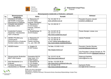 Stowarzyszenia studenckie w Krakowie z adresami l.p. 1. 2. Stowarzyszenia studenckie ERASMUS STUDENT NETWORK Uniwersytet Ekonomiczny w Krakowie ZWIĄZEK MŁODZIEśY WIEJSKIEJ „WICI” Adres ul. Rakowicka 27 31-510 Kraków budynek „StróŜówka” ul. Rakowicka 27 31-510 Kraków budynek „Ustronie”, pok. 511 ul. Rostafińskiego 10 30-072 Kraków 3. Academika Fundacja Studentów i Absolwentów AGH w Krakowie 4. AIESEC POLSKA przy Uniwersytecie Ekonomicznym w Krakowie Komitet Lokalny Kraków 5. AEGEE-Kraków Kontakt Tel. 012 293 75 12 www.uekrakow.esn.pl Adresaci Prezydent Zuzanna Janusik [email protected] Tel. 012 293 55 17 Tel. 012 637 20 79 Tel. 012 617 37 48 http://www.academica.org.pl/ Prezes Zarządu: Łukasz Jura ul. Rakowicka 27 31-510 Kraków Pawilon sportowy, II p., pok. 228, 229 Tel. 012 293 53 78 Tel. 012 293 56 78 e-mail: [email protected] http://www.aiesec.org/poland/krakow Izabela Podstolak ul. Gołębia 24 31-007 Kraków Tel./faks. 012 663 14 23 Prezydent: Sandra Oborska [email protected] http://aegee.krakow.pl/ Vice Prezydent, Członek Zarządu ds. FR: Aleksandra Kluczka [email protected] 6. Stowarzyszenie Studentów BEST AGH Kraków 7. Klub Absolwenta UJ w Krakowie Fundacja Studentów i Absolwentów UJ "Bratniak" 8. Gramatyka 8A/315 Hotel Lipsk, D13 30-067 Kraków ul. Karmelicka 34 31-131 Kraków ul. Piastowska 47 30-067 Kraków Tel. 012 617 42 49 http://www.best.krakow.pl/ Katarzyna Kasińska [email protected] Tel./fax.: 012 632 38 30 http://www.klub.uj.pl/teksty/index.php Tel. 012 622 37 00 http://www.bratniak.krakow.pl/ Agnieszka Rokita [email protected] Źródła: w/w strony internetowe Sporządzono: wrzesień 2012 Opracowano w Centrum Informacji i Planowania Kariery Zawodowej Wojewódzkiego Urzędu Pracy w Krakowie 9. w Krakowie NiezaleŜne Zrzeszenie Studentów AP w Krakowie ul. PodchorąŜych 2 pok.47 30-084 Kraków Tel. 012 662 61 20 http://studia.nzs.pl/ 10. NiezaleŜne Zrzeszenie Studentów Uniwersytetu Ekonomicznego w Krakowie ul. Rakowicka 27, pawilon dydaktyczno-sportowy, pok. 224, 225, 230 31-510 Kraków Tel. 012 293 55 50 Tel. 012 293-55-51 Faks. 012 293-50-17 http://nzsuek.pl/ [email protected] 11. Parlament Studencki UEK Tel. 012 293 55 85 Tel. 012 293 53 86 http://psuek.pl/ e-mail: [email protected] Tel. 012 663 18 67 e-mail: [email protected] http://www3.uj.edu.pl/SAUJ/ Tel. 012 662 61 19 http://www.ap.krakow.pl/zsp/ e-mail: [email protected] 12. Stowarzyszenie „AD MERITUM” Uniwersytetu Ekonomicznego w Krakowie ul. Rakowicka 27 31-510 Kraków Pawilon dydaktycznosportowy, II p., pokoje 226 i 227 ul. Rakowicka 27 31-510 Kraków pawilon B, pok. 267 13. Stowarzyszenie Absolwentów UJ w Krakowie Zrzeszenie Studentów Polskich AP w Krakowie ul. Grodzka 53 31-001 Kraków piwnica gotycka 04 ul. PodchorąŜych 2 30-084 Kraków 14. Tel. 012 293 53 70, Faks: 012 293 50 74 http://www.admeritum.eu/ Magdalena Chyra Przewodnicząca NZS UP e-mail: [email protected] Karol Głogowiecki Przewodniczący NIE ZAINTERESOWANY Przewodnicząca Parlamentu Studenckiego: Agnieszka Sadowska [email protected] Prezes Sławomir Szmyd e-mail: [email protected] Przewodniczący: Grzegorz Klimkowski Wiceprzewodniczący: Tobiasz Wolanin 15. Zrzeszenie Studentów Polskich PK ul. Warszawska 24 31-155 Kraków bud. SJO, pok. 102 Tel/fax. 012 628 29 04 http://www.zsp.pk.edu.pl/ email: [email protected] Źródła: w/w strony internetowe Sporządzono: wrzesień 2012 Opracowano w Centrum Informacji i Planowania Kariery Zawodowej Wojewódzkiego Urzędu Pracy w Krakowie 16. Organizacja Studencka „SIFE – Studenci dla Przedsiębiorczości” Uniwersytetu Ekonomicznego w Krakowie ul. Rakowicka 27 31-510 Kraków [email protected] [email protected] http://www.sife.uek.krakow.pl/index.html Prezes SIFE: Łukasz Jaśkowski Tel: 694 912 257 17. Samorząd Studentów UJ w Krakowie ul. Gołębia 24 31-007 Kraków Collegium Novum pok.033 Wiceprzewodniczący: Tomasz Kocoł [email protected] 18. NiezaleŜne Zrzeszenie Studentów UJ w Krakowie ul. Gołębia 24 31-007 Kraków 19. ZRZESZENIE STUDENTÓW NIEPEŁNOSPRAWNYCH Uniwersytetu Ekonomicznego w Krakowie ul. Rakowicka 27 31-510 Kraków pawilon D Tel. 012 663 11 71 Tel. 012 422 10 33 w.1171 Fax. 012 430 14 81 http://www.samorzad.uj.edu.pl/main/news Dyrektor NZS UJ ds. Partnerów Jakub Dziewięcki tel. 798 708 029 http://www.nzs.uj.edu.pl/start [email protected] Tel. 012 293 51 20 e-mail: [email protected] [email protected] Źródła: w/w strony internetowe Sporządzono: wrzesień 2012 Opracowano w Centrum Informacji i Planowania Kariery Zawodowej Wojewódzkiego Urzędu Pracy w Krakowie Dyrektor NZS UJ ds. Partnerów | Jakub Dziewięcki e-mail: [email protected] Marzena Dudek [email protected]