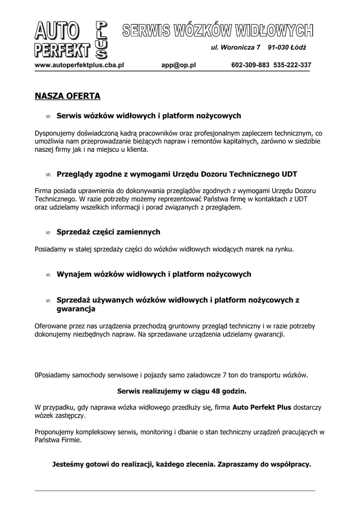 ul. Woronicza 7 www.autoperfektplus.cba.pl [email protected] 91-030 Łódź 602-309-883 535-222-337 NASZA OFERTA • Serwis wózków widłowych i platform nożycowych Dysponujemy doświadczoną kadrą pracowników oraz profesjonalnym zapleczem technicznym, co umożliwia nam przeprowadzanie bieżących napraw i remontów kapitalnych, zarówno w siedzibie naszej firmy jak i na miejscu u klienta. • Przeglądy zgodne z wymogami Urzędu Dozoru Technicznego UDT Firma posiada uprawnienia do dokonywania przeglądów zgodnych z wymogami Urzędu Dozoru Technicznego. W razie potrzeby możemy reprezentować Państwa firmę w kontaktach z UDT oraz udzielamy wszelkich informacji i porad związanych z przeglądem. • Sprzedaż części zamiennych Posiadamy w stałej sprzedaży części do wózków widłowych wiodących marek na rynku. • Wynajem wózków widłowych i platform nożycowych • Sprzedaż używanych wózków widłowych i platform nożycowych z gwarancja Oferowane przez nas urządzenia przechodzą gruntowny przegląd techniczny i w razie potrzeby dokonujemy niezbędnych napraw. Na sprzedawane urządzenia udzielamy gwarancji. 0Posiadamy samochody serwisowe i pojazdy samo załadowcze 7 ton do transportu wózków. Serwis realizujemy w ciągu 48 godzin. W przypadku, gdy naprawa wózka widłowego przedłuży się, firma Auto Perfekt Plus dostarczy wózek zastępczy. Proponujemy kompleksowy serwis, monitoring i dbanie o stan techniczny urządzeń pracujących w Państwa Firmie. Jesteśmy gotowi do realizacji, każdego zlecenia. Zapraszamy do współpracy.