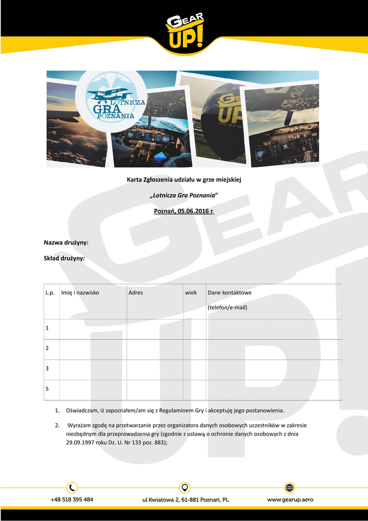 Karta Zgłoszenia udziału w grze miejskiej „Lotnicza Gra Poznania” Poznań, 05.06.2016 r. Nazwa drużyny: Skład drużyny: L.p. Imię i nazwisko Adres wiek Dane kontaktowe (telefon/e-mail) 1 2 3 5 1. Oświadczam, iż zapoznałem/am się z Regulaminem Gry i akceptuję jego postanowienia. 2. Wyrażam zgodę na przetwarzanie przez organizatora danych osobowych uczestników w zakresie niezbędnym dla przeprowadzenia gry (zgodnie z ustawą o ochronie danych osobowych z dnia 29.09.1997 roku Dz. U. Nr 133 poz. 883); 3. Wyrażam zgodę na opublikowanie przez organizatora na łamach stron internetowych, portali społecznościowych oraz w informacjach medialnych wizerunku uczestnika, oraz w uzasadnionym przypadku imienia i nazwiska uczestnika. ……………………………………………. miejscowość, data …...................................... …....................................... …....................................... …...................................... …...................................... podpisy członków drużyny Organizator nie ponosi odpowiedzialności za bezpieczeństwo uczestników w trakcie trwania gry miejskiej. Niniejszą wypełnioną kartę należy dostarczyć mailowo do dnia 03.06.2016 r. na adres : [email protected] . WYRAŻENIE ZGODY NA UDZIAŁ OSÓB NIEPEŁNOLETNICH Prosimy o wypełnienie przez opiekunów prawnych niepełnoletnich uczestników gry: Ja, niżej podpisany/podpisana………………………………………………(imię i nazwisko), urodzony/urodzona ……………………………………………… (data i miejsce urodzenia), legitymujący się dokumentem……………………………………… (wpisać rodzaj, serię i numer dokumentu), wyrażam zgodę na udział mojego syna/mojej córki w grze miejskiej pt. Lotnicza Gra Poznania”, która odbędzie się 5 czerwca 2016 roku na terenie miasta Poznania. Udział w grze polegać będzie na zespołowym poruszaniu się w obrębie miasta oraz na wykonywaniu następujących po sobie zadań. Ponadto oświadczam, iż zapoznałam się / zapoznałam się z regulaminem gry miejskiej „Lotnicza Gra Poznania”, akceptuję wszystkie jego postanowienia i biorę na siebie odpowiedzialność za udział dziecka w grze. ………………………………………………………. podpis