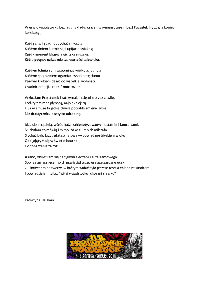 Wiersz o woodstocku bez ładu i składu, czasem z rymem czasem bez! Początek liryczny a koniec komiczny ;) Każdą chwilą żyd i oddychad miłością Każdym dniem karmid się i upijad przyjaźnią Każdy moment błogosławid taką muzyką, Która połączy najważniejsze wartości człowieka. Każdym tchnieniem wspominad wielkośd jedności Każdym spojrzeniem ogarniad wspólnotę tłumu Każdym krokiem dążyd do wszelkiej wolności Uwolnid emocji, stłumid moc rozumu Wybrałam Przystanek i zatrzymałam się nim przez chwilę, I odkryłam moc płynącą, najpiękniejszą I już wiem, że ta jedna chwila potrafiła zmienid życie Nie drastycznie, lecz tylko odrobinę. Idąc ciemną aleją, wśród ludzi zahipnotyzowanych ostatnimi koncertami, Słuchałam co mówią i mimo, że wielu z nich milczało Słychad było krzyk ekstazy i słowa wypowiadane błyskiem w oku Odbijającym się w świetle latarni: Do zobaczenia za rok... A rano, obudziłam się na tylnym siedzeniu auta Kamowego Spojrzałam na ręce moich przyjaciół przecierające zaspane oczy Z uśmiechem na twarzy, w którym widad było jeszcze resztki chleba ze smalcem I powiedziałam tylko: "witaj woodstocku, chce mi się siku" Katarzyna Haławin