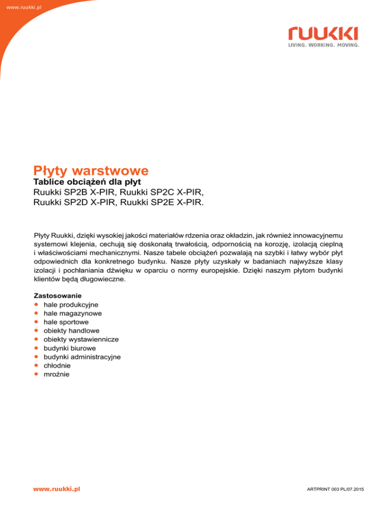 www.ruukki.pl Płyty warstwowe Tablice obciążeń dla płyt Ruukki SP2B X-PIR, Ruukki SP2C X-PIR, Ruukki SP2D X-PIR, Ruukki SP2E X-PIR. Płyty Ruukki, dzięki wysokiej jakości materiałów rdzenia oraz okładzin, jak również innowacyjnemu systemowi klejenia, cechują się doskonałą trwałością, odpornością na korozję, izolacją cieplną i właściwościami mechanicznymi. Nasze tabele obciążeń pozwalają na szybki i łatwy wybór płyt odpowiednich dla konkretnego budynku. Nasze płyty uzyskały w badaniach najwyższe klasy izolacji i pochłaniania dźwięku w oparciu o normy europejskie. Dzięki naszym płytom budynki klientów będą długowieczne. Zastosowanie hale produkcyjne hale magazynowe hale sportowe obiekty handlowe obiekty wystawiennicze budynki biurowe budynki administracyjne chłodnie mroźnie www.ruukki.pl ARTPRINT 003 PL/07.2015 Płyty warstwowe X-PIR • Tablice obciążeń Spis treści Maksymalne dopuszczalne obciążenie śniegiem [kN/m²] dla danej długości przęsła z płyt Ruukki SP2C 160/120 X-PIR... 21 Objaśnienia do tablic.......................................................... 3 Podział na grupy kolorystyczne......................................... 3 Maksymalne dopuszczalne ssanie wiatru [kN/m²] dla danej długości przęsła z płyt Ruukki SP2C 160/120 X-PIR......... 22 Wytyczne stosowania płyt w okładzinach w kolorach ciemnych............................................................................ 4 Maksymalne dopuszczalne obciążenie śniegiem [kN/m²] dla danej długości przęsła z płyt Ruukki SP2C 210/170 X-PIR... 23 Wytyczne stosowania płyt z okładzinami gładkimi............. 4 Maksymalne dopuszczalne parcie wiatru [kN/m²] dla danej długości przęsła z płyt Ruukki SP2B40 X-PIR................... 5 Maksymalne dopuszczalne ssanie wiatru [kN/m²] dla danej długości przęsła z płyt Ruukki SP2B40 X-PIR................... 6 Maksymalne dopuszczalne parcie wiatru [kN/m²] dla danej długości przęsła z płyt Ruukki SP2B60 X-PIR................... 7 Maksymalne dopuszczalne ssanie wiatru [kN/m²] dla danej długości przęsła z płyt Ruukki SP2B60 X-PIR................... 8 Maksymalne dopuszczalne parcie wiatru [kN/m²] dla danej długości przęsła z płyt Ruukki SP2B80 X-PIR................... 9 Maksymalne dopuszczalne ssanie wiatru [kN/m²] dla danej długości przęsła z płyt Ruukki SP2B80 X-PIR................... 10 Maksymalne dopuszczalne parcie wiatru [kN/m²] dla danej długości przęsła z płyt Ruukki SP2B100 X-PIR................ 11 Maksymalne dopuszczalne ssanie wiatru [kN/m²] dla danej długości przęsła z płyt Ruukki SP2B100 X-PIR................. 12 Maksymalne dopuszczalne obciążenie śniegiem [kN/m²] dla danej długości przęsła z płyt Ruukki SP2C 80/40 X-PIR 13 Maksymalne dopuszczalne ssanie wiatru [kN/m²] dla danej długości przęsła z płyt Ruukki SP2C 80/40 X-PIR............. 14 Maksymalne dopuszczalne obciążenie śniegiem [kN/m²] dla danej długości przęsła z płyt Ruukki SP2C 100/60 X-PIR... 15 Maksymalne dopuszczalne ssanie wiatru [kN/m²] dla danej długości przęsła z płyt Ruukki SP2C 100/60 X-PIR........... 16 Maksymalne dopuszczalne obciążenie śniegiem [kN/m²] dla danej długości przęsła z płyt Ruukki SP2C 120/80 X-PIR... 17 Maksymalne dopuszczalne ssanie wiatru [kN/m²] dla danej długości przęsła z płyt Ruukki SP2C 120/80 X-PIR........... 18 Maksymalne dopuszczalne obciążenie śniegiem [kN/m²] dla danej długości przęsła z płyt Ruukki SP2C 140/100 X-PIR... 19 Maksymalne dopuszczalne ssanie wiatru [kN/m²] dla danej długości przęsła z płyt Ruukki SP2C 140/100 X-PIR......... 20 Maksymalne dopuszczalne ssanie wiatru [kN/m²] dla danej długości przęsła z płyt Ruukki SP2C 210/170 X-PIR......... 24 Maksymalne dopuszczalne parcie wiatru [kN/m²] dla danej długości przęsła z płyt Ruukki SP2D60 X-PIR................... 25 Maksymalne dopuszczalne ssanie wiatru [kN/m²] dla danej długości przęsła z płyt Ruukki SP2D60 X-PIR................... 26 Maksymalne dopuszczalne parcie wiatru [kN/m²] dla danej długości przęsła z płyt Ruukki SP2D80 X-PIR................... 27 Maksymalne dopuszczalne ssanie wiatru [kN/m²] dla danej długości przęsła z płyt Ruukki SP2D80 X-PIR................... 28 Maksymalne dopuszczalne parcie wiatru [kN/m²] dla danej długości przęsła z płyt Ruukki SP2D100 X-PIR................. 29 Maksymalne dopuszczalne ssanie wiatru [kN/m²] dla danej długości przęsła z płyt Ruukki SP2D100 X-PIR................. 30 Maksymalne dopuszczalne parcie wiatru [kN/m²] dla danej długości przęsła z płyt Ruukki SP2D120 X-PIR................. 31 Maksymalne dopuszczalne ssanie wiatru [kN/m²] dla danej długości przęsła z płyt Ruukki SP2D120 X-PIR................. 32 Maksymalne dopuszczalne parcie wiatru [kN/m²] dla danej długości przęsła z płyt Ruukki SP2E120 X-PIR................. 33 Maksymalne dopuszczalne ssanie wiatru [kN/m²] dla danej długości przęsła z płyt Ruukki SP2E120 X-PIR................. 34 Maksymalne dopuszczalne parcie wiatru [kN/m²] dla danej długości przęsła z płyt Ruukki SP2E160 X-PIR................. 35 Maksymalne dopuszczalne ssanie wiatru [kN/m²] dla danej długości przęsła z płyt Ruukki SP2E160 X-PIR................. 36 Maksymalne dopuszczalne parcie wiatru [kN/m²] dla danej długości przęsła z płyt Ruukki SP2E180 X-PIR................. 37 Maksymalne dopuszczalne ssanie wiatru [kN/m²] dla danej długości przęsła z płyt Ruukki SP2E180 X-PIR................. 38 Maksymalne dopuszczalne parcie wiatru [kN/m²] dla danej długości przęsła z płyt Ruukki SP2E200 X-PIR................. 39 Maksymalne dopuszczalne ssanie wiatru [kN/m²] dla danej długości przęsła z płyt Ruukki SP2E200 X-PIR................. 40 Płyty warstwowe X-PIR • Tablice obciążeń Objaśnienia do tablic Opracowane tablice są poprawne dla płyt ściennych w profilowaniu liniowym i mikr