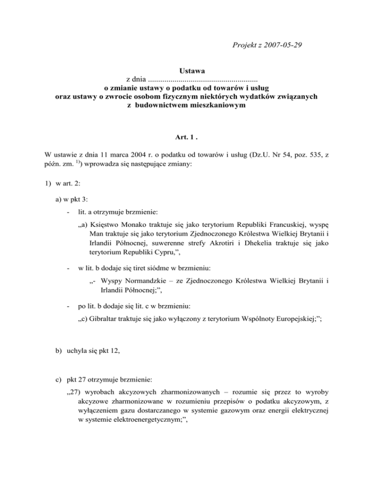 Projekt z 2007-05-29 Ustawa z dnia ...................................................... o zmianie ustawy o podatku od towarów i usług oraz ustawy o zwrocie osobom fizycznym niektórych wydatków związanych z budownictwem mieszkaniowym Art. 1 . W ustawie z dnia 11 marca 2004 r. o podatku od towarów i usług (Dz.U. Nr 54, poz. 535, z późn. zm. 1)) wprowadza się następujące zmiany: 1) w art. 2: a) w pkt 3: - lit. a otrzymuje brzmienie: „a) Księstwo Monako traktuje się jako terytorium Republiki Francuskiej, wyspę Man traktuje się jako terytorium Zjednoczonego Królestwa Wielkiej Brytanii i Irlandii Północnej, suwerenne strefy Akrotiri i Dhekelia traktuje się jako terytorium Republiki Cypru,”, - w lit. b dodaje się tiret siódme w brzmieniu: „- Wyspy Normandzkie – ze Zjednoczonego Królestwa Wielkiej Brytanii i Irlandii Północnej;”, - po lit. b dodaje się lit. c w brzmieniu: „c) Gibraltar traktuje się jako wyłączony z terytorium Wspólnoty Europejskiej;”; b) uchyla się pkt 12, c) pkt 27 otrzymuje brzmienie: „27) wyrobach akcyzowych zharmonizowanych – rozumie się przez to wyroby akcyzowe zharmonizowane w rozumieniu przepisów o podatku akcyzowym, z wyłączeniem gazu dostarczanego w systemie gazowym oraz energii elektrycznej w systemie elektroenergetycznym;”, d) dodaje się pkt 30 w brzmieniu: „30) wartości rynkowej – rozumie się przez to całkowitą kwotę jaką, w celu uzyskania w danym momencie danych towarów lub usług, nabywca lub usługobiorca na takim samym etapie sprzedaŜy jak ten, na którym dokonywana jest dostawa towarów lub świadczenie usług, musiałby, w warunkach uczciwej konkurencji, zapłacić niezaleŜnemu dostawcy lub usługodawcy na terytorium kraju. W przypadku, gdy nie moŜna ustalić porównywalnej dostawy towarów lub świadczenia usług, przez wartość rynkową rozumie się: a) w odniesieniu do towarów – kwotę nie mniejszą niŜ cena nabycia towarów lub towarów podobnych, a w przypadku braku ceny nabycia, koszt wytworzenia, określone w momencie dostawy, b) w odniesieniu do usług – kwotę nie mniejszą niŜ całkowita kwota wydatków poniesionych przez podatnika na wykonanie tych usług.”; 2) w art. 7 w ust. 4 pkt 2 otrzymuje brzmienie: „2) których przekazania nie ujęto w ewidencji, o której mowa w pkt 1, jeŜeli wartość rynkowa przekazanego towaru nie przekracza 5 zł.”; 3) w art. 8 ust. 3 otrzymuje brzmienie: „3. Usługi wymienione w klasyfikacjach wydanych na podstawie przepisów o statystyce publicznej są identyfikowane za pomocą tych klasyfikacji, z wyjątkiem usług elektronicznych i usług turystyki, o których mowa w art. 119.”; 4) w art. 10: a) w ust. 1 w pkt 2 myślnik otrzymuje brzmienie: „- jeŜeli całkowita wartość wewnątrzwspólnotowego nabycia towarów na terytorium kraju nie przekroczyła w trakcie roku podatkowego kwoty 50.000 zł.”, b) uchyla się ust. 9; 5) w art. 23 ust. 10 otrzymuje brzmienie: „10. Przeliczenia kwot, o których mowa w ust. 2 i 3, dokonuje się według ogłoszonego przez Narodowy Bank Polski średniego kursu waluty, w której, w państwie członkowskim przeznaczenia, kwoty te są ustalane, obowiązującego na dzień 1 maja 2004 roku, w zaokrągleniu do 1000 zł.”; 2 6) w art. 24 a) ust. 2 otrzymuje brzmienie: „2. W przypadku sprzedaŜy wysyłkowej na terytorium kraju dostawę towarów uznaje się za dokonaną poza terytorium kraju, jeŜeli całkowita wartość towarów innych niŜ wyroby akcyzowe zharmonizowane, wysyłanych lub transportowanych z tego samego państwa członkowskiego na terytorium kraju, pomniejszona o kwotę podatku od wartości dodanej, nie przekroczyła w roku podatkowym kwoty 160.000 zł.”, b) ust. 3 otrzymuje brzmienie: „3. Przepis ust. 2 stosuje się pod warunkiem, Ŝe całkowita wartość towarów innych niŜ wyroby akcyzowe zharmonizowane, wysyłanych lub transportowanych z tego samego państwa członkowskiego w ramach sprzedaŜy wysyłkowej na terytorium kraju, pomniejszona o kwotę podatku od wartości dodanej, nie przekroczyła w poprzednim roku podatkowym kwoty 160.000 zł.”, c) uchyla się ust. 13; 7) w art. 29: a) ust. 3 otrzymuje brzmienie: „3. JeŜeli naleŜność jest określona w naturze, podstawą opodatkowania jest wartość rynkowa świadczenia pomniejszona o podatek.”, b) ust. 9 otrzymuje brzmienie: „9. W przypadku wykonania czynności, o których mowa w art. 5, dla których nie została określona cena, podstawą opodatkowania jest wartość rynkowa towarów lub usług pomniejszona o kwotę naleŜnego podatku, z zastrzeŜeniem ust. 10 i 12.”, c) ust. 10 otrzymuje brzmienie: „10. W przypadku dostawy towarów, o której mowa w art. 7 ust. 2, podstawą opodatkowania jest cena nabycia towarów, pomniejszona o kwotę podatku, a gdy cena nabycia nie istnieje, koszt wytworzenia, określone w momencie dostawy tych towarów.”; 3 8) w art. 32: a) ust. 1 otrzymuje brzmienie: „1. W przypadku gdy między nabywcą a dokonującym dostawy towarów lub usługodawcą istnieje związek organ podatkowy określa wysokość obrotu na podstawie wartości rynkowej, pomniejszonej o podatek, jeŜeli okaŜe się, Ŝe związek ten miał wpływ na ustalenie wynagrodzenia.”, b) po ust. 1 dodaje się ust. 1a w brzmieniu: „1a. Przepis ust. 1 stosuje się w przypadku, gdy wynagrodzenie jest: 1) niŜsze od wartości rynkowej, a nabywca towarów lub usług nie ma zgodnie z art. 86, art. 88, art. 90 oraz z przepisami wydanymi na podstawie art. 92 ust. 1 pkt 2 i ust. 3 pełnego prawa do obniŜenia kwoty podatku naleŜnego o kwotę podatku naliczonego, 2) niŜsze od wartości rynkowej, a dokonujący dostawy towarów lub usługodawca nie ma zgodnie z art. 86, art. 88, art. 90 oraz z przepisami wydanymi na podstawie art. 92 ust. 1 pkt 2 i ust. 3 pełnego prawa do obniŜenia kwoty podatku naleŜnego o kwotę podatku naliczonego, a dostawa towarów lub świadczenie usług są zwolnione od podatku, 3) wyŜsze od wart