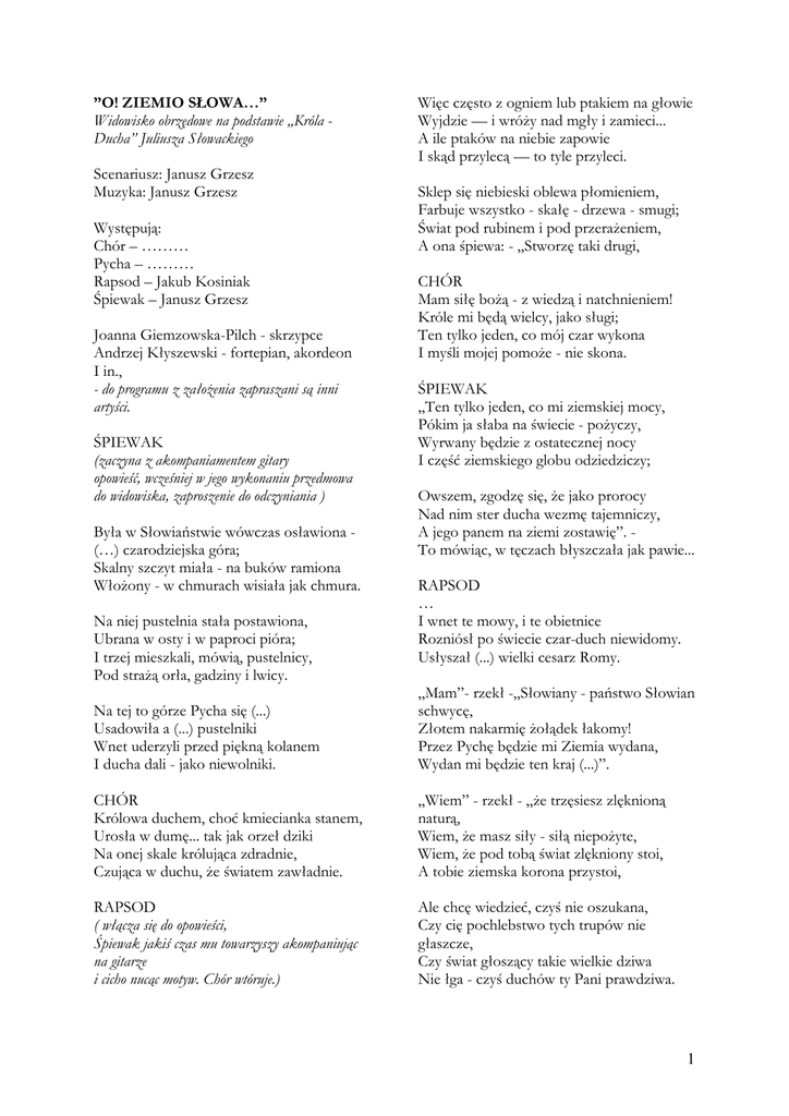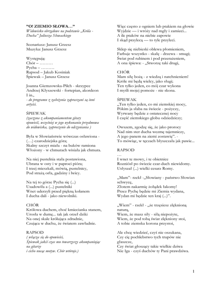 ”O! ZIEMIO SŁOWA…” Widowisko obrzędowe na podstawie „Króla Ducha” Juliusza Słowackiego Scenariusz: Janusz Grzesz Muzyka: Janusz Grzesz Występują: Chór – ……… Pycha – ……… Rapsod – Jakub Kosiniak Śpiewak – Janusz Grzesz Joanna Giemzowska-Pilch - skrzypce Andrzej Kłyszewski - fortepian, akordeon I in., - do programu z założenia zapraszani są inni artyści. ŚPIEWAK (zaczyna z akompaniamentem gitary opowieść, wcześniej w jego wykonaniu przedmowa do widowiska, zaproszenie do odczyniania ) Była w Słowiaństwie wówczas osławiona (…) czarodziejska góra; Skalny szczyt miała - na buków ramiona Włożony - w chmurach wisiała jak chmura. Na niej pustelnia stała postawiona, Ubrana w osty i w paproci pióra; I trzej mieszkali, mówią, pustelnicy, Pod strażą orła, gadziny i lwicy. Więc często z ogniem lub ptakiem na głowie Wyjdzie — i wróży nad mgły i zamieci... A ile ptaków na niebie zapowie I skąd przylecą — to tyle przyleci. Sklep się niebieski oblewa płomieniem, Farbuje wszystko - skałę - drzewa - smugi; Świat pod rubinem i pod przerażeniem, A ona śpiewa: - „Stworzę taki drugi, CHÓR Mam siłę bożą - z wiedzą i natchnieniem! Króle mi będą wielcy, jako sługi; Ten tylko jeden, co mój czar wykona I myśli mojej pomoże - nie skona. ŚPIEWAK „Ten tylko jeden, co mi ziemskiej mocy, Pókim ja słaba na świecie - pożyczy, Wyrwany będzie z ostatecznej nocy I część ziemskiego globu odziedziczy; Owszem, zgodzę się, że jako prorocy Nad nim ster ducha wezmę tajemniczy, A jego panem na ziemi zostawię”. To mówiąc, w tęczach błyszczała jak pawie... RAPSOD … I wnet te mowy, i te obietnice Rozniósł po świecie czar-duch niewidomy. Usłyszał (...) wielki cesarz Romy. Na tej to górze Pycha się (...) Usadowiła a (...) pustelniki Wnet uderzyli przed piękną kolanem I ducha dali - jako niewolniki. „Mam”- rzekł -„Słowiany - państwo Słowian schwycę, Złotem nakarmię żołądek łakomy! Przez Pychę będzie mi Ziemia wydana, Wydan mi będzie ten kraj (...)”. CHÓR Królowa duchem, choć kmiecianka stanem, Urosła w dumę... tak jak orzeł dziki Na onej skale królująca zdradnie, Czująca w duchu, że światem zawładnie. „Wiem” - rzekł - „że trzęsiesz zlęknioną naturą, Wiem, że masz siły - siłą niepożyte, Wiem, że pod tobą świat zlękniony stoi, A tobie ziemska korona przystoi, RAPSOD ( włącza się do opowieści, Śpiewak jakiś czas mu towarzyszy akompaniując na gitarze i cicho nucąc motyw. Chór wtóruje.) Ale chcę wiedzieć, czyś nie oszukana, Czy cię pochlebstwo tych trupów nie głaszcze, Czy świat głoszący takie wielkie dziwa Nie łga - czyś duchów ty Pani prawdziwa. 1 ŚPIEWAK „Oto dzień jeden uczyń to na ziemi, Aby sen-urok spadł na kraj Popiela! Niech go samego twoja moc oniemi Uśpi a z duchem ciała nie rozdziela; Niech posągami staną się pięknemi Królewny - z twarzy nie stracą wesela Ani ładności, ni łez, które leją; Niechaj nie umrą - ale skamienieją... CHÓR „Niech będzie żywot ale zatrzymany I pomóc sobie uczynkiem bezsilny; Niech jego wojsko tak zaśnie - i pany, I ten, kto mu wróg - i ten, kto przychylny! RAPSOD Rzekł.. a Pycha się nie posiadła w sobie Z wielkiej radości - i rzekła: - „Pod zorzę Ujrzysz mię tutaj w płomiennej osobie, Hymn śpiewającą, którym świat zamrożę. Sen taki rzucę - i czar taki zrobię, Że nawet duchy drzew zastygną w korze, Nawet lecące z tęczą malowaną Strumienie - ze skał spadające - staną PYCHA (śpiewa z akompaniamentem fortepianu i skrzypiec, w tle sekunduje jej głos Śpiewaka) „Ja sama rzucę czar - i zdejmę sama, Skoroć przekonam, żem uczynić mocna. Przeze mnie wyjście jest ze snu i brama, Ja na sen świecę - jak gwiazda północna!” I tam runianych głosów próbowała, Wprzód cicho, potem głośniej - nad szum drzewa;... Myślałbyś, że to pod niebiosy skała, A w skale tej trup niewidzialny śpiewa. Taka pieśń ciężka, podziemna, wspaniała. Kamienne góry napełniła trzewa... Taki słów ciężar - ołowianość - siła Strach - a to jeszcze tylko próba była... „Jak oszust wszedłem w nieświęte przymierze, (Powiada cicho Pan martwego Rzyma) - Śmiercią sam jestem i snem - a czar dziki, Sen i śmierć ducha - mam za pomocniki. „Więc może mię strach jaki wielki zdziwi” Gdy będę rznął te ludzie nieruchome; Może się Pan Bóg sam wielki sprzeciwi I swe oblicze pokaże widome Może miecz w trupie tak jak ołów skrzywi, Może przed mury przyprowadzi strome, A wieże - boską ruszone komendą Staną - mieczów ognistych dobędą. „Cokolwiek ma być - senne czy nie senne, Dzisiaj - przed nocą z wojskami napadnę, Bo mi to państwo powinno być lenne, I poprzeć moje chęci światowładne”. Natura się już gotowała zasnąć Wespół z uśpionym w narodach żywotem Wszystko się wielkiej odbywało ciszy, Zbrodnia się działa w duchu - sam Bóg słyszy… RAPSOD O! ziemio Słowa - niczym niepożyta, Zwyciężająca - nawet one zdrady, Które w powietrzu duch od duchów chwyta, A wykonywa w ciele szatan blady Pozwól, że powiem, jak snem upowita, Pięknaś ty była... bez znaku zagłady Na twoim ciele, owszem, zamyślona, Owszem, piękniejsza jeszcze, gdy uśpiona!... (Po tych słowach „I zbiór” utworów do tekstów innych autorów wg ustalonego scenariusza) CHÓR Ten, kto się jadu w żywocie nabierze, Straszny jest we śnie - mgła go kryć powinna; Ale śpi pięknie - dziecko, póki świeże, Młoda dziewica, dopóki niewinna. Dopóki anioł snu ludzkiego strzeże, Dźwięcznie na lirach gra piosenka gminna, A straszny anioł, co jest ludu wiarą, Stoi z płomiennym mieczem za kotarą. 2 RAPSOD Dopóki światła w duchu nie wyżarły Duchy żądz - ogień miotając przeciwny, Piękny jest śpiący - chociażby umarły, Piękny- i w swojej piękności przedziwny... Niech ludzie zobaczą To ziarno męki.............. 