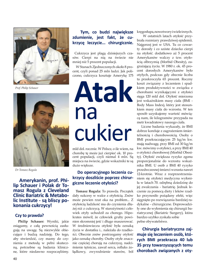 Tym, co budzi największe zdumienie, jest fakt, że cukrzycę leczycie... chirurgicznie. Cukrzyca jest plagą dzisiejszych czasów. Cierpi na nią na świecie nie mniej niż 5 procent populacji. W Stanach Zjednoczonych około 8 procent, czyli ponad 25 mln ludzi. Jak policzono, cukrzyca kosztuje Amerykę 175 Prof. Philip Schauer Atak na cukier mld dol. rocznie. W Polsce, o ile wiem, na chorobę tę może już cierpieć ok. 10 procent populacji, czyli niemal 4 mln. Są miejsca na świecie, gdzie wskaźniki te są dużo większe. Dr Tomasz Rogula Do operacyjnego leczenia cukrzycy doszliście poprzez chirurAmerykanin, prof. Phi- giczne leczenie otyłości? lip Schauer i Polak dr Tomasz Rogula z Cleveland Clinic Bariatric & Metabolic Institute - są bliscy pokonania cukrzycy! Czy to prawda? Philip Schauer: Wyniki, jakie osiągamy, z całą pewnością zasługują na uwagę. Są niezwykle obiecujące i budzą nadzieję. Do tego, aby stwierdzić, czy mamy do czynienia z metodą w pełni skuteczną, potrzebne są badania kliniczne, które niedawno rozpoczęliśmy. 40 Tomasz Rogula: To prawda. Początek dały sukcesy w walce z otyłością. Znów może pewien rzut oka na problem... Z otyłością ludzkość ma do czynienia dłużej niż z cukrzycą. W starożytności człowiek otyły uchodził za chorego. Hipokrates mówił, że człowiek gruby powinien skromniej jeść i długo maszerować. W średniowieczu otyłość była oznaką życia w dostatku i... należała do rzadkości. Obecnie znów postrzegamy otyłość jako oznakę choroby. Osoby otyłe znacznie częściej chorują na cukrzycę, nadciśnienie tętnicze, zawał serca, refluks żołądkowy, zwyrodnienie stawów, ból kręgosłupa, nowotwory i wiele innych. W ostatnich latach otyłość przybrała rozmiary prawdziwej epidemii. Najgorzej jest w USA. Tu co czwarty dorosły i co szóste dziecko cierpi na otyłość. dodatkowo aż 5 procent Amerykanów walczy z tzw. otyłością olbrzymią (Morbid Obesity), zagrażającą życiu. W 1980 r. ok. 45 procent dorosłych Amerykanów było otyłych, podczas gdy obecnie liczba ta przekroczyła 65 procent. Roczny koszt związany z leczeniem i spadkiem produktywności w związku z chorobami wynikającymi z otyłości sięga 120 mld dol. Otyłość mierzona jest wskaźnikiem masy ciała (BMI Body Mass Index), który jest stosunkiem masy ciała do wzrostu. W ten sposób uzyskujemy wartość mówiącą nam, ile kilogramów przypada na metr kwadratowy naszego ciała. Liczne badania wykazały, że BMI dobrze koreluje z zagrożeniem śmiertelnością i chorobowością. Osoby o BMI przekraczającym 25 kg/m kw. mają nadwagę, przy BMI od 30 kg/m kw. mówimy o otyłości, a przy BMI 40 o otyłości chorobowej (Morbid Obesity). Otyłość zwiększa ryzyko zgonu proporcjonalnie do wzrostu wskaźnika BMI. U osób z BMI 40 ryzyko przedwczesnej śmierci wzrasta nawet 12-krotnie. Wraz z rozprzestrzenianiem się otyłości medycyna wyłoniła w latach 70. odrębną dziedzinę do jej zwalczania - bariatrię. Jednak leczenie za pomocą diety i leków rzadko przynosiło pożądany efekt, więc sięgnięto po rozwiązania bardziej radykalne - chirurgiczne. Doprowadziły one do wyłonienia się chirurgii bariatrycznej (Bariatric Surgery), która bardzo szybko zyskała sobie pełne obywatelstwo. Chirurgia bariatryczna zajmuje się leczeniem osób, których BMI przekracza 40 lub 35 przy towarzyszących temu chorobach związanych z oty- łością. Już w 1983 r. powstało American Society for Bariatric Surgery (ASBS). Jakie były motywy? Philip Schauer: Profesjonalne. Chcieliśmy kreować własną art of science, sztukę nauki medycznej, co jest zawsze drogą postępu i rozwoju. Na początku było nas w ASBS nieco ponad stu. Dziś, w 2008 r., mamy już 3 tys. członków! Problem otyłości w Stanach i na całym świecie dramatycznie rośnie. Jesteśmy prominentnym gronem w leczeniu tej epidemii. Już w 1991 r. doprowadziliście do uznania, że jedyną skuteczną metodą trwałego pozbycia się zbędnych kilogramów jest leczenie operacyjne. ją znaczną utratę masy ciała - z uwagi na zmniejszony żołądek pacjent nie jest w stanie dużo zjeść, a spożyty pokarm wchłania się znacznie wolniej. Pacjenci zwracają uwagę na wyraźne ograniczenie apetytu po tej operacji. Jest to związane z wyłączeniem części żołądka produkującej hormon pobudzający apetyt - grelinę. Zabiegi te wykonywane są obecnie niemal w 100 procentach laparoskopowo. Poprzez niewielkie nacięcia wprowadza się specjalne narzędzia, którymi chirurg operuje, i małą kamerę telewizyjną pozwalającą widzieć na ekranie monitorów, co się dzieje w polu operacyjnym, a dzięki Philip Schauer: Źródłem tej konstatacji jest fakt, iż większość pacjentów po upływie kilku lat zmagań dietetycznych czy farmakologicznych wraca do swojej wagi lub tyje jeszcze bardziej. Nic zatem dziwnego, że w 1991 r. uznano metody chirurgiczne za jedyne skuteczne. Sztandarową, najczęściej przez was wykonywaną operacją bariatryczną jest zespolenie omijające żołądek, Rouxen-Y Gastric Bypass, czyli tzw. bajpas gastryczny. Tomasz Rogula: Operacja polega na wytworzeniu z żołądka niewielkiego zbiornika. Pozostałe prawie 90 procent żołądka pozostaje wyłączone z trawienia. Pokarm najpierw trafia do tego zbiornika żołądkowego, a następnie, poprzez bajpas, do jelita cienkiego. Trawienie następuje dopiero po przejściu około 150 cm początkowej długości jelita. Prowadzi to do zmniejszenia ilości przyjmowanego pokarmu i ograniczenia jego wchłaniania. Te dwa efekty powodu- Foto: Galeria współistniejących z otyłością, przede wszystkim cukrzyca, hiperlipidemia, nadciśnienie, bezdech senny, zwyrodnienie stawów, bóle kręgosłupa oraz podwyższony poziomu cholesterolu, całkowicie ustępuje lub stan zdrowia znacząco się poprawia. Te obserwacje podobno skłoniły pana profesora do zaproponowania zmiany nazwy waszego towarzystwa popr