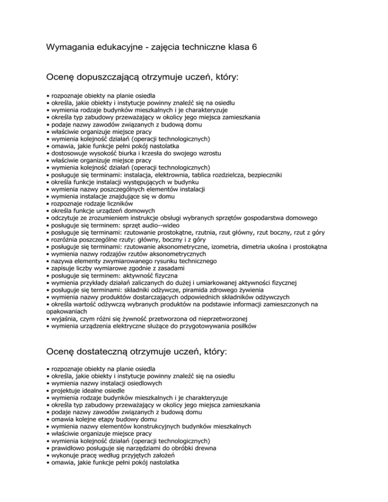 Wymagania edukacyjne - zajęcia techniczne klasa 6 Ocenę dopuszczającą otrzymuje uczeń, który: • rozpoznaje obiekty na planie osiedla • określa, jakie obiekty i instytucje powinny znaleźć się na osiedlu • wymienia rodzaje budynków mieszkalnych i je charakteryzuje • określa typ zabudowy przeważający w okolicy jego miejsca zamieszkania • podaje nazwy zawodów związanych z budową domu • właściwie organizuje miejsce pracy • wymienia kolejność działań (operacji technologicznych) • omawia, jakie funkcje pełni pokój nastolatka • dostosowuje wysokość biurka i krzesła do swojego wzrostu • właściwie organizuje miejsce pracy • wymienia kolejność działań (operacji technologicznych) • posługuje się terminami: instalacja, elektrownia, tablica rozdzielcza, bezpieczniki • określa funkcje instalacji występujących w budynku • wymienia nazwy poszczególnych elementów instalacji • wymienia instalacje znajdujące się w domu • rozpoznaje rodzaje liczników • określa funkcje urządzeń domowych • odczytuje ze zrozumieniem instrukcje obsługi wybranych sprzętów gospodarstwa domowego • posługuje się terminem: sprzęt audio--wideo • posługuje się terminami: rzutowanie prostokątne, rzutnia, rzut główny, rzut boczny, rzut z góry • rozróżnia poszczególne rzuty: główny, boczny i z góry • posługuje się terminami: rzutowanie aksonometryczne, izometria, dimetria ukośna i prostokątna • wymienia nazwy rodzajów rzutów aksonometrycznych • nazywa elementy zwymiarowanego rysunku technicznego • zapisuje liczby wymiarowe zgodnie z zasadami • posługuje się terminem: aktywność fizyczna • wymienia przykłady działań zaliczanych do dużej i umiarkowanej aktywności fizycznej • posługuje się terminami: składniki odżywcze, piramida zdrowego żywienia • wymienia nazwy produktów dostarczających odpowiednich składników odżywczych • określa wartość odżywczą wybranych produktów na podstawie informacji zamieszczonych na opakowaniach • wyjaśnia, czym różni się żywność przetworzona od nieprzetworzonej • wymienia urządzenia elektryczne służące do przygotowywania posiłków Ocenę dostateczną otrzymuje uczeń, który: • rozpoznaje obiekty na planie osiedla • określa, jakie obiekty i instytucje powinny znaleźć się na osiedlu • wymienia nazwy instalacji osiedlowych • projektuje idealne osiedle • wymienia rodzaje budynków mieszkalnych i je charakteryzuje • określa typ zabudowy przeważający w okolicy jego miejsca zamieszkania • podaje nazwy zawodów związanych z budową domu • omawia kolejne etapy budowy domu • wymienia nazwy elementów konstrukcyjnych budynków mieszkalnych • właściwie organizuje miejsce pracy • wymienia kolejność działań (operacji technologicznych) • prawidłowo posługuje się narzędziami do obróbki drewna • wykonuje pracę według przyjętych założeń • omawia, jakie funkcje pełni pokój nastolatka • dostosowuje wysokość biurka i krzesła do swojego wzrostu • rysuje plan własnego pokoju • projektuje wnętrze pokoju swoich marzeń • właściwie organizuje miejsce pracy • wymienia kolejność działań (operacji technologicznych) • prawidłowo posługuje się narzędziami do obróbki papieru • wykonuje pracę według przyjętych założeń • posługuje się terminami: instalacja, elektrownia, tablica rozdzielcza, bezpieczniki • określa funkcje instalacji występujących w budynku • wymienia nazwy poszczególnych elementów instalacji • omawia rodzaje elektrowni i tłumaczy, co jest w nich źródłem zasilania • nazywa elementy obwodów elektrycznych • buduje obwód elektryczny według schematu • wymienia instalacje znajdujące się w domu • rozpoznaje rodzaje liczników • prawidłowo odczytuje wskazania liczników • przeprowadza pomiary zużycia prądu, wody i gazu w określonym czasie • określa funkcje urządzeń domowych • odczytuje ze zrozumieniem instrukcje obsługi wybranych sprzętów gospodarstwa domowego • omawia budowę wybranych urządzeń AGD • wymienia zagrożenia związane z nieodpowiednią eksploatacją sprzętu gospodarstwa domowego • posługuje się terminem: sprzęt audio--wideo • określa zastosowanie urządzeń audio--wideo w domu • posługuje się terminami: rzutowanie prostokątne, rzutnia, rzut główny, rzut boczny, rzut z góry • rozróżnia poszczególne rzuty: główny, boczny i z góry • stosuje odpowiednie linie do zaznaczania konturów rzutowanych brył • wykonuje rzutowanie prostych brył geometrycznych, • posługuje się terminami: rzutowanie aksonometryczne, izometria, dimetria ukośna i prostokątna • wymienia nazwy rodzajów rzutów aksonometrycznych • omawia kolejne etapy przedstawiania brył w rzutach aksonometrycznych • określa, na czym polega rzutowanie aksonometryczne • nazywa elementy zwymiarowanego rysunku technicznego • zapisuje liczby wymiarowe zgodnie z zasadami • prawidłowo stosuje linie, znaki i liczby wymiarowe • wymiaruje rysunki brył • posługuje się terminem: aktywność fizyczna • wymienia przykłady działań zaliczanych do dużej i umiarkowanej aktywności fizycznej • wyjaśnia, jaki wpływ na organizm człowieka ma aktywność fizyczna • opracowuje poradnik, w którym zachęca rówieśników do aktywności fizycznej • posługuje się terminami: składniki odżywcze, piramida zdrowego żywienia • wymienia nazwy produktów dostarczających odpowiednich składników odżywczych • określa wartość odżywczą wybranych produktów na podstawie informacji zamieszczonych na opakowaniach • przedstawia zasady właściwego odżywiania według piramidy zdrowego żywienia • ustala, które produkty powinny być podstawą diety • układa menu, zachowując wytyczne dotyczące wartości kalorycznej • wyjaśnia, czym różni się żywność przetworzona od nieprzetworzonej • wymienia naz