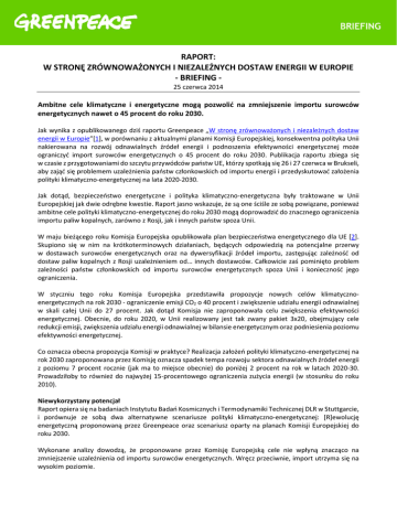 RAPORT: W STRONĘ ZRÓWNOWAŻONYCH I NIEZALEŻNYCH DOSTAW ENERGII W EUROPIE - BRIEFING 25 czerwca 2014 Ambitne cele klimatyczne i energetyczne mogą pozwolić na zmniejszenie importu surowców energetycznych nawet o 45 procent do roku 2030. Jak wynika z opublikowanego dziś raportu Greenpeace „W stronę zrównoważonych i niezależnych dostaw energii w Europie”[1], w porównaniu z aktualnymi planami Komisji Europejskiej, konsekwentna polityka Unii nakierowana na rozwój odnawialnych źródeł energii i podnoszenia efektywności energetycznej może ograniczyć import surowców energetycznych o 45 procent do roku 2030. Publikacja raportu zbiega się w czasie z przygotowaniami do szczytu przywódców państw UE, którzy spotkają się 26 i 27 czerwca w Brukseli, aby zająć się problemem uzależnienia państw członkowskich od importu energii i przedyskutować założenia polityki klimatyczno-energetycznej na lata 2020-2030. Jak dotąd, bezpieczeństwo energetyczne i polityka klimatyczno-energetyczna były traktowane w Unii Europejskiej jak dwie odrębne kwestie. Raport jasno wskazuje, że są one ściśle ze sobą powiązane, ponieważ ambitne cele polityki klimatyczno-energetycznej do roku 2030 mogą doprowadzić do znacznego ograniczenia importu paliw kopalnych, zarówno z Rosji, jak i innych państw spoza Unii. W maju bieżącego roku Komisja Europejska opublikowała plan bezpieczeństwa energetycznego dla UE [2]. Skupiono się w nim na krótkoterminowych działaniach, będących odpowiedzią na potencjalne przerwy w dostawach surowców energetycznych oraz na dywersyfikacji źródeł importu, zastępując zależność od dostaw paliw kopalnych z Rosji uzależnieniem od… innych dostawców. Całkowicie zaś pominięto problem zależności państw członkowskich od importu surowców energetycznych spoza Unii i konieczność jego ograniczenia. W styczniu tego roku Komisja Europejska przedstawiła propozycje nowych celów klimatycznoenergetycznych na rok 2030 - ograniczenie emisji CO2 o 40 procent i zwiększenie udziału energii odnawialnej w skali całej Unii do 27 procent. Jak dotąd Komisja nie zaproponowała celu zwiększenia efektywności energetycznej. Obecnie, do roku 2020, w Unii realizowany jest tak zwany pakiet 3x20, obejmujący cele redukcji emisji, zwiększenia udziału energii odnawialnej w bilansie energetycznym oraz podniesienia poziomu efektywności energetycznej. Co oznacza obecna propozycja Komisji w praktyce? Realizacja założeń polityki klimatyczno-energetycznej na rok 2030 zaproponowana przez Komisję oznacza spadek tempa rozwoju sektora odnawialnych źródeł energii z poziomu 7 procent rocznie (jak ma to miejsce obecnie) do poniżej 2 procent na rok w latach 2020-30. Prowadziłoby to również do najwyżej 15-procentowego ograniczenia zużycia energii (w stosunku do roku 2010). Niewykorzystany potencjał Raport opiera się na badaniach Instytutu Badań Kosmicznych i Termodynamiki Technicznej DLR w Stuttgarcie, i porównuje ze sobą dwa alternatywne scenariusze polityki klimatyczno-energetycznej: [R]ewolucję energetyczną proponowaną przez Greenpeace oraz scenariusz oparty na planach Komisji Europejskiej do roku 2030. Wykonane analizy dowodzą, że proponowane przez Komisję Europejską cele nie wpłyną znacząco na zmniejszenie uzależnienia od importu surowców energetycznych. Wręcz przeciwnie, import utrzyma się na wysokim poziomie. Według szacunków samej Komisji, w porównaniu z rokiem 2010, import energii w roku 2030 zmniejszy się o 11 procent. W rzeczywistości roczny koszt importu ponoszony przez UE wzrośnie z dzisiejszych 421 mld euro do kwoty 452 mld euro w roku 2030. Unia w dalszym ciągu będzie musiała importować 54 procent surowców energetycznych, czyli tyle samo, co obecnie (53 procent) [3]. Zaproponowane w scenariuszu [R]ewolucji energetycznej, zdecydowanie bardziej ambitne cele na rok 2030, zakładające zwiększenie udziału energii ze źródeł odnawialnych do 45 procent, ograniczenie zużycia energii o 40 procent (w porównaniu z rokiem 2005) i redukcję emisji CO2 o 55 procent (w porównaniu z rokiem 1990), mogłyby doprowadzić do ograniczenia importu paliw kopalnych o co najmniej 45 procent. W podziale na poszczególne paliwa, do roku 2030 import gazu mógłby zostać ograniczony o 35 procent, a import ropy naftowej o 45 procent. W związku ze stopniowym wyłączaniem z systemu elektrowni węglowych w latach 2030-40, import węgla mógłby zostać całkowicie wstrzymany (przed końcem kolejnego dziesięciolecia). Wykonane przez DLR analizy pokazują, że w przypadku realizacji celów postulowanych przez Greenpeace, zużycie energii w Unii Europejskiej spadłoby do roku 2030 o około 35 procent w porównaniu z rokiem 2010, a 46 procent zapotrzebowania na energię byłoby pokrywane z czystych, lokalnych źródeł odnawialnych [4]. W porównaniu z planami Komisji, scenariusz [R]ewolucji energetycznej umożliwiłby także znacznie większą redukcję emisji CO2, sięgającą ponad 60 procent w przypadku emisji w sektorach związanych z energetyką. Gra polityczna W międzyczasie, rządy niektórych państw członkowskich wyszły z własnymi, szczegółowymi kontrpropozycjami w zakresie polityki energetycznej mającej na celu poprawę bezpieczeństwa dostaw. Wśród nich znalazły się rządy Polski, Wielkiej Brytanii, Hiszpanii i Portugalii oraz krajów bałtyckich. Niestety, większość tych propozycji pomija potencjał wynikający z rozwoju odnawialnych źródeł energii i poprawy efektywności energetycznej. Polski rząd postuluje zwiększenie wykorzystania energii węglowej i gazu łupkowego, Wielka Brytania promuje gaz łupkowy i energetykę jądrową, a kraje Bałtyckie proponują gaz łupkowy, ropę łupkową i torf. Hiszpania i Portugalia proponują zwiększenie liczby połączeń transgranicznych (w tym gazociągów) – wśród nich tylko niektóre mają się przyczynić do rozwoju energetyki odnawialnej. Rządy Niemiec,