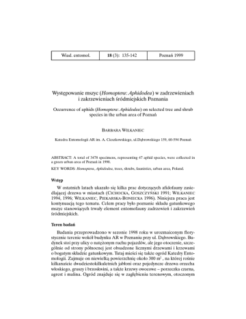Wiad. entomol. 18 (3): 135-142 Poznań 1999 Występowanie mszyc (Homoptera: Aphidodea) w zadrzewieniach i zakrzewieniach śródmiejskich Poznania Occurrence of aphids (Homoptera: Aphidodea) on selected tree and shrub species in the urban area of Poznań BARBARA WILKANIEC Katedra Entomologii AR im. A. Cieszkowskiego, ul.Dąbrowskiego 159, 60-594 Poznań ABSTRACT: A total of 3478 specimens, representing 47 aphid species, were collected in a green urban area of Poznań in 1998. KEY WORDS: Homoptera, Aphidodea, trees, shrubs, faunistics, urban area, Poland. Wstęp W ostatnich latach ukazało się kilka prac dotyczących afidofauny zasiedlającej drzewa w miastach (CICHOCKA, GOSZCZYŃSKI 1991; WILKANIEC 1994, 1996; WILKANIEC, PIEKARSKA-BONIECKA 1996). Niniejsza praca jest kontynuacją tego tematu. Celem pracy było poznanie składu gatunkowego mszyc stanowiących trwały element entomofauny zadrzewień i zakrzewień śródmiejskich. Teren badań Badania przeprowadzono w sezonie 1998 roku w urozmaiconym florystycznie terenie wokół budynku AR w Poznaniu przy ul. Dąbrowskiego. Budynek stoi przy ulicy o natężonym ruchu pojazdów, ale jego otoczenie, szczególnie od strony północnej jest obsadzone licznymi drzewami i krzewami o bogatym składzie gatunkowym. Tutaj mieści się także ogród Katedry Entomologii. Zajmuje on niewielką powierzchnię około 300 m2 , na której rośnie kilkanaście dwudziestokilkuletnich jabłoni oraz pojedyncze drzewa orzecha włoskiego, gruszy i brzoskwini, a także krzewy owocowe – porzeczka czarna, agrest i malina. Ogród znajduje się w zagłębieniu terenowym, otoczonym 136 B. WILKANIEC około 3 ha terenenem zieleni , w którym można znaleźć wszystkie podstawowe gatunki drzew i krzewów typowe dla nasadzeń śródmiejskich. Teren ten sąsiaduje od strony północnej z Ogrodem Botanicznym. Materiał i metody Mszyce odławiano w pułapki Moericke’go, zawieszane na jabłoniach rosnących w ogrodzie Katedry na wysokości 1,5 m. Zastosowano 5 powtórzeń. Badania prowadzono przez cały sezon wegetacyjny od maja do listopada, pobierając próby w odstępach dekadowych. Materiał oznaczano z pomocą kluczy MÜLLER’a (1968) i TAYLOR’a (1980). Wyniki i ich omówienie W wyniku przeprowadzonych badań w sezonie 1998 roku zgromadzono materiał w liczbie 3478 odłowionych osobników, reprezentujący 47 gatunków mszyc. Wszystkie występujące gatunki przedstawiono w postaci systematycznego wykazu (Tab. I). W zestawieniu tym zgodnym z nomenklaturą stosowaną w pracach S ZELEGIEWICZA (1978) i RAZOWSKIEGO (1990), zaTab. I. Wykaz stwierdzonych gatunków mszyc, ich liczebność i współczynnik dominacji (D). List of recorded aphis species, their number and relative abundance (D). Liczebność (Number) D [%] 2 3 PEMPHIGIDAE Kaltenbachiella pallida (HAL.) Tetraneura ulmi (L.) Mimeuria ulmiphila (DEL GU.) Forda marginata KOCH. 1 2 44 1 0,03 0,1 1,3 0,03 ANOECIIDAE Anoecia corni (FABR .) 270 7,8 PHYLLAPHIDIDAE Drepanosiphum platanoidis (SCHR.) Calaphis betulicola (K ALT.) Monaphis antennata (K ALT.) Callaphis juglandis (GOETZ) Eucallipterus tiliae (L.) Tinocallis platani (KALT.) Tuberculoides annulatus (HART.) 94 5 3 3 8 9 1 2,7 0,1 0,1 0,1 0,2 0,3 0,03 Gatunek (Species) 1 WYSTĘPOWANIE MSZYC W ZADRZEWIENIACH I ZAKRZEWIENIACH ... 1 2 3 351 10,1 LACHNIDAE Cinara sp. 1 0,03 APHIDIDAE Pterocomma pilosum B UCKT. Hyalopterus pruni (GEOFFR.) 1 5 0,03 0,1 103 2289 26 20 1 25 3 78 2 9 2 2 1 1 5 19 1 1 15 17 8 1 1 19 2 1 2 1 1 23 3478 3,0 65,8 0,8 0,6 0,03 0,7 0,1 2,2 0,1 0,3 0,1 0,1 0,03 0,03 0,1 0,6 0,03 0,03 0,4 0,5 0,2 0,03 0,03 0,6 0,1 0,03 0,1 0,03 0,03 0,6 100 CHAITOPHORIDAE Periphyllus spp. Rhopalosiphum insertum (WALK .) Rhopalosiphum padi (L.) Melanaphis pyraria (PASS.) Aphis fabae SCOP. Aphis idaei VDG Aphis pomi DE G EER Aphis sambuci L. Aphis spp. Ceruraphis eriophori (WALK.) Dysaphis plantaginea (PASS.) Brachycaudus helichrysi (KALT.) Brachycaudus populi (DEL GU.) Brachylocus cerastii (KALT.) Hayhurstia atriplicis (L.) Cavariella kanoi TAKAH. Phorodon humuli (SCHR .) Ovatus insitus (Walk.) Myzus certus (WALK .) Myzus persicae (SULZ.) Hyperomyzus lactucae (L.) Hyperomyzus pallidus HRL Aulacorthum speyeri (BÖRN.) Microlophium evansi (THEOB.) Metopolophium dirhodum (WALK.) Acyrthosiphon pisum (HARR.) Uroleucon sp. Macrosiphoniella tapuskae (HEF) Amphorophora gei (BÖRN .) Amphorophora rubi (KALT.) Inne (Others) Razem (Total) 137 138 Tab. II. Fenologia pojawu mszyc zebranych metodą pułapek Moericke’go w Poznaniu w roku 1998. Phenology of aphids in samples collected with Moericke traps in Poznan in 1998. Liczba mszyc w próbie w dekadzie miesiąca (Number of aphids in a decade of month) Gatunek mszycy (Species of aphid) Maj (May) Czerwiec (June) Lipiec (July) Sierpień (August) Wrzesień (September) Październik (October) II III I II III I II III I II III I II III I II III 2 3 4 5 6 7 8 9 10 11 12 13 14 15 16 17 18 19 Periphyllus spp. 35 65 4 1 8 79 159 Drepanosiphum platanoides (SCHR.) 1 1 12 21 Aphis sp. 2 22 6 1 7 2 1 5 9 24 21 2 5 1 3 4 3 11 Phorodon humuli (SCHR .) 5 4 2 3 Metopolophium dirhodum (WALK.) 3 Aphis pomi DE GEER 1 Cinara sp. 1 Pterocomma pilosum B UCKT. 1 Hyperomyzus pallidus HRL 1 Tuberculoides annulatus (HART.) 1 1 1 2 Tinocallis platani (KALT.) 3 3 Callaphis juglandis (GOETZ) 1 1 Phalangomyzus tapuskae (HOTT . et FRIS.) 1 Dysaphis plantaginea (PASS.) 1 4 1 1 5 2 1 3 3 4 2 8 6 3 6 5 2 5 3 1 1 4 1 3 B. WILKANIEC I 1 2 3 4 1 Amphorophora rubi (K ALT.) 1 5 Rhopalosiphum padi (L.) 1 Amphorophora gei (B ÖRN.) 1 Forda marginata K OCH. 1 6 Eucallipterus tiliae (L.) 2 Brachycaudus populi (DEL GU.) 2 Uroleucon sp. 1 Acyrthosiphon pisum (HARR.) 1 Hayhurstia atriplicis (L.) 1 Aulacorthum speyeri (BÖRN .) 1 7 8 2 8 Hyalopterus pruni (GEOFFR.) 1 2 Rhopalosiphum insertum (WALK.) 2 2 12 13 14 15 16 17 18 1 2 145 65 112 529 1434 2 19 1 1 3 2 2 Aphis fabae SCOP . 2 Aphis idaei V. D. G OOT. 1 Tetraneura ulmi (L.) 11 1 15 Monaphis antennata (KALT.) 10 1 Melan