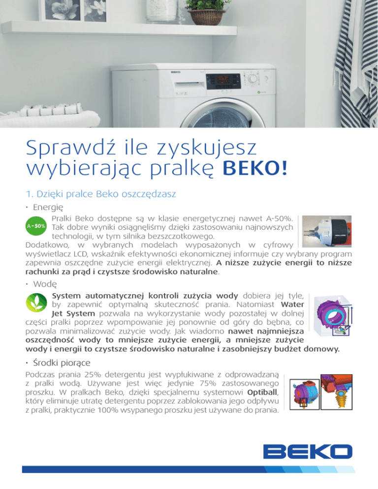 Sprawdź ile zyskujesz wybierając pralkę BEKO! 1. Dzięki pralce Beko oszczędzasz • Energię Pralki Beko dostępne są w klasie energetycznej nawet A-50%. Tak dobre wyniki osiągnęliśmy dzięki zastosowaniu najnowszych technologii, w tym silnika bezszczotkowego. Dodatkowo, w wybranych modelach wyposażonych w cyfrowy wyświetlacz LCD, wskaźnik efektywności ekonomicznej informuje czy wybrany program zapewnia oszczędne zużycie energii elektrycznej. A niższe zużycie energii to niższe rachunki za prąd i czystsze środowisko naturalne. • Wodę System automatycznej kontroli zużycia wody dobiera jej tyle, by zapewnić optymalną skuteczność prania. Natomiast Water Jet System pozwala na wykorzystanie wody pozostałej w dolnej części pralki poprzez wpompowanie jej ponownie od góry do bębna, co pozwala minimalizować zużycie wody. Jak wiadomo nawet najmniejsza oszczędność wody to mniejsze zużycie energii, a mniejsze zużycie wody i energii to czystsze środowisko naturalne i zasobniejszy budżet domowy. • Środki piorące Podczas prania 25% detergentu jest wypłukiwane z odprowadzaną z pralki wodą. Używane jest więc jedynie 75% zastosowanego proszku. W pralkach Beko, dzięki specjalnemu systemowi Optiball, który eliminuje utratę detergentu poprzez zablokowania jego odpływu z pralki, praktycznie 100% wsypanego proszku jest używane do prania. 2. Innowacyjna grzałka Hi-Tech Pokryta jest warstwą niklu, która doskonale zabezpiecza przed korozją, a jej trwałość jest nawet do 100 razy wyższa w porównaniu do grzałek standardowych. Dzięki temu nie ma już potrzeby stosowania dodatkowych środków zabezpieczających przed jej uszkodzeniem. Hi-tech Standart 3. Zatroszcz się o higienę Twoich najbliższych Program Baby Care został specjalnie stworzony do higienicznego W trosce prania ubranek niemowlęcych i odzieży osób cierpiących na alergie o Twoich bliskich skórne. Poprzez wydłużone pranie w wyższej temperaturze oraz dodatkowe i intensywne płukanie program eliminuje bakterie oraz zapewnia doskonałe rezultaty prania i całkowite wypłukanie środka piorącego, którego pozostałości są jedną z najczęstszych przyczyn alergii skórnych. Ponadto niektóre modele wyposażone zostały w specjalny program Self Clean, w trakcie którego następuje samooczyszczanie pralki. Eliminuje to proces rozwoju bakterii w jej wnętrzu. 4. Inteligentne rozwiązanie dla miłośników zwierząt. Beko znalazło doskonałe rozwiązanie dla wszystkich miłośników włochatych pupili. W pralkach posiadających funkcję Pupil postawiliśmy na dodatkowe podgrzewanie wody, skutecznie rozluźniające włókna tkanin, wielokrotne płukanie i odwirowywanie tak, by Wasze ubrania były idealnie czyste i pozbawione jak największej ilości sierści. 5. Ładowność dostosowana do indywidualnych potrzeb Beko oferuje pralki o ładowności od 3,5 do 9 kg. Nowe modele pralek posiadają ładowności: 6 kg przy 45 cm głębokości oraz 5 kg przy 35 cm głębokości. Każdy znajdzie więc pralkę idealnie dostosowaną do swoich potrzeb; nawet taką, która zajmuje minimalną ilość miejsca. 6. Elektroniczny system wyważania wsadu System ten stanowi gwarancję równomiernego rozłożenia wkładu w bębnie, co eliminuje drgania powstałe wskutek nieprawidłowego rozkładu obciążenia i redukuje hałas. 7. Dodatkowe funkcje Funkcje Pralki Beko są wyposażone w wiele dodatkowych funkcji takich jak: Blokada przycisków, Funkcja Express, Funkcja bez zagnieceń, Funkcja opóźnienia startu. Duże drzwi nawet do 34 cm i wiele innych. Więcej informacji i gama produktów szukaj na www.beko.com.pl