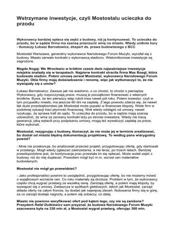 Wstrzymane inwestycje, czyli Mostostalu ucieczka do przodu Wykonawcy bardziej opłaca się zejść z budowy, niż ją kontynuować. To ucieczka do przodu, bo w sądzie firma ma szansę przerzucić winę na miasto. Wtedy uniknie kary - tłumaczy Łukasz Bernatowicz, ekspert ds. prawa budowlanego z BCC Mostostal Warszawa, generalny wykonawca Narodowego Forum Muzyki, wycofał się z budowy. Miasto zerwało kontrakt z wykonawcą stadionu. Wielomilionowe inwestycje są zagrożone. Magda Nogaj: We Wrocławiu w krótkim czasie dwie najważniejsze inwestycje miejskie znalazły się w tarapatach. Najpierw kontrakt straciła firma Max Boegl, która budowała stadion. Potem umowę zerwał Mostostal, wykonawca Narodowego Forum Muzyki. Obie firmy mają doświadczenie i renomę, więc jak wytłumaczyć to, że nie wywiązały się z umów? Łukasz Bernatowicz: Zawsze jak nie wiadomo, o co chodzi, to chodzi o pieniądze. Wykonawcy, gdy rozpoczynają prace, muszą je początkowo finansować z własnych środków. Bywa, że ten pierwszy etap robót trwa nawet pół roku. Potem inwestor, czyli w tym przypadku miasto, ma jeszcze 60 dni na zapłatę. Z tego powodu zdarza się, że nawet tak duże przedsiębiorstwo jak Mostostal może popaść w finansowe kłopoty. Wiele firm w podobnej sytuacji traci płynność finansową. Woli wtedy odstąpić od umowy, nawet ryzykując, że sprawa trafi do sądu. To ucieczka do przodu, bo w sądzie mają szansę udowodnić, że wina za zerwany kontrakt leży po stronie inwestora. Wtedy nie tracą gwarancji, jaką wpłacili przy podpisaniu umowy, mogą też wywalczyć zapłatę za prace, które wykonali. Mostostal, rezygnując z budowy, tłumaczył, że nie może jej w terminie zrealizować, bo dostał od miasta błędną dokumentację projektową. To według pana wiarygodny powód? - Mnie nie przekonuje, bo analizowali przecież projekt, przygotowując ofertę, gdy startowali w przetargu. Mogli wtedy zgłaszać zastrzeżenia, a nie teraz, po trzech latach. Bardziej prawdopodobne jest, że kontynuacja prac przestała im się opłacać. Może woleli zejść z budowy, niż do niej dopłacać. Powodem mógł być m.in. wzrost cen materiałów budowlanych. Mostostal nie mógł go przewidzieć? - Jako profesjonaliści powinni to uwzględnić, przygotowując ofertę, bo nie możemy mówić o wyjątkowym wzroście cen. Co roku materiały są droższe. Problem w tym, że wykonawcy często chcą wygrać przetarg za wszelką cenę. Zaniżają ofertę, a potem mają kłopoty, by wywiązać się z umowy. Zwłaszcza w spółkach giełdowych, takich jak Mostostal, zarząd składa oferty na całym froncie, by dostać jak najwięcej zleceń. Notowania firmy idą w górę, za co zarząd dostaje nagrody, a potem się zobaczy, co dalej. Miasto nie powinno weryfikować ofert pod kątem tego, czy nie są zaniżone? Prezydent Rafał Dutkiewicz sam przyznał, że budowa Narodowego Forum Muzyki szacowana była na 330 mln zł, a Mostostal wygrał przetarg, oferując 300 mln. - Problem polega na tym, że zamawiający, wybierając wykonawcę, stosują najczęściej wyłącznie kryterium ceny. Kontrakt dostaje ten, kto jest najtańszy. Tymczasem zgodnie z Ustawą o zamówieniach publicznych zamawiający mogą brać też pod uwagę doświadczenie i renomę wykonawcy, ale nie korzystają z tego. Boją się, że gdy wybiorą droższą ofertę, ktoś mógłby zarzucić im nieuczciwość. Wybierając wykonawcę stadionu, miasto nie było ograniczone przetargiem. Nie musiało więc kierować się najniższą ceną, strony wspólnie ustalały wartość kontraktu. I też skończyło się niepowodzeniem. - Może obie strony nie doszacowały inwestycji. By uniknąć takich sytuacji, BCC postuluje wprowadzenie do Ustawy o zamówieniach publicznych zapisu, by można było indeksować cenę zawartą w umowie, czyli podwyższyć ją w przypadku, gdyby np. koszty materiałów budowlanych wzrosły. Teraz wykonawca oczywiście może prosić zamawiającego, by zapłacił więcej, jednak inwestor nie ma prawa się na to zgodzić. Mostostal domagał się dodatkowych 55 mln zł. Miasto musiało odmówić, choć ryzykuje stratę 140 mln zł. Jeśli do czerwca przyszłego roku budowa forum się nie zakończy, grozi nam utrata dotacji unijnej. Prezydent Dutkiewicz przekonuje, że można zmienić treść umowy z Unią Europejską. - Komisja europejska bardzo rzadko i niechętnie przychyla się do tego typu wniosków. Wątpię, by zgodziła się na wyznaczenie późniejszego terminu zakończenia inwestycji. Kłopoty z wykonawcą to jak sądzę zbyt słaby argument.