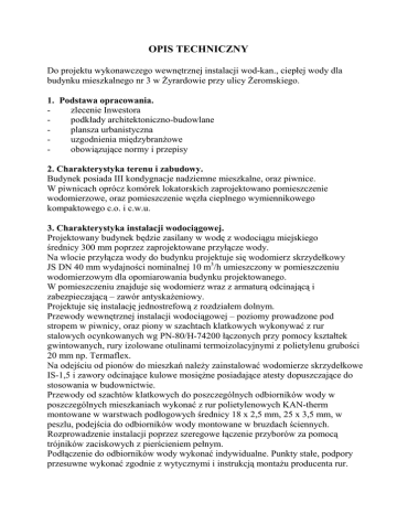 OPIS TECHNICZNY Do projektu wykonawczego wewnętrznej instalacji wod-kan., ciepłej wody dla budynku mieszkalnego nr 3 w śyrardowie przy ulicy śeromskiego. 1. Podstawa opracowania. zlecenie Inwestora podkłady architektoniczno-budowlane plansza urbanistyczna uzgodnienia międzybranŜowe obowiązujące normy i przepisy 2. Charakterystyka terenu i zabudowy. Budynek posiada III kondygnacje nadziemne mieszkalne, oraz piwnice. W piwnicach oprócz komórek lokatorskich zaprojektowano pomieszczenie wodomierzowe, oraz pomieszczenie węzła cieplnego wymiennikowego kompaktowego c.o. i c.w.u. 3. Charakterystyka instalacji wodociągowej. Projektowany budynek będzie zasilany w wodę z wodociągu miejskiego średnicy 300 mm poprzez zaprojektowane przyłącze wody. Na wlocie przyłącza wody do budynku projektuje się wodomierz skrzydełkowy JS DN 40 mm wydajności nominalnej 10 m3/h umieszczony w pomieszczeniu wodomierzowym dla opomiarowania budynku projektowanego. W pomieszczeniu znajduje się wodomierz wraz z armaturą odcinającą i zabezpieczającą – zawór antyskaŜeniowy. Projektuje się instalację jednostrefową z rozdziałem dolnym. Przewody wewnętrznej instalacji wodociągowej – poziomy prowadzone pod stropem w piwnicy, oraz piony w szachtach klatkowych wykonywać z rur stalowych ocynkowanych wg PN-80/H-74200 łączonych przy pomocy kształtek gwintowanych, rury izolowane otulinami termoizolacyjnymi z polietylenu grubości 20 mm np. Termaflex. Na odejściu od pionów do mieszkań naleŜy zainstalować wodomierze skrzydełkowe IS-1,5 i zawory odcinające kulowe mosięŜne posiadające atesty dopuszczające do stosowania w budownictwie. Przewody od szachtów klatkowych do poszczególnych odbiorników wody w poszczególnych mieszkaniach wykonać z rur polietylenowych KAN-therm montowane w warstwach podłogowych średnicy 18 x 2,5 mm, 25 x 3,5 mm, w peszlu, podejścia do odbiorników wody montowane w bruzdach ściennych. Rozprowadzenie instalacji poprzez szeregowe łączenie przyborów za pomocą trójników zaciskowych z pierścieniem pełnym. Podłączenie do odbiorników wody wykonać indywidualne. Punkty stałe, podpory przesuwne wykonać zgodnie z wytycznymi i instrukcją montaŜu producenta rur. 4. Obliczenie zapotrzebowania wody zimnej. Na podstawie miarodajnego przepływu zgodnie z PN-92/B-01706. Budynek nr 3 Lp. przybory ilość przepływ suma przepływu sanitarne l/s l/s 1 umywalki 12 0,07 x 2 1,68 2 zlewozmywaki 12 0,07 x 2 1,68 3 wanny 12 0,15 x 2 3,60 4 zbiorniki płuczące 12 0,13 1,56 5 pralki automatyczne 12 0,25 3,00 razem qn = 11,52 q = 1,91 l/s = 6,88 m3/h Qw = 2 x 1,91 = 3,82 l/s = 13,75 m3/h. Dobrano wodomierz skrzydełkowy typu JS-10 Dn 40 qp = 10,0 m3/h, qs = 20,0 m3/h, zlokalizowany w pomieszczeniu wodomierzowym wraz z armaturą odcinającą i zaworem antyskaŜeniowym. 5. Charakterystyka instalacji wody ciepłej. Budynek będzie zasilany z sieci cieplnej poprzez węzeł wymiennikowy c.o. i c.w.u. kompaktowy zlokalizowany w piwnicy budynku. Przewody wewnętrznej instalacji wody ciepłej – poziomy prowadzone pod stropem w piwnicy, oraz piony w szachtach klatkowych wykonywać z rur stalowych ocynkowanych wg PN-80/H-74200 łączonych przy pomocy kształtek gwintowanych, rury izolowane otulinami termoizolacyjnymi z polietylenu gr. 30 mm. Na odejściu od pionów do mieszkań naleŜy zainstalować wodomierze skrzydełkowe IS-90-1,5 i zawory odcinające kulowe mosięŜne posiadające atesty dopuszczające do stosowania w budownictwie. Przewody od szachtów klatkowych do poszczególnych odbiorników wody w poszczególnych mieszkaniach wykonać z rur polietylenowych KAN-therm montowane w warstwach podłogowych średnicy 18 x 2,5 mm, 25 x 3,5 mm, w peszlu, podejścia do odbiorników wody montowane w bruzdach ściennych. Rozprowadzenie instalacji poprzez szeregowe łączenie przyborów za pomocą trójników zaciskowych z pierścieniem pełnym. Podłączenie do odbiorników wody wykonać indywidualne. Punkty stałe, podpory przesuwne wykonać zgodnie z wytycznymi i instrukcją montaŜu producenta rur. Na cyrkulacji pod pionami montować wielofunkcyjne termostatyczne zawory cyrkulacyjne MTCV DN 20 o odpowiedniej nastawie podanej na rzucie i rozwinięciu instalacji. Kompensacja poziomów za pomocą samokompensacji na załamaniach przewodów. Na wylocie z przyborów przyjęto ciśnienie 1,0 bara, ciśnienie próbne 9,0 bar. Armatura na ciśnienie robocze 6,0 bara. 6. Obliczenie zapotrzebowania ciepłej wody. Budynek nr 3 - ilość osób - 36 - ilość wody na jedną osobę - 130 l/dobę, - 5,4 kG/h - czas poboru ciepłej wody - 18 godz. - wsp. nierównomierności rozbioru - 4,5 - ilość ciepłej wody: q śr.h. = 5,4 x 36 = 190 kG/h q maxh. = 190 x 4,5 = 860 kG/h - ilość ciepła na ciepłą wodę: Q cwu. śr. = 190 x 50 x 1,163 = 11.000 W = 11,0 kW Q cwu. max. = 11.000 x 4,55 = 50.000 W = 50,0 kW - ilość wody cyrkulacyjnej: Gcyrk = ( 0,05 x 50.000 x 0,86 ) : ( 8 x 1000 ) = 0,27 m3/h 7. Charakterystyka instalacji kanalizacyjnej. Ścieki sanitarne odprowadzane będą do istniejącego kanału miejskiego poprzez zaprojektowane przyłącza kanalizacji sanitarnej. Piony i poziomy kanalizacji sanitarnej wykonać z rur i kształtek PVC-U kielichowych łączonych przy pomocy uszczelki gumowej zamocowanej fabrycznie w kielichy. U podstawy pionów montuje się rewizje. Piony kanalizacji sanitarnej zakończyć nad dachem rurami wywiewnymi. Wody spustowe z instalacji centralnego ogrzewania i węzła cieplnego poprzez kratki ściekowe sprowadzone są do studzienki schładzającej średnicy 800 mm głębokości 1,5 m, skąd poprzez zasyfonowanie odprowadzane są do poziomu kanalizacji ściekowej. Wody opadowe z dachów rurami spustowymi zewnętrznymi odprowadzane będą poprzez projektowane przyłącza kanalizacji deszczowej do kanalizacji deszczowej zaprojektowanej. Warunki wykonania i odbioru instalacji określone są w następujących normach: PN-71/B-10420 Urządzenie ciepłej wody