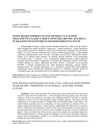 ELEKTRYKA Zeszyt 2-3 (230-231) 2014 Rok LX Lesław LACROIX Politechnika Śląska w Gliwicach NOWE BLOKI ENERGETYCZNE OPARTE NA PALIWIE WĘGLOWYM I GAZIE O MOCY POWYŻEJ 400 MW, ICH ROLA W KRAJOWYM SYSTEMIE ELEKTROENERGETYCZNYM Streszczenie. Niniejszy artykuł opisuje aktualnie budowane i planowane do budowy bloki energetyczne oparte na paliwie węglowym - węglu kamiennym i węglu brunatnym oraz na paliwie gazowym. Głównym celem tych inwestycji jest zastąpienie wycofywanych bloków, by móc utrzymać zbilansowanie systemu elektroenergetycznego z odpowiednią nadwyżką zainstalowanej mocy. Powody wycofania pewnej ilości istniejących bloków podane są w dalszej części artykułu. W artykule opisano skrótowo nową technologię wytwarzania pary w kotłach o tzw. parametrach nadkrytycznych, podwyższających znacznie sprawność bloków węglowych w stosunku do technologii obecnie stosowanej. Artykuł ukazuje też pewne zagrożenia dla pracy bloków o poziomie mocy powyżej 850 MW w okresie występowania tzw. dolin obciążenia dobowego systemu elektroenergetycznego. W artykule wspomniano też o Dyrektywie unijnej IED, która nakazuje ograniczenia emisji szkodliwych substancji (gazów) do atmosfery, głównie chodzi tu o szkodliwe gazy, jak: dwutlenek siarki czy wielotlenki azotu oraz dwutlenek węgla. Słowa kluczowe: blok energetyczny, Krajowy System Elektroenergetyczny, wyprowadzenie mocy, nadkrytyczność kotłów energetycznych, Dyrektywa IED NEW POWER UNITS BASED ON FUEL COAL AND GAS WITH POWER OVER 400 MW, THEIR ROLE IN NATIONAL ELECTRIC POWER SYSTEM Summary. This article describes the construction and the plans for the construction of power units based on carbon fuel - coal and lignite and the gaseous fuel. The main objective of these investments is to replace the withdrawn blocks to be able to maintain a balance of power system with adequate surplus installed capacity. The reasons for the withdrawal of a certain amount of existing units are described later in the article. The article briefly describes the new technology of steam generation in boilers of the socalled. supercritical parameters, which increase significantly the efficiency of coal-fired units in relation to the technology currently used. The article presents a certain threat to the operation units on the level of power above 850MW at the time of the so-called (off peak ). valleys of daily load of the power system The article also mentioned about the IED European Directive, which requires the limitation of emissions of harmful substances (gases) into the atmosphere, mainly it is a harmful gases: as sulfur dioxide or nitrogen multioxides and carbon dioxide. Keywords: power unit, National Energy Power System, power output supercritical parameters of boilers, IED Directive 8 L. Lacroix 1. AKTA PRAWNE ZWIĄZANE Z EMISJAMI SZKODLIWYCH SUBSTANCJI I GAZÓW DO ATMOSFERY 1.1. Dyrektywa IED w sprawie emisji przemysłowych Dyrektywa ta ustanawia nowe normy emisyjne dla zakładów posiadających instalacje spalania, które otrzymały lub złożyły kompletne dokumenty dla uzyskania pozwolenia na ich emisję przed dniem wejścia dyrektywy w życie, tzw. instalacje istniejące, oraz normy emisyjne dla instalacji nowych, które otrzymały lub złożyły kompletny wniosek o pozwolenie po terminie wejścia w życie dyrektywy. Istotną zmianą, jaka ma być wprowadzona do polskiego prawodawstwa w związku z implementacją dyrektywy do rozporządzenia Ministra Środowiska, będzie agregacja mocy cieplnych kotłów podłączonych do wspólnego emitora i ustalanie standardów emisyjnych w odniesieniu do zsumowanej mocy źródła emisji – komina. Kolejną zmianą będzie możliwość traktowania, jako jedno źródło emisji, kotłów energetycznych podłączonych do kilku emitorów i ustalanie standardów emisyjnych w odniesieniu do zsumowanej mocy kotłów podłączonych do tych emitorów. W związku z takim podejściem ustalane standardy emisyjne będą zdecydowanie „ostrzejsze” niż te, które byłyby, jak do tej pory, ustanawiane dla każdego kotła oddzielnie 1.2. Zmiany dotyczące dyrektywy LCP (Large Combustion Plants - kotły węglowe o mocy powyżej 300 MWt) Dyrektywa 2001/80/WE w sprawie ograniczenia emisji niektórych zanieczyszczeń do powietrza z dużych bloków energetycznych, nazywana Dyrektywą LCP, zostanie zastąpiona dyrektywą IED w dniu 1 stycznia 2016 roku. Jedną z najistotniejszych zmian będzie sumowanie mocy kotłów podłączonych do jednego komina. Dotychczas każdy kocioł traktowano jako osobną instalację. Istotnym problemem będą nowe, bardziej rygorystyczne standardy emisyjne SO2, NOx i pyłów, których spełnienie może stwarzać problemy niektórym elektrowniom i elektrociepłowniom. Dodatkowo, obowiązkowe staną się ciągłe pomiary stężeń SO2, NOx i pyłów dla źródeł o mocy przekraczającej 100 MWt (wyjątki to źródła o czasie eksploatacji < 1000 h/rok, a także kotły lub turbiny gazowe opalane gazem ziemnym – w zakresie SO2 i pyłów). Zostanie także wprowadzony wymóg przynajmniej jednego w roku pomiaru emisji całkowitej rtęci w źródłach opalanych węglem. Zmiany standardów emisyjnych na podstawie Rozporządzenia Ministra Środowiska z dnia 22 kwietnia 2011 są podane w poniższych tabelach i wykresach. Nowe bloki energetyczne... 9 Tabela 1 Obecne i zgodne z Dyrektywą IED standardy emisyjne dla dwutlenku siarki Moc cieplna w paliwie wprowadzanym do instalacji [MWt] Standardy emisyjne SO2 w mg/m3n przy zawartości 6% tlenu w spalinach Węgiel kamienny Standardy emisyjne SO2 w mg/m3n przy zawartości 3% tlenu w spalinach Paliwo ciekłe Gaz Obecnie Zgodne z Dyrektywą IED Obecnie Zgodne z Dyrektywą IED Obecnie Zgodne z Dyrektywą IED 50 – 100 1500 400 1700 350 35 35 100 – 300 1500 – 400 250 1700 250 35 35 300 – 500 1500 – 400 200 1700 – 400 200 35 35 > 500 400 200 400 200 35 35 Standardy emisyjne SO2 dla źrodła o mocy >500 MW 450 400 350 mg/m3n 300 Stan