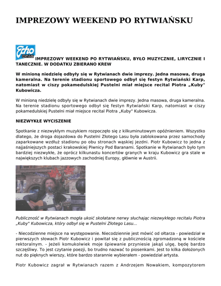 IMPREZOWY WEEKEND PO RYTWIAŃSKU IMPREZOWY WEEKEND PO RYTWIAŃSKU, BYŁO MUZYCZNIE, LIRYCZNIE I TANECZNIE. W DODATKU ZBIERANO KREW W minioną niedzielę odbyły się w Rytwianach dwie imprezy. Jedna masowa, druga kameralna. Na terenie stadionu sportowego odbył się festyn Rytwiański Karp, natomiast w ciszy pokamedulskiej Pustelni miał miejsce recital Piotra „Kuby" Kubowicza. W minioną niedzielę odbyły się w Rytwianach dwie imprezy. Jedna masowa, druga kameralna. Na terenie stadionu sportowego odbył się festyn Rytwiański Karp, natomiast w ciszy pokamedulskiej Pustelni miał miejsce recital Piotra „Kuby" Kubowicza. NIEZWYKŁE WYCISZENIE Spotkanie z niezwykłym muzykiem rozpoczęło się z kilkuminutowym opóźnieniem. Wszystko dlatego, że droga dojazdowa do Pustelni Złotego Lasu była zablokowana przez samochody zaparkowane wzdłuż stadionu po obu stronach wąskiej jezdni. Piotr Kubowicz to jedna z najjaśniejszych postaci krakowskiej Piwnicy Pod Baranami. Spotkanie w Rytwianach było tym bardziej niezwykłe, że oprócz kilkunastu koncertów granych w kraju Kubowicz gra stale w największych klubach jazzowych zachodniej Europy, głównie w Austrii. Publiczność w Rytwianach mogła ukoić skołatane nerwy słuchając niezwykłego recitalu Piotra „Kuby" Kubowicza, który odbył się w Pustelni Złotego Lasu... - Niecodzienne miejsce na występowanie. Niecodziennie jest mówić od ołtarza - powiedział w pierwszych słowach Piotr Kubowicz i powitał się z publicznością zgromadzoną w kościele rektoralnym. - Jeżeli komukolwiek moje śpiewanie przyniesie jakąś ulgę, będę bardzo szczęśliwy. To jest czytanie poezji, bo trudno nazwać to piosenkami. Jest to kilka dołożonych nut do pięknych wierszy, które bardzo starannie wybierałem - powiedział artysta. Piotr Kubowicz zagrał w Rytwianach razem z Andrzejem Nowakiem, kompozytorem pierwszego hymnu Piwnicy Pod Baranami „Niebieska Patelnia". Już po pierwszych utworach w wykonaniu Kubowicza publiczność w niesamowitym wręcz skupieniu przysłuchiwała się temu niecodziennemu czytaniu wierszy. Przed każdą kolejną kompozycją artysta w kilku słowach mówił różne często humorystyczne historie. Recital zorganizowała Pustelnia Złotego Lasu w Rytwianach oraz Stajnia Artystyczna Marcinków. Jak się dowiedzieliśmy takie recitale i spotkania z kulturą wyższych lotów mają zagościć w Pustelni na stałe. - Przygotowujemy cykl tego typu spotkań. Między innymi z muzykami i poetami - mówi Lesław Dach, menedżer Pustelni Złotego Lasu. ŚWIĘTO KARPIA Kiedy w Złotym Lesie odbywał się recital „Wakacyjne wyciszenie", dwa kilometry dalej, na stadionie sportowym w Rytwianach odbywał się festyn Rytwiański Karp. Tam atrakcji było co niemiara. Święto karpia rozpoczęło się już w sobotni poranek, kiedy to na stawach hodowlanych Wacława Szczoczarza w Rytwianach odbyły się zawody wędkarskie. Kilkunastu zawodników starało się skusić na swoją przynętę ryby z iście szlacheckimi korzeniami. Okazało się, że nawet młodzi zawodnicy potrafili złowić grubo ponad 5 kilogramów ryb. ...oraz bawić sie w rytmach największych światowych przebojów granych przez Sweet Combo. Niedziela okazała się bardzo łaskawa dla organizatorów festynu w Rytwianach. Wszystko zaczęło się tuż po godzinie 14. Na początku było bardzo oficjalnie, czyli powitanie gości, otwarcie imprezy i okolicznościowe przemówienia. Później nastąpiła wielka degustacja. Daniem głównym był oczywiście karp pod najróżniejszymi postaciami, przyrządzany przez najlepsze gospodynie w gminie Rytwiany. Konkurs na najlepsze danie wygrało Koło Gospodyń Wiejskich ze Święcicy. UCZTA KULINARNA I LETNIE RYTMY Kiedy uczta kulinarna się zakończyła, rozpoczęła się zabawa. Popołudnie należało niemal w całości do dzieci, które mogły tańczyć, śpiewać czy nawet czarować wszystko za sprawą agencji artystycznej „Joanna" z Kielc, która przygotowała program właśnie dla najmłodszych. Dorośli mogli w tym czasie spacerować pomiędzy kilkunastoma stoiskami z regionalnym rzemiosłem lub zakosztować wędzonego Pana Karpia ze stawów Wacława Szczoczarza. Odbyło się wiele konkursów nie tylko dla dzieci. Również dorośli mogli wykazać się wiedzą i umiejętnościami przeróżnego kalibru. Po południu na scenie pojawiła się grupa Sweet Combo, która rozgrzała publiczność przy rytmach najbardziej znanych letnich przebojów polskiej i światowej sceny muzycznej. Po nich na scenie pojawiła się grupa Standard, która bawiła publiczność przez kilka następnych godzin. Ci, którym zabawy było mało mogli tańczyć przy muzyce klubowej serwowanej przez didżeja. Grzegorz Forkasiewicz, wójt Rytwian: - Najbardziej chyba obawialiśmy się pogody, ale okazała się naprawdę świetna. Myślę, że każdy uczestnik dobrze się bawił, goszcząc w Rytwianach. Ze swojej strony bardzo dziękuję wszystkim mieszkańcom, którzy przyłączyli się do zbiórki krwi. POLAŁA SIĘ KREW W niedzielę w Rytwianach polała się również krew. Nie było jednak bijatyk, lecz zbiórka krwi przeprowadzona w Urzędzie Gminy w Rytwianach. Akcję przeprowadziło Regionalne Centrum Krwiodawstwa i Krwiolecznictwa w Kielcach. Podczas pięciu godzin mieszkańcy Rytwian oddali w sumie kilkanaście litrów krwi. Podczas festynu odbyła się zbiórka krwi dla potrzeb Regionalnego Centrum Krwiodawstwa i Krwiolecznictwa w Kielcach. Na zdjęciu Robert Jastrząb z Rytwian dopingowany przez swoją córkę. Najwięcej dawców przyszło tuż po godzinie 13 oraz około 15. Zaangażowanie mieszkańców bardzo dobrze ocenił personel medyczny. - W tym roku oddaję krew po raz drugi. Po prostu pomagam tym, którzy jej potrzebują - mówi Robert Jastrząb z Rytwian. Dzielnego tatę dopingowała córeczka. Podczas niedzielnej zbiórki krew oddało ponad 30 osób. Źródło: Echo Dnia nr 169(9714) z dnia 22.07.2008, Marcin Jarosz Gmina R