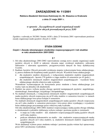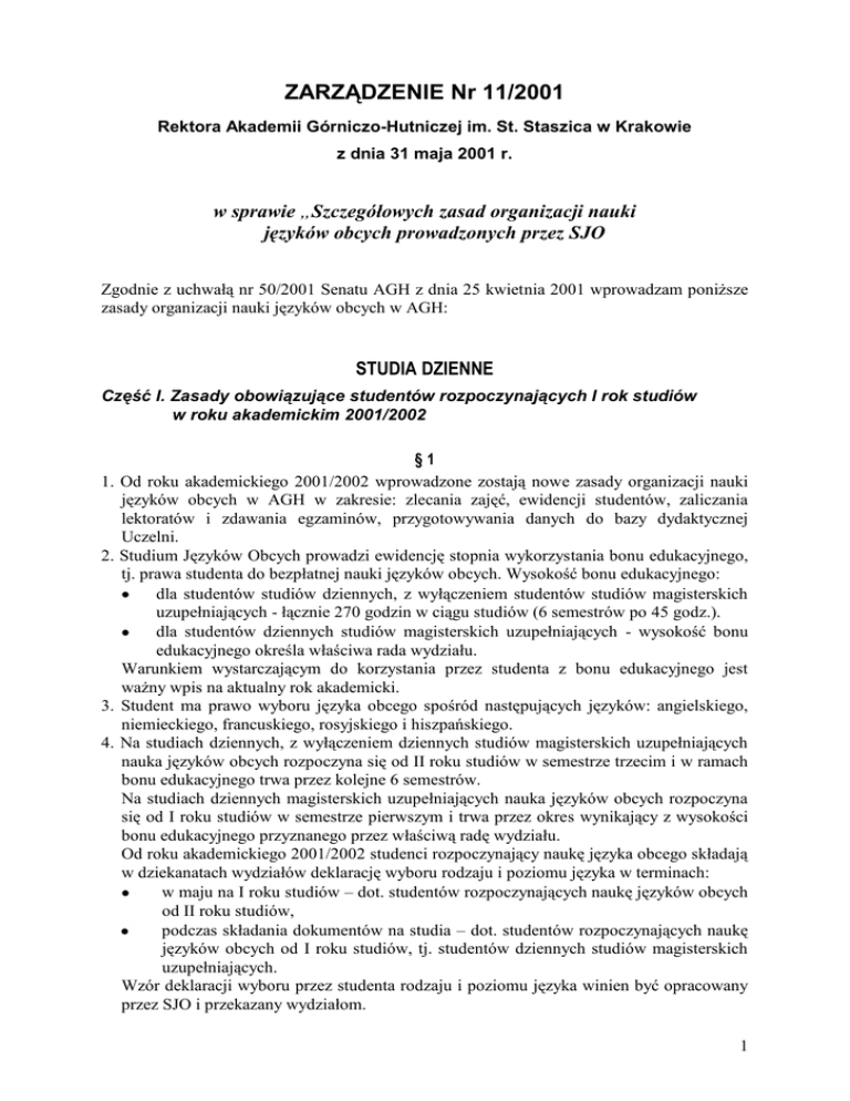 ZARZĄDZENIE Nr 11/2001 Rektora Akademii Górniczo-Hutniczej im. St. Staszica w Krakowie z dnia 31 maja 2001 r. w sprawie „Szczegółowych zasad organizacji nauki języków obcych prowadzonych przez SJO Zgodnie z uchwałą nr 50/2001 Senatu AGH z dnia 25 kwietnia 2001 wprowadzam poniższe zasady organizacji nauki języków obcych w AGH: STUDIA DZIENNE Część I. Zasady obowiązujące studentów rozpoczynających I rok studiów w roku akademickim 2001/2002 1. 2. 3. 4. §1 Od roku akademickiego 2001/2002 wprowadzone zostają nowe zasady organizacji nauki języków obcych w AGH w zakresie: zlecania zajęć, ewidencji studentów, zaliczania lektoratów i zdawania egzaminów, przygotowywania danych do bazy dydaktycznej Uczelni. Studium Języków Obcych prowadzi ewidencję stopnia wykorzystania bonu edukacyjnego, tj. prawa studenta do bezpłatnej nauki języków obcych. Wysokość bonu edukacyjnego: dla studentów studiów dziennych, z wyłączeniem studentów studiów magisterskich uzupełniających - łącznie 270 godzin w ciągu studiów (6 semestrów po 45 godz.). dla studentów dziennych studiów magisterskich uzupełniających - wysokość bonu edukacyjnego określa właściwa rada wydziału. Warunkiem wystarczającym do korzystania przez studenta z bonu edukacyjnego jest ważny wpis na aktualny rok akademicki. Student ma prawo wyboru języka obcego spośród następujących języków: angielskiego, niemieckiego, francuskiego, rosyjskiego i hiszpańskiego. Na studiach dziennych, z wyłączeniem dziennych studiów magisterskich uzupełniających nauka języków obcych rozpoczyna się od II roku studiów w semestrze trzecim i w ramach bonu edukacyjnego trwa przez kolejne 6 semestrów. Na studiach dziennych magisterskich uzupełniających nauka języków obcych rozpoczyna się od I roku studiów w semestrze pierwszym i trwa przez okres wynikający z wysokości bonu edukacyjnego przyznanego przez właściwą radę wydziału. Od roku akademickiego 2001/2002 studenci rozpoczynający naukę języka obcego składają w dziekanatach wydziałów deklarację wyboru rodzaju i poziomu języka w terminach: w maju na I roku studiów – dot. studentów rozpoczynających naukę języków obcych od II roku studiów, podczas składania dokumentów na studia – dot. studentów rozpoczynających naukę języków obcych od I roku studiów, tj. studentów dziennych studiów magisterskich uzupełniających. Wzór deklaracji wyboru przez studenta rodzaju i poziomu języka winien być opracowany przez SJO i przekazany wydziałom. 1 Wydziały zobowiązane są do zwrotu do SJO wypełnionych deklaracji studentów odpowiednio w terminach: do dnia 30 maja i 1 października. Przekazane przez dziekanaty wydziałów deklaracje studentów są jedynymi zestawieniami, jakie winny dla studiów dziennych przekazać dziekanaty wydziałów do SJO. W odniesieniu do dziennych studiów magisterskich uzupełniających, wydziały są zobowiązane dodatkowo do wcześniejszego tj. do dnia 1 lipca każdego roku do przekazania SJO informacji nt. wysokości obowiązującego bonu edukacyjnego oraz zatwierdzonego limitu przyjęć na I rok studiów. 5. SJO winno z końcem zajęć semestru letniego przeprowadzić zapisy studentów na lektoraty w następnym roku akademickim celem wstępnego zaplanowania obciążenia dydaktycznego pracowników SJO. Pierwsze zapisy studentów w SJO przeprowadzone zostaną z końcem semestru letniego w roku akademickim 2001/2002 wśród studentów I roku studiów magisterskich uzupełniających oraz w roku 2002/2003 wśród studentów II roku studiów dziennych (w następnym roku zapisy obejmą również studentów III roku). §2 1. Z końcem zajęć semestru zimowego i letniego, SJO jest zobowiązane do przygotowania protokołów zaliczeń lektoratów i przesłania ich do właściwych wydziałów w terminie do końca sesji zimowej i letniej. 2. Na studiach dziennych wprowadza się wymóg zdania egzaminu z języka obcego co najmniej na poziomie: a) opanowania średnio-zaawansowanego (poziom B) dla studentów kończących studia inżynierskie lub licencjackie, b) opanowania czynnego (poziom C) dla studentów kończących studia magisterskie. Do czasu zdania egzaminu z języka obcego na poziomie "C", tj. wskazującym na czynne opanowanie języka obcego, student może studiować tylko jeden język obcy. Po zdaniu egzaminu na poziomie "C" student może w sposób dowolny dysponować niewykorzystaną liczbą godzin bonu edukacyjnego, tj. doskonalić język na poziomie "D" lub podjąć naukę drugiego języka obcego lub zakończyć naukę języków obcych uzyskując zaliczenie pozostałych lektoratów na ocenę otrzymaną ze zadanego egzaminu. 3. Identyfikatorem określającym poziom egzaminu języka, jaki winien zdać student jest adnotacja w indeksie na stronie 1. Adnotacja "studia inżynierskie" lub "studia licencjackie" jest równoznaczna z poziomem B jako wymaganym poziomem egzaminu. Brak powyższej adnotacji oznacza studia magisterskie i poziom "C" jako wymagany poziom egzaminu. 4. Student przystępujący do egzaminu nie jest zobowiązany do posiadania żadnego dodatkowego zaświadczenia (np. z dziekanatu). Student ma prawo przystąpić do egzaminu z języka obcego w dowolnym momencie swoich studiów, lecz nie wcześniej niż w sesji letniej I roku studiów i nie później niż w semestrze, o którym mowa w § 4 pkt.1 lub, jeżeli termin taki nie został określony, przed zarejestrowaniem pracy magisterskiej. 5. Po zakończeniu w każdej sesji egzaminów z języka obcego, SJO jest zobowiązane do przesłania do właściwych wydziałów protokołów z wynikami egzaminu studentów danego wydziału. Protokoły winny zostać przesłane w nieprzekraczalnym terminie 14 dni od zakończenia egzaminu w danej sesji egzaminacyjnej. §3 1. Zakres egzaminu na poziomie "C" dostosowany jest do programu nauki języka obcego i podany jest do wiadomości studentów. Forma egzaminu "C" określona jest w załączniku 1 niniejsz
