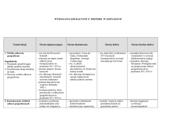 WYMAGANIA EDUKACYJNE Z HISTORII W GIMNAZJUM Temat lekcji 1. Wielkie odkrycia geograficzne Zagadnienia 1. Wynalazki umożliwiające dalekie podróże morskie. 2. Poszukiwanie drogi morskiej do Indii. 3. Pierwsze wielkie odkrycia geograficzne. 2. Konsekwencje wielkich odkryć geograficznych Ocena dopuszczająca – wie, kim był Krzysztof Kolumb – wskazuje na mapie ziemie odkryte przez Europejczyków na przełomie XV i XVI w. – rozumie pojęcia: busola, karawela – wie, dlaczego rdzennych mieszkańców Ameryki nazwano Indianami – pamięta datę pierwszej wyprawy Kolumba – 1492 r. – wymienia państwa, które przodowały w odkryciach geograficznych na przełomie XV i XVI w. – wymienia cywilizacje prekolumbijskie oraz podaje ich osiągnięcia Ocena dostateczna Ocena dobra Ocena bardzo dobra – zna postacie: Vasco da Gamy, Ferdynanda Magellana, Amerigo Vespucciego – wie, w jakich okolicznościach dowiedziono, że Ziemia ma kulisty kształt – wie, dlaczego Europejczycy zaczęli organizować dalekie podróże morskie – wie, jakie były wyobrażenia XV-wiecznych Europejczyków na temat otaczającego ich świata – uzasadnia kluczową rolę wynalazków w rozwoju dalekomorskiej żeglugi – uzasadnia, dlaczego Hiszpania i Portugalia stały się prekursorami odkryć geograficznych na przełomie XV i XVI w. – opowiada o działaniach konkwistadorów – charakteryzuje organizację – rozumie i omawia wpływ posiadania kolonii na gospodarkę państw – docenia osiągnięcia cywilizacji pozaeuropejskich Zagadnienia 1. Majowie, Aztekowie, Inkowie i ich państwa. 2. Europejskie podboje i kolonie zamorskie. 3. Konsekwencje wielkich odkryć geograficznych dla Europy. – rozumie pojęcia: konkwistador, towary kolonialne, dualizm gospodarczy – wylicza towary sprowadzane do Europy z kolonii 3. Kultura odrodzenia we Włoszech – rozumie pojęcia: odrodzenie (renesans), humanizm, człowiek renesansu, mecenat – zna postacie: Leonarda da Vinci, Michała Anioła, Rafaela Santi oraz wymienia ich najwybitniejsze dzieła Zagadnienia 1. Włochy kolebką renesansu. 2. Charakterystyczne zjawiska kultury odrodzenia. 3. Najwybitniejsi twórcy włoskiego renesansu. – wie, kto i kiedy wynalazł ruchomą czcionkę drukarską – opowiada o życiu Zagadnienia i dokonaniach Mikołaja 1. Wynalazek druku. Kopernika 2. Wielcy humaniści europejscy. 3. Przewrót kopernikański. 4. Renesans w Europie i przewrót kopernikański 5. Początki reformacji państw Majów, Azteków i Inków europejskich i porównuje je z osiągnięciami cywilizacji europejskiej – wie, skąd wzięła się nazwa „Ameryka Łacińska” – rozumie, dlaczego konkwistadorom udało się w krótkim czasie podbić imperia indiańskie w Ameryce – wymienia cechy kultury renesansowej – wskazuje na mapie kolebkę odrodzenia – uzasadnia, dlaczego kultura renesansu narodziła się we Włoszech – porównuje kulturę epok renesansu i średniowiecza – rozumie, na czym polegało „odrodzenie” kultury antycznej w czasach renesansu – wyjaśnia źródła rozwoju kultury renesansowej we Włoszech – zna najwybitniejszych przedstawicieli europejskiego renesansu – rozumie pojęcie system heliocentryczny – rozpoznaje modele geocentryczny i heliocentryczny – rozumie znaczenie druku dla rozwoju kultury – rozumie znaczenie odkrycia dokonanego przez Mikołaja Kopernika – wyjaśnia, dlaczego dzieło O obrotach sfer niebieskich znalazło się na liście ksiąg zakazanych przez Kościół – rozumie pojęcia: reformacja, – charakteryzuje główne sekularyzacja, luteranie, założenia luteranizmu – porównuje główne założenia – rozumie wpływ sytuacji nauki głoszonej przez społeczno-politycznej Zagadnienia 1. Sytuacja Kościoła katolickiego w XV w. 2. Marcin Luter i jego nauka. 3. Powstanie i rozwój luteranizmu. protestanci – zna postanowienia pokoju augsburskiego – zna daty: wystąpienia Lutra, podpisania pokoju augsburskiego – wyjaśnia, dlaczego Luter wystąpił z krytyką papiestwa – wyjaśnia przyczyny wojen religijnych w Niemczech zwolenników luteranizmu oraz przez Kościół katolicki – opisuje cele i działania Marcina Lutra w Niemczech na rozwój luteranizmu – rozumie i analizuje długofalowe znaczenie pokoju augsburskiego 6. Rozwój reformacji – wie, kim byli: Jan Kalwin, Henryk VIII – rozumie pojęcia: hugenoci, kalwinizm, anglikanizm, arianie – wymienia różne wyznania protestanckie – wie, co się wydarzyło w 1534 r. – przedstawia okoliczności powstania Kościoła anglikańskiego – charakteryzuje wojny religijne we Francji – porównuje podłoże społeczno-polityczne reformacji w Niemczech, Francji i Anglii – rozumie, dlaczego radykalni protestanci spotykali się z niechęcią ze strony przedstawicieli innych wyznań – udowadnia wpływ wydarzeń z XVI w. na dzisiejszą sytuację wyznaniową – rozumie pojęcia: sobór trydencki, inkwizycja, jezuici, tolerancja religijna, kontrreformacja – zna postanowienia soboru trydenckiego – charakteryzuje działania podejmowane przez zakony w celu odbudowy pozycji katolicyzmu – wyjaśnia cele zwołania soboru trydenckiego – wskazuje postanowienia soboru trydenckiego służące wzmocnieniu katolicyzmu – wskazuje postanowienia soboru trydenckiego odgrywające do dziś ważną rolę – wskazuje pozytywne i negatywne skutki XVIwiecznych reform chrześcijaństwa – rozumie, dlaczego jezuici byli skuteczni w dziele kontrreformacji Zagadnienia 1. Kalwinizm. 2. Wojny religijne we Francji. 3. Powstanie Kościoła anglikańskiego. 4. Inne wyznania protestanckie. 7. Reforma katolicka Zagadnienia 1. Sobór trydencki. 2. Powstanie i działalność zakonu jezuitów. 3. Konsekwencje reform chrześcijaństwa. 9. Polska i Litwa pod rządami ostatnich Jagiellonów Zagadnienia 1. Konflikt Polski i Litwy z państwem moskiewskim. 2. Sekularyzacja zakonu krzyżackiego w Prusach. 3. Przyłączenie Mazowsza do Korony. 4. Początek wojen o p
