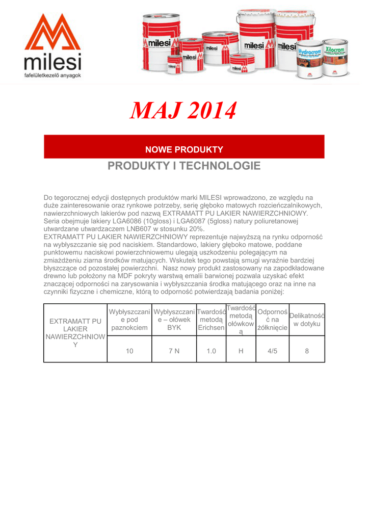 MAJ 2014 NOWE PRODUKTY PRODUKTY I TECHNOLOGIE Do tegorocznej edycji dostępnych produktów marki MILESI wprowadzono, ze względu na duże zainteresowanie oraz rynkowe potrzeby, serię głęboko matowych rozcieńczalnikowych, nawierzchniowych lakierów pod nazwą EXTRAMATT PU LAKIER NAWIERZCHNIOWY. Seria obejmuje lakiery LGA6086 (10gloss) i LGA6087 (5gloss) natury poliuretanowej utwardzane utwardzaczem LNB607 w stosunku 20%. EXTRAMATT PU LAKIER NAWIERZCHNIOWY reprezentuje najwyższą na rynku odporność na wybłyszczanie się pod naciskiem. Standardowo, lakiery głęboko matowe, poddane punktowemu naciskowi powierzchniowemu ulegają uszkodzeniu polegającym na zmiażdżeniu ziarna środków matujących. Wskutek tego powstają smugi wyraźnie bardziej błyszczące od pozostałej powierzchni. Nasz nowy produkt zastosowany na zapodkładowane drewno lub położony na MDF pokryty warstwą emalii barwionej pozwala uzyskać efekt znaczącej odporności na zarysowania i wybłyszczania środka matującego oraz na inne na czynniki fizyczne i chemiczne, którą to odporność potwierdzają badania poniżej: EXTRAMATT PU LAKIER NAWIERZCHNIOW Y Twardość Wybłyszczani Wybłyszczani Twardość Odpornoś metodą Delikatność e pod e – ołówek metodą ć na ołówkow w dotyku paznokciem BYK Erichsen żółknięcie ą 10 7N 1.0 H 4/5 8 Lakier cechuje się ponadto dobrą przejrzystością, a wkrótce doczeka się wydania patentu chroniącego formułę lakieru. Przykładowy cykl lakierowania MEBLE NOWOCZESNE Elementy konstrukcyjne mebli skrzyniowych, fronty, blaty stolików i ław z różnych gatunków drewna Cykl rozcieńczalnikowy, bezbarwny, głęboko matowy, wysoko odporny Opis cyklu: Operacja Podkład poliuretanowy bezbarwny Szlifowanie Poliuretanowy lakier bezbarwny EXTRAMATT System lakierowania EXTRAMATT Grubość Sposób Produkt warstwy w Schnięcie aplikacji g/m² LBA1, utwardzony Natrysk 100-120 W temperaturze pokojowej 80% LNB7, 2 warstwy Papier 320-400 LGA6086 (10gloss) lub LGA6087 (5gloss), Natrysk 100-120 W temperaturze pokojowej utwardzony 20% LNB607, 1 warstwa