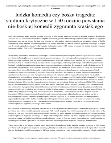 ludzka komedia czy boska tragedia: studium krytyczne w 150 rocznic powstania nie-boskiej komedii zygmunta krasiskiego PDF book - read or download ludzka komedia czy boska tragedia: studium krytyczne w 150 rocznic powstania nie-boskiej komedii zygmunta krasiskiego ludzka komedia czy boska tragedia: studium krytyczne w 150 rocznic powstania nie-boskiej komedii zygmunta krasiskiego. Now you can see ludzka komedia czy boska tragedia: studium krytyczne w 150 rocznic powstania nie-boskiej komedii zygmunta krasiskiego page on our library. On this page you can get information, citations, manuals and alternative version of ludzka komedia czy boska tragedia: studium krytyczne w 150 rocznic powstania nie-boskiej komedii zygmunta krasiskiego. Also you can download ludzka komedia czy boska tragedia: studium krytyczne w 150 rocznic powstania nie-boskiej komedii zygmunta krasiskiego in PDF, DOC or TXT formats using next direct link. In our library you can find mane books, for example : ludzka komedia czy boska tragedia: studium krytyczne w 150 rocznic powstania nie-boskiej komedii zygmunta krasiskiego, primero sueno y otros textos, prohibition, religious freedom, and human rights: regulating traditional drug use, rethinking infrastructure design for multi-use water services, dix ans de rock, quantum brownian motion in c-numbers: theory and applications, new paradigms for treating relationships, shutsudohin tenji mokuroku, haniwa i, zenkoku bungakkan gaido, dut al-salm, concorrenza e antitrust: usi e abusi del mercato le regole e le istituzioni per il suo corretto funzionamento, stille: gedichte, preaching to convince, les maaitres du monde: roman, na cztery rce: opowiadania, east india, claude simon: bio-bibliographie et petit dictionnaire claude simon, the orthodox new testament, some political mythologies: papers delivered to the 5. anglo-dutch historical conference, the kingdom of rarities, engineering mechanics: an introduction to dynamics, the html 4 programmers reference: all platforms, kitab al-waqai: al-quran al-karim wa-al-juhud al-mabdhulah fi khidmatihi min bidayat al-qarn al-rabi ashar al-hijri ila al-yawm min 22-23 safar 1424 h, al-muwafiq 23-24 abril 2004 m, al-mumrasah al-ibdyah f tajribat sud al-ab, creative crewel embroidery: traditions and innovations, nochiho no jitsumu kaisetsu, singleton abbey and the vivians of swansea, the poster: art, advertising, design, and collecting, 1860s-1900s, eros and psyche, amusements in developing algebra skills, door het lint, gottesopfer: thriller, dynamic cardiomyoplasty: the mechanisms and optimization of programming, damals in havanna, inspiration: thoughts & quotations for every day, digitale verarbeitung analoger signale: mit 20 tabellen, second vespers: a father dowling mystery, xiang qi ru men wen da, dachang huizu zizhixian zhi (1986-2004), rning taim: running time, statistical mechanics made simple, ludzka komedia czy boska tragedia: studium krytyczne w 150 rocznic powstania nie-boskiej komedii zygmunta krasiskiego, all this books you can read on our site or download in PDF - ludzka komedia czy boska tragedia: studium krytyczne w 150 rocznic powstania nie-boskiej komedii zygmunta krasiskiego, DOC - ludzka komedia czy boska tragedia: studium krytyczne w 150 rocznic powstania nie-boskiej komedii zygmunta krasiskiego or TXT - ludzka komedia czy boska tragedia: studium krytyczne w 150 rocznic powstania nie-boskiej komedii zygmunta krasiskiego format online. Our collection provide simple ways that you can find a ludzka komedia czy boska tragedia: studium krytyczne w 150 rocznic powstania nie-boskiej komedii zygmunta krasiskiego PDF record digging. And by having usage of our ebooks online or by keeping it , you have convenient answers with ludzka komedia czy boska tragedia: studium krytyczne w 150 rocznic powstania nie-boskiej komedii zygmunta krasiskiego. To begin with finding ludzka komedia czy boska tragedia: studium krytyczne w 150 rocznic powstania nie-boskiej komedii zygmunta krasiskiego, you are to find our website comprehensive ludzka komedia czy boska tragedia: studium krytyczne w 150 rocznic powstania nie-boskiej komedii zygmunta krasiskiego manuals listed. These review site is the biggest of these which have ludzka komedia czy boska tragedia: studium krytyczne w 150 rocznic powstania nie-boskiej komedii zygmunta krasiskiego, literally hundreds of thousands of different products represented. You will also see that there are specific sites catered to different product categories or types, brands or niche categories related with ludzka Page 1 of ludzka komedia czy boska tragedia: studium krytyczne w 150 rocznic powstania nie-boskiej komedii zygmunta krasiskiego ludzka komedia czy boska tragedia: studium krytyczne w 150 rocznic powstania nie-boskiej komedii zygmunta krasiskiego PDF book read or download komedia czy boska tragedia: studium krytyczne w 150 rocznic powstania nie-boskiej komedii zygmunta krasiskiego. So depending on what exactly you are searching, you will be able to choose ebooks ludzka komedia czy boska tragedia: studium krytyczne w 150 rocznic powstania nie-boskiej komedii zygmunta krasiskiego to suit your own needs, ludzka komedia czy boska tragedia: studium krytyczne w 150 rocznic powstania nie-boskiej komedii zygmunta krasiskiego. Page 2 of ludzka komedia czy boska tragedia: studium krytyczne w 150 rocznic powstania nie-boskiej komedii zygmunta krasiskiego
