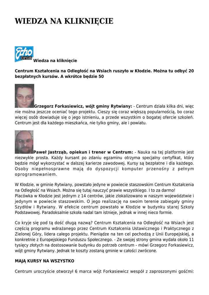 WIEDZA NA KLIKNIĘCIE Wiedza na kliknięcie Centrum Kształcenia na Odległość na Wsiach ruszyło w Kłodzie. Można tu odbyć 20 bezpłatnych kursów. A wkrótce będzie 50 Grzegorz Forkasiewicz, wójt gminy Rytwiany: - Centrum działa kilka dni, więc nie można jeszcze oceniać tego projektu. Cieszy się coraz większą popularnością, bo coraz więcej osób dowiaduje się o jego istnieniu, a przede wszystkim o bogatej ofercie szkoleń. Centrum jest dla każdego mieszkańca, nie tylko gminy, ale i powiatu. Paweł Jastrząb, opiekun i trener w Centrum: - Nauka na tej platformie jest niezwykle prosta. Każdy kursant po zdaniu egzaminu otrzyma specjalny certyfikat, który będzie mógł wykorzystać w dalszej karierze zawodowej. Kursy są bezpłatne i dla każdego. Osoby niepełnosprawne mają do dyspozycji komputer przenośny z pełnym oprogramowaniem. W Kłodzie, w gminie Rytwiany, powstało jedyne w powiecie staszowskim Centrum Kształcenia na Odległość na Wsiach. Można się tutaj nauczyć prawie wszystkiego. I to za darmo! Placówka w Kłodzie jest jednym z 14 centrów, jakie zlokalizowano w naszym województwie i jedynym w powiecie staszowskim. O jego realizację na swoim terenie zabiegały gminy Szydłów i Rytwiany. W efekcie centrum powstało w Kłodzie w budynku starej Szkoły Podstawowej. Paradoksalnie szkoła nadal tam istnieje, jednak w innej nieco formie. Co kryje się pod tą dość długą nazwą? Centrum Kształcenia na Odległość na Wsiach jest częścią programu wdrażanego przez Centrum Kształcenia Ustawicznego i Praktycznego z Zielonej Góry, lidera całego projektu. Pieniądze na ten cel pochodzą z Unii Europejskiej, a konkretnie z Europejskiego Funduszu Społecznego. - Ze swojej strony gmina wydała około 11 tysięcy złotych na dostosowanie budynku do potrzeb centrum - mówi Grzegorz Forkasiewicz, wójt gminy Rytwiany. Jednak te koszty zostaną gminie w całości zwrócone. MAJĄ KURSY NA WSZYSTKO Centrum uroczyście otworzył 6 marca wójt Forkasiewicz wespół z zaproszonymi gośćmi: przedstawicielami władz powiatu staszowskiego, burmistrzami i wójtami gmin sąsiednich, dyrektorami szkół i przedstawicielami środowisk wspierających osoby niepełnosprawne. Bardzo mi się tutaj podoba. Chętnie skorzystam z kilku szkoleń - mówi Angelika. Internetowa szkoła wyposażona jest w 10 nowoczesnych komputerów z dostępem do Internetu. Może z nich skorzystać każdy, kto tylko będzie miał na to ochotę. Internetowa szkoła w Kłodzie oferuje jak na razie możliwość odbycia ponad 20 kursów. Jednak do końca czerwca będzie ich dokładnie 50. Już teraz można się przeszkolić z zakresu przedmiotów humanistycznych, ścisłych, języka angielskiego, obsługi komputera i informatyki. Można też odbyć szkolenie z zakresu opieki nad dziećmi. Do końca czerwca dojdą kolejne, a wśród nich takie szkolenia jak telemarketer, asystent bankowości, broker ubezpieczeniowy, grafik komputerowy, handlowiec, księgowy, organizator agrobiznesu i wiele innych. Oprócz tego jest pełny dostęp do internetu. Na wyposażeniu centrum jest jeszcze urządzenie wielofunkcyjne do drukowania i kopiowania oraz faks. Szkolić można się od wtorku do soboty przez cztery godziny dziennie. WIRTUALNA SZKOŁA DLA KAŻDEGO Szkolenia nie sprowadzają się tylko do ćwiczeń w Internecie, za którymi nic nie idzie. Każdy kurs kończy się egzaminem. Zdanie egzaminu to otrzymanie certyfikatu. Będzie go można z powodzeniem dopiąć do pozostałych dokumentów starając się o pracę, lub podwyżkę. - O ile kurs można sobie rozłożyć w dowolnym czasie, o tyle po jego zakończeniu osoba, która chce zdawać egzamin musi się umówić na konkretny dzień i konkretną godzinę, aby go odbyć - mówi Paweł Jastrząb, trener w centrum. Jest osobą, która odpowiada za przebieg kursów i egzaminów oraz pomaga w ewentualnych problemach. Z bezpłatnych szkoleń mogą korzystać też osoby niepełnosprawne, zarówno na miejscu, jak też we własnym domu. - Dla ich potrzeb przygotowano laptopa z pełnym oprogramowaniem mówi Paweł Jastrząb. Wystarczy się tylko skontaktować z centrum na przykład telefonicznie i poprosić o wypożyczenie laptopa. Paweł Jastrząb pokazuje możliwości szkoleń w wirtualnej szkole w Kłodzie. Mimo, że centrum działa od kilku dni, to liczba korzystających ze zdobyczy cywilizacji przewyższa możliwości centrum. Największą grupę korzystających stanowi młodzież, choć wirtualną szkołę odwiedziło też kilka dorosłych, starszych osób, które rozpoczęły naukę języka obcego, czy obsługi komputera. WARTO SPRÓBOWAĆ Wśród młodych są przeważnie maturzyści, którzy korzystają z kursów przedmiotowych typu chemia, biologia, geografia, matematyka czy historia. Każde wirtualne szkolenie jest bardzo proste w obsłudze, nawet dla osób, które nie miały dotąd zbyt wielu okazji do pracy na komputerze. - Wystarczy tylko czytać to, co jest napisane na ekranie i klikać myszką - mówi Paweł Jastrząb. Bardzo przydatnym narzędziem dla korzystających z tej wirtualnej szkoły jest dostęp do obszernej biblioteki multimedialnej oraz słowników. - Podoba mi się tutaj, to naprawdę świetny pomysł -mówi Angelika. Przyjechała tutaj po raz pierwszy. Gdy odwiedziliśmy Centrum, poznawała podstawy technik komputerowych. - Jest jeszcze wiele rzeczy, których chciałabym się nauczyć. Fajnie, że można z tego skorzystać dodaje. Kontakt z centrum: Centrum Kształcenia na Odległość na Wsiach mieści się w Kłodzie w budynku po byłej Szkole Podstawowej, przy ulicy Jana Pawła II 63. Godziny otwarcia: wtorek: 10-14, środa: 14-18, czwartek: 14-18, piątek: 10-14, sobota: 14-18. Kontakt z centrum: email: [email protected], telefon: 015-864-75-13. Źródło: Echo Powiśla - bezpłatny dodatek do Echa Dnia, z dnia 14 marca 2008r. Autor: Marcin Jarosz. Zdjęcia: Marcin Jarosz. Gmina Rytwiany - www.rytwiany.com.pl