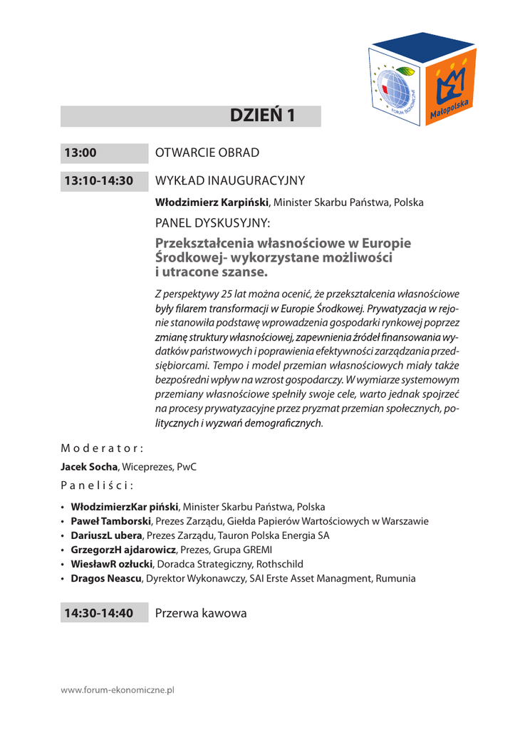 DZIEŃ 1 13:00 OTWARCIE OBRAD 13:10-14:30 WYKŁAD INAUGURACYJNY Włodzimierz Karpiński, Minister Skarbu Państwa, Polska PANEL DYSKUSYJNY: Przekształcenia własnościowe w Europie Środkowej- wykorzystane możliwości i utracone szanse. Z perspektywy 25 lat można ocenić, że przekształcenia własnościowe nie stanowiła podstawę wprowadzenia gospodarki rynkowej poprzez datków państwowych i poprawienia efektywności zarządzania przedsiębiorcami. Tempo i model przemian własnościowych miały także bezpośredni wpływ na wzrost gospodarczy. W wymiarze systemowym przemiany własnościowe spełniły swoje cele, warto jednak spojrzeć na procesy prywatyzacyjne przez pryzmat przemian społecznych, po- Moderator: Jacek Socha, Wiceprezes, PwC Paneliści: • • • • • • WłodzimierzKar piński, Minister Skarbu Państwa, Polska Paweł Tamborski, Prezes Zarządu, Giełda Papierów Wartościowych w Warszawie DariuszL ubera, Prezes Zarządu, Tauron Polska Energia SA GrzegorzH ajdarowicz, Prezes, Grupa GREMI WiesławR ozłucki, Doradca Strategiczny, Rothschild Dragos Neascu, Dyrektor Wykonawczy, SAI Erste Asset Managment, Rumunia 14:30-14:40 Przerwa kawowa 14:40-15:50 PANEL DYSKUSYJNY Strategie sektora chemicznego wobec zmieniających się wyzwań rynkowych Rynkowi eksperci pozytywnie ocenili proces konsolidacji polskiej cheNa rodzimym rynku Grupa Azoty jest już zdecydowanym liderem. Skonsolidowana polska chemia może jednak zajść dalej. Właśnie trwają prace nad kompleksem petrochemicznym, który zdaje się może zostać kołem zamachowym dla całej polskiej gospodarki. Czy kolejne inwestycje mogą wywołać efekt skali, dzięki któremu polski przemysł chemiczny może stać się graczem globalnym? Moderator: RobertG wiazdowski, Prezydent, Centrum im. Adama Smitha Paneliści: • Andrzej Skolmowski, Wiceprezes Zarządu, Grupa Azoty S.A. • Marek Sokołowski, Wiceprezes Zarządu, Dyrektor ds. Produkcji i Rozwoju, Grupa Lotos • TomaszZi eliński, Prezes Zarządu, Polska Izba Przemysłu Chemicznego • RafałB aniak, Podsekretarz Stanu, Ministerstwo Skarbu Państwa 15:50-16:30 OBIAD Procesy inwestycyjne w perspektywie 25 lat transformacji ustrojowej. Transformacja ustrojowa w krajach Europy Środkowej i Wschodniej w sposób diametralny zmieniła reguły działania systemów ekonomicznych, stwarzając nowe, bardzo szerokie możliwości rozwoju. Na każdym z etapów przemian gospodarczych procesy inwestycyjne wynikały z możliwości i warunków oferowanych przez otoczenie polityczne, społeczne i ekonomiczne. Patrząc z perspektywy minionych 25 lat warto pokusić się o ocenę efektywności zastosowanych rozwiązań w poszczególnych sektorach gospodarki w zależności od wielkości przedsiębiorstw. Zrozumienie zmieniającego się tempa i możliwości inwestycyjnych oraz ich regionalnego zróżnicowania jest niezwykle cenne w obliczu poszukiwania możliwości wyjścia z kryzysu gospodarczego. Moderator: PawełL isicki, Redaktor Naczelny, Tygodnik Do Rzeczy Paneliści • • • • MarekS awicki, Minister Rolnictwa i Rozwoju Wsi, Polska BeataSz ydło, Poseł, Wiceprzewodnicząca Komisji Finansów Publicznych KrzysztofP awiński, Prezes Zarządu, Grupa Maspex Wadowice Cordv onL ewinski, Dyrektor Zarządzający, Macquarie Infrastructure and Real Assets 17:40-17:50 Przerwa kawowa 17:50- 19:00 PREZENTACJE • Polityka Handlowa UE, a inwestycje w regionie – Andrzej Dycha, Podsekretarz Stanu, Ministerstwo Gospodarki • CENTRUM EDUKACYJNE MUZEUM ŻYDOWSKIE YIDDISHER HUIZ – Jacek Pilch, pełnomocnik Fundacji Chai ds. budowy w Tarnowie • Centrum Business in Małopolska Marka ekonomiczna regionu – Tomasz Latocha, Wiceprezes, Małopolska Agencja Rozwoju Regionalnego SA • Inese Šuļžanoka, Szef Przedstawicielstwa w Polsce, Agencja Inwestycji i Rozwoju, Łotwa • Marka miasta magnesem dla inwestorów – prezentacje miast ukraińskich – Walerij Logwinow, Szef Centrum Technologii ds. e-administracji 19:00- 19:10 Przerwa kawowa 19:10: 20:20 U sterów polskiej gospodarki – bilans ćwierćwiecza. Transformacja ustrojowa, społeczna i gospodarcza jaka dokonała się po 1989 roku stanowi doskonały przykład ewolucyjnych przemian i dynamicznego rozwoju zainicjowanych przez zmianę warunków politycznych i wyzwolenie nieskrępowanej społecznej przedsiębiorczości. Nowe możliwości rozwojowe stworzyły szansę ale i konieczność dynamicznego wzrostu gospodarczego. Jaka była rola Państwa w tym procesie, ile możliwości udało się wykorzystać, które działania kontynuować – rozstrzygniecie tych kwestii będzie niezwykle ważne dla przyszłości polskiej gospodarki. W tym kontekście nie do przecenienia są doświadczenia ludzi, którzy w minionym ćwierćwieczu wywierali największy wpływ na warunki i rozwój ekonomiczny Polski. Moderator: RyszardP etru, Przewodniczący Rady, Towarzystwo Ekonomistów Polskich Paneliści: • • • • • Emil Wąsacz, Prezes Zarządu, Stalexport Autostrady S.A. AleksanderG rad, Wiceprezes, Tauron Polska Energia S.A. Jacek Socha, Wiceprezes, PwC WiesławKac zmarek, Przewodniczący, Polski Związek Żeglarski JanuszL ewandowski, Poseł do Parlamentu Europejskiego (PRZERWA TECHNICZNA) 20:30 Ceremonia wręczenia nagród Inwestora i Inwestycji Roku Europy Środkowo-Wschodniej DZIEŃ 2 bankowy, fundusze private equity i venture capital, giełdę i środki unijne – aktualny stan i perspektywy. Aktualny stan i perspektywy dla przedsiębiorców w zakresie pozyskania kapitału na rozwój. Czy na rynku jest brak kapitału, czy dobrych projektów? Czy istnieje synergia między wskazanymi w tytule panelu nia rozwoju? Jakie są podstawowe bariery w dostępie do kapitału i jak je przełamać? Dlaczego innowacyjność przebija się z trudem do kasy? Polskie doświadczenia w zakresie wspierania SME – plusy i minusy. Moderator: Magdalena Petryniak, Dyrektor programów strategicznych KAN Paneliści • Filip Berkowski, Dyrektor Inwestycyjny, 