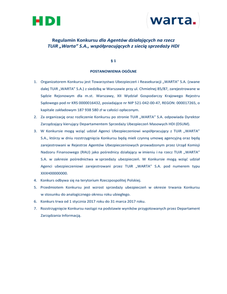 Regulamin Konkursu dla Agentów działających na rzecz TUiR „Warta” S.A., współpracujących z siecią sprzedaży HDI §1 POSTANOWIENIA OGÓLNE 1. Organizatorem Konkursu jest Towarzystwo Ubezpieczeń i Reasekuracji „WARTA” S.A. (zwane dalej TUiR „WARTA” S.A.) z siedzibą w Warszawie przy ul. Chmielnej 85/87, zarejestrowane w Sądzie Rejonowym dla m.st. Warszawy, XII Wydział Gospodarczy Krajowego Rejestru Sądowego pod nr KRS 0000016432, posiadające nr NIP 521-042-00-47, REGON: 000017265, o kapitale zakładowym 187 938 580 zł w całości opłaconym. 2. Za organizację oraz rozliczenie Konkursu po stronie TUiR „WARTA” S.A. odpowiada Dyrektor Zarządzający kierujący Departamentem Sprzedaży Ubezpieczeń Masowych HDI (DSUM). 3. W Konkursie mogą wziąć udział Agenci Ubezpieczeniowi współpracujący z TUiR „WARTA” S.A., którzy w dniu rozstrzygnięcia Konkursu będą mieli czynną umowę agencyjną oraz będą zarejestrowani w Rejestrze Agentów Ubezpieczeniowych prowadzonym przez Urząd Komisji Nadzoru Finansowego (RAU) jako pośrednicy działający w imieniu i na rzecz TUiR „WARTA” S.A. w zakresie pośrednictwa w sprzedaży ubezpieczeń. W Konkursie mogą wziąć udział Agenci ubezpieczeniowi zarejestrowani przez TUiR „WARTA” S.A. pod numerem typu XXXH00000000. 4. Konkurs odbywa się na terytorium Rzeczpospolitej Polskiej. 5. Przedmiotem Konkursu jest wzrost sprzedaży ubezpieczeń w okresie trwania Konkursu w stosunku do analogicznego okresu roku ubiegłego. 6. Konkurs trwa od 1 stycznia 2017 roku do 31 marca 2017 roku. 7. Rozstrzygnięcie Konkursu nastąpi na podstawie wyników przygotowanych przez Departament Zarządzania Informacją. §2 CEL KONKURSU 1. Celem Konkursu jest aktywizacja sprzedaży ubezpieczeń mieszkań i domów mieszkalnych i AC oraz zwiększenie liczby Klientów ubezpieczonych w TUiR „WARTA” S.A. 2. W Konkursie nagrodzeni zostaną Agenci, którzy osiągną najlepsze wyniki zgodne z zasadami określonymi w niniejszym regulaminie. §3 ZASADY KONKURSU 1. Warunkiem przystąpienia do Konkursu jest czynna umowa agencyjna zawarta z TUiR „WARTA” S.A., na podstawie której Agent, zgodnie z potwierdzonymi zapisami oraz ze zgłoszeniem do RAU, co najmniej na miesiąc przed datą rozpoczęcia Konkursu, wykonuje czynności agencyjne na rzecz TUiR „WARTA” S.A. Pośrednik musi być zarejestrowany w Rejestrze Agentów Ubezpieczeniowych prowadzonym przez Urząd Nadzoru Finansowego na mocy wniosku złożonego przez TUiR „WARTA” S.A. 2. Konkurs dedykowany jest dla dwóch grup Agentów wskazanych w załączniku nr 1 do niniejszego Regulaminu. 3. Konkurs polega na aktywizacji sprzedaży poprzez zawarcie w okresie trwania Konkursu umów ubezpieczeń z segmentów: B_AC/KR (STANDARD+KOMFORT), E_MIESZKANIA. 4. O zakwalifikowaniu umów ubezpieczenia do Konkursu decyduje data zawarcia umowy ubezpieczenia 5. W konkursie uwzględniane będą umowy ubezpieczenia zawarte w okresie od 1 stycznia 2017 roku do 31 marca 2017 roku włącznie i zarejestrowane w systemie informatycznym TUiR „WARTA” S.A. do dnia 20 kwietnia 2017 roku. 6. W Konkursie nie będą liczone umowy ubezpieczenia, które zostały anulowane lub rozwiązane do dnia 20 kwietnia 2017 roku. 7. Budowane są dwa rankingi na podstawie osiągniętej łącznej nadwyżki przypisu w stosunku do analogicznego okresu roku ubiegłego przy czym nadwyżka z umów ubezpieczenia z linii E_MIESZKANIA liczona jest podwójnie. 8. Rankingi Konkursowe budowane są malejąco na podstawie osiągniętej nadwyżki przypisu w stosunku do analogicznego okresu roku ubiegłego za sprzedaż produktów objętych Konkursem, przy czym: a) dla uczestników z grupy I, ranking budowany jest osobno dla każdego z Makroregionów Detalicznych b) dla uczestników z grupy II, budowany jest jeden ranking ogólnopolski. Lista pośredników zakwalifikowanych do danej grupy Konkursowej stanowi załącznik nr 1 do niniejszego regulaminu. 9. Dodatkowym, tj. poza zajęciem w rankingu, o którym mowa w ust. 8 miejsca uprawniającego do nagrody, kryterium uzyskania nagrody w Konkursie jest uzyskanie przez Agenta łącznej dynamiki księgowej w okresie trwania Konkursu na poziomie min 100% ze wszystkich produktów ubezpieczeniowych z oferty TUiR „WARTA” S.A. oraz spełnienie warunku określonego w ust. 10. Do zakwalifikowania umów ubezpieczenia pod względem kryterium dynamiki decyduje data księgowania składki, włącznie z korektami, stornami itp 10. Łączny przypis księgowy Agenta w okresie trwania Konkursu ze wszystkich produktów ubezpieczeniowych musi być na poziomie co najmniej 10 000 zł. 11. Za osiągnięcie nadwyżki przypisu z umów ubezpieczenia na produkty biorące udział w Konkursie i zajęciu premiowanej pozycji w Rankingu Konkursowym w jednej z dwóch grup Konkursowych, Agentowi zostanie przyznana nagroda zgodnie z § 4 ust. 1. 12. Agent ma prawo do rezygnacji z nagrody, o której mowa w § 4 ust 1. Brak zgody na wypłatę i/lub przyznanie nagrody wymaga potwierdzenia w formie pisemnej dostarczonego do TUiR „WARTA” S.A. na każdym etapie trwania Konkursu. W tym przypadku, uprawniony do odebrania nagrody jest kolejny Agent w rankingu. 13. Nagroda, o której mowa w § 4 ust 1 w szczególnych przypadkach lub na pisemną prośbę Agenta i po akceptacji Komisji Konkursowej, może zostać przyznana innemu pracownikowi lub OFWCA w tej samej agencji. 14. W przypadku transferu obsługi umów ubezpieczenia pomiędzy Agentami ubezpieczeniowymi (np. łączenie/przejęcie obsługi portfela, zmiana formy prawnej, zatrudnianie nowych pracowników/zleceniobiorców) Komisja Konkursowa zastrzega sobie prawo indywidualnego rozpatrywania takich sytuacji i korekty osiągniętych wyników: a) Agent oraz Regionalny Menadżer Sprzedaży (RMS) zobowiązani są do informowania właściwego Dyrektora Makroregionu Detalicznego HDI (DMD) o w/w zmianach, niezwłocznie po ich zajściu. Niepoinformowanie o w/w może skutkować utr