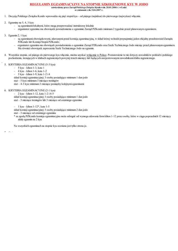 REGULAMIN EGZAMINACYJNY NA STOPNIE SZKOLENIOWE KYU W JODO zatwierdzony przez Zarząd Polskiego Związku Kendo w dn. 28.01.2006 r. w Łodzi ze zmianami z dn. 5.04.2007 r. 1. Decyzją Polskiego Związku Kendo wprowadza się pięć stopni kyu – od piątego (najniższe) do pierwszego (najwyższe) włącznie. 2. Egzaminy na 5, 4, 3 kyu: – są egzaminami lokalnymi, które mogą przeprowadzać instruktorzy lokalnie – organizator egzaminu ma obowiązek powiadomienia o egzaminie Zarząd PZKendo minimum 2 tygodnie przed planowanym egzaminem. 3. Egzamin 2, 1 kyu: – są egzaminami obowiązkowymi, zdawanymi przed komisją egzaminacyjną, w skład której wchodzi przynajmniej jeden oficjalny przedstawiciel Zarządu PZKendo lub Komisji Stopni PZKendo; – organizator egzaminu ma obowiązek powiadomienia o egzaminie Zarząd PZKendo oraz Szefa Technicznego Jodo miesiąc przed planowanym egzaminem. Ma również obowiązek zaproszenia Szefa Technicznego Jodo na egzamin. 4. Wszystkie stopnie, od piątego do pierwszego kyu włącznie, można uzyskać wyłącznie w Polsce. Postanowienie to nie dotyczy zawodników polskich i polskiego pochodzenia, trenujących w klubach zagranicznych powyżej trzech miesięcy lub będących zarejestrowanymi zawodnikami klubu zagranicznego. 5. KRYTERIA EGZAMINACYJNE (53 kyu) – 5 kyu – kihon 13, kata 1 – 4 kyu – kihon 16, kata 12 – 3 kyu – kihon 19, kata 12 i 4 skład komisji egzaminacyjnej: 3 osoby posiadające minimum 1 dan jodo staż – 5 kyu: minimum 3 miesiące treningów staż – 43 kyu: minimum 3 miesiące pomiędzy kolejnymi egzaminami 6. KRYTERIA EGZAMINACYJNE (21 kyu) – 2 kyu – kihon 112, kata 12 i 45 skład komisji egzaminacyjnej: 3 osoby posiadające minimum 1 dan jodo staż – 3 miesiące treningów lub 3 miesiące od ostatniego egzaminu – 1 kyu – kihon 112*, kata 15 skład komisji egzaminacyjnej: 3 osoby posiadające minimum 2 dan jodo staż – 3 miesiące od ostatniego egzaminu * za zgodą PZKendo komisja egzaminacyjna może odstąpić od wymogu zdawania form kihon 112 przez osoby, które w ciągu poprzednich 12 miesięcy zdały egzamin na 2 kyu Na wszystkich egzaminach na stopnie kyu oceniana jest tylko strona jo. 7. Opis: