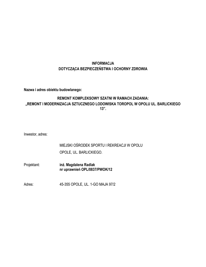 INFORMACJA DOTYCZĄCA BEZPIECZEŃSTWA I OCHORNY ZDROWIA Nazwa i adres obiektu budowlanego: REMONT KOMPLEKSOWY SZATNI W RAMACH ZADANIA: „REMONT I MODERNIZACJA SZTUCZNEGO LODOWISKA TOROPOL W OPOLU UL. BARLICKIEGO 13”. Inwestor, adres: MIEJSKI OŚRODEK SPORTU I REKREACJI W OPOLU OPOLE, UL. BARLICKIEGO. Projektant: inż. Magdalena Radlak nr uprawnień OPL/0837/PWOK/12 Adres: 45-355 OPOLE, UL. 1-GO MAJA 97/2 INFORMACJA DO PLANU BIOZ – CZĘŚĆ OPISOWA 1. Zakres robót całego zamierzenia budowlanego oraz kolejność realizacji poszczególnych obiektów Zakres robót obejmuje remont kompleksowy pomieszczeń zlokalizowanych w przyziemiu budynku. Inwestycja ma na celu poprawienie stanu technicznego pomieszczeń objętych opracowaniem. Prace polegają na: - Skuciu i wykonaniu nowych tynków wewnętrznych po uprzednim odgrzybieniu ścian; - Wykonaniu nowej instalacji elektrycznej, - Wykonaniu instalacji wentylacji mechanicznej, - Wykonaniu instalacji wodno-kanalizacyjnej, - Wykonaniu nowej instalacji co z istniejącego węzła, - Wykonanie nowej stolarki drzwiowej, - Wykonanie nowej stolarki okiennej, - Wykonanie powłok malarskich; - Wykonaniu nowych posadzek i warstw podłogowych; - Wykonanie nowych okładzin ściennych. - Wykonanie przemurowań, - Wykonaniu robót demontażowych i rozbiórkowych. Budynek hali sztucznego lodowiska jest budynkiem istniejącym. Jest to budynek o prostej formie architektonicznej-zbudowanej na planie zbliżonym do prostokąta. Kolejność realizacji prac do uzgodnienia z wykonawcą robót budowlano – montażowych. Przed przystąpieniem do prac budowlano – montażowych teren należy ogrodzić i oznakować tablicami ostrzegawczymi oraz informacyjnymi. 2. Wykaz istniejących obiektów Na terenie zamierzenia budowlanego zlokalizowany jest budynek hali lodowiska „ TOROPOL” , budynek administracyjny, budynki zaplecza technicznego. 3. Elementy zagospodarowania terenu, które mogą stwarzać zagrożenie bezpieczeństwa i zdrowia ludzi - na terenie inwestycji zlokalizowane są istniejące przyłącza i sieci. 4. Wskazanie przewidywanych zagrożeń, występujących podczas realizacji robót budowlanych Podczas realizacji robót budowlanych wystąpią zagrożenia bezpieczeństwa i zdrowia ludzi, związane z następującymi robotami budowlano – montażowymi: - prace z chemia budowlaną; - prace na wysokościach; - prace budowlano – montażowe przy realizacji poszczególnych elementów; - robót montażowych z wykorzystaniem elektronarzędzi; - robót wykończeniowych na rusztowaniach; - transportu materiałów i sprzętu; Czas i skala zagrożeń oraz miejsca szczegółowe ich występowania związane są ściśle z harmonogramem prac, przyjętym przez wykonawcę i należy je szczegółowo określić w planie BIOZ. Skala zagrożenia i ich rodzaj związane są z technologią wykonywania robót uważa się za niebezpieczne. Wykonawca ustala czas wykonania poszczególnych elementów robót oraz technologię wykonania. Z powyższych ustaleń wyniknie ilość zatrudnionych osób i rodzaj zastosowanego sprzętu oraz maszyn i tym podobnych środków realizacji. Miejsca i czas wystąpienia zagrożeń związane są z czasem realizacji i kolejnością wykonywania zadań. Roboty realizować z uzgodnieniem z inwestorem i pod nadzorem. Należy wykonać szczegółowy harmonogram prac i uzgodnić z inwestorem sposób zabezpieczania obiektu. 5. Wskazanie sposobu prowadzenia instruktażu pracowników przed przystąpieniem do realizacji robót szczególnie niebezpiecznych Prace budowlane, objęte przedmiotowym zamierzeniem, w całości należy uznać za niebezpieczne. Pracownicy, po przejściu ogólnego szkolenia z przepisów BHP i przed przystąpieniem do realizacji poszczególnych obiektów, powinni przejść także szkolenie BHP na placu budowy ze szczegółową informacją o zakresie przewidywanych prac dla poszczególnych pracowników. Przeprowadzone szkolenie stanowiskowe powinno być potwierdzone w formie pisemnej. Szkolenie może prowadzić osoba uprawniona do prowadzenia szkoleń w zakresie przepisów BHP, właściwych dla danych rodzajów prac budowlano – montażowych w uzgodnieniu z specjalistą BHP. 6. Wskazanie środków technicznych i organizacyjnych, zapobiegających niebezpieczeństwom wynikającym z wykonywania robót budowlanych w strefach szczególnego zagrożenia zdrowia lub ich sąsiedztwa W przypadku przedmiotowej inwestycji roboty budowlane prowadzone są poza strefami szczególnego zagrożenia. Należy jednak przewidzieć drogi ewakuacyjno – dojazdowe i zagospodarować oraz oznakować miejsca podręcznego sprzętu przeciwpożarowego i pierwszej pomocy oraz telefonu. Informację opracowano zgodnie z Rozporządzeniem Ministra Infrastruktury z dnia 23 czerwca 2003r. (Dz.U. Nr 120, poz. 1126). Na powyższą inwestycję należy sporządzić Plan Bezpieczeństwa i Ochrony Zdrowia.