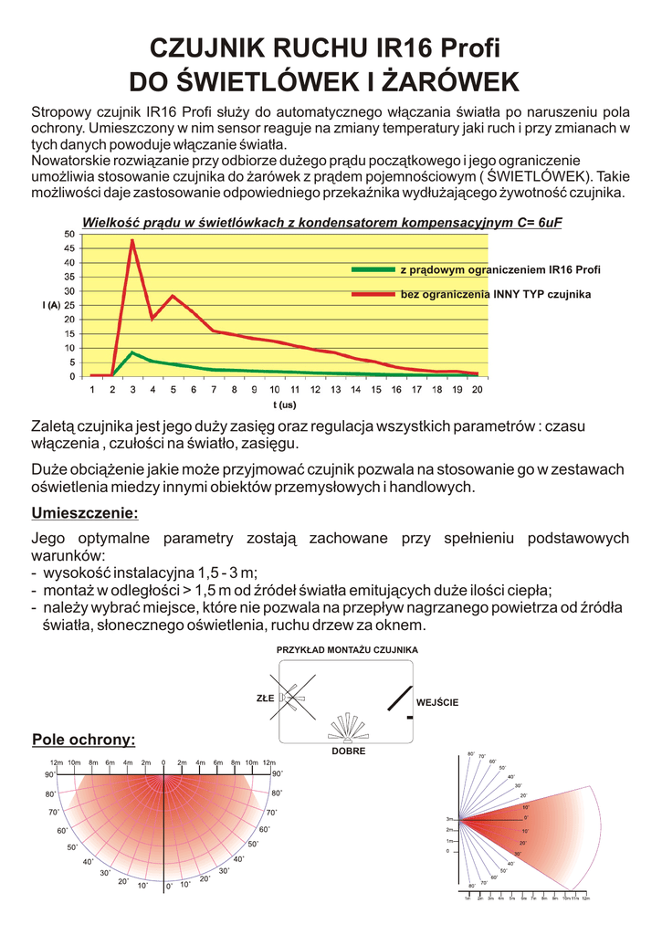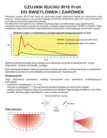 CZUJNIK RUCHU IR16 Profi DO ŚWIETLÓWEK I ŻARÓWEK Stropowy czujnik IR16 Profi służy do automatycznego włączania światła po naruszeniu pola ochrony. Umieszczony w nim sensor reaguje na zmiany temperatury jaki ruch i przy zmianach w tych danych powoduje włączanie światła. Nowatorskie rozwiązanie przy odbiorze dużego prądu początkowego i jego ograniczenie umożliwia stosowanie czujnika do żarówek z prądem pojemnościowym ( ŚWIETLÓWEK). Takie możliwości daje zastosowanie odpowiedniego przekaźnika wydłużającego żywotność czujnika. Wielkość prądu w świetlówkach z kondensatorem kompensacyjnym C= 6uF z prądowym ograniczeniem IR16 Profi bez ograniczenia INNY TYP czujnika Zaletą czujnika jest jego duży zasięg oraz regulacja wszystkich parametrów : czasu włączenia , czułości na światło, zasięgu. Duże obciążenie jakie może przyjmować czujnik pozwala na stosowanie go w zestawach oświetlenia miedzy innymi obiektów przemysłowych i handlowych. Umieszczenie: Jego optymalne parametry zostają zachowane przy spełnieniu podstawowych warunków: - wysokość instalacyjna 1,5 - 3 m; - montaż w odległości > 1,5 m od źródeł światła emitujących duże ilości ciepła; - należy wybrać miejsce, które nie pozwala na przepływ nagrzanego powietrza od źródła światła, słonecznego oświetlenia, ruchu drzew za oknem. PRZYKŁAD MONTAŻU CZUJNIKA ZŁE Pole ochrony: WEJŚCIE DOBRE Funkcje: 1. Zmiana zasięgu (SENS): Zasięg regulowany od 2 do 11m. 1 2 3 2. Czas włączenia (TIME): Tym pokrętłem ustawiamy czas włączenia światła. min około 5s max około 10minut 3. Regulacja czułości na światło (PHOTO): Regulacja czułości na światło pozwala na ustawienie reakcji czujnika w dzień i w nocy lub tylko w nocy. włączenie dzień i noc 1- zasięg 2- czas włączenia 3- regulacja czułości na światło włączenie tylko w nocy Instalacja: rys.1 1, Wybrać miejsce o wysokości 1,5 - 3 m. 2, Oddzielić przednią osłone (rys.1). 3, Wyłączyć zasilanie elektryczne. Podpiąć przewody elektryczne zgodnie ze schematem (patrz rys.1). 4, Zamocować przednią osłonę, zamocować czujnik na ścianie (patrz str.1). Uwaga: przy pierwszym podłączeniu do prądu dojdzie do automatycznego włączenia na czas ustawiony pokrętłem TIME. Po wyłączeniu należy poczekać ok. 30s (uzbrojenie się czujnika), potem już czujnik działa zgodnie z ustawieniami! 5, Nastawić czułość na światło, czas świecenia, zasięg. Schemat podłączenia: BRĄZOWY L WEJŚCIE NIEBIESKI L WYJŚCIE CZERWONY N Po załączeniu przetestować nastawione parametry. 3680 W/ VA W przypadku reklamacji prosimy o kontakt z dystrybutorem. Techniczne parametry Zasilanie: Obciążenie: Zasięg(< 24°C): Promień ochrony: Czas włączenia: Wysokość instalacyjna: Regulacja czułości na światło: Stopień ochrony: Temperatura pracy: IR16 Profi 230V/ 50Hz 3680W (max.16A) 2 do 11m (nastawialny) 180° 5s do 10min (nastawialny) 1,5 do 3 m < 5Lux do 1000Lux (nastawialna) IP44 -20°C do +40°C GWARANCJA NA PRODUKT: 3 LATA Dystrybutor : Elektrobok PL 32-040 Świątniki Górne ul.Bielowicza 46 tel/fax 0122704139 e-mail:[email protected] MADE IN CZECH REPUBLIC www.elbock.cz
