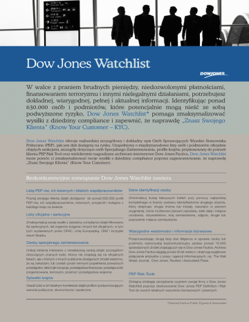 Dow Jones Watchlist W walce z praniem brudnych pieniędzy, niedozwolonymi płatnościami, finansowaniem terroryzmu i innymi nielegalnymi działaniami, potrzebujesz dokładnej, wiarygodnej, pełnej i aktualnej informacji. Identyfikując ponad 630.000 osób i podmiotów, które potencjalnie mogą nieść ze sobą podwyższone ryzyko, Dow Jones Watchlist* pomaga zmaksymalizować wysiłki z dziedziny compliance i zapewnić, że naprawdę „Znasz Swojego Klienta” (Know Your Customer – KYC). Dow Jones Watchlist oferuje najbardziej szczegółowy i dokładny opis Osób Sprawujących Wysokie Stanowiska Polityczne (PEP), jaki jest dziś dostępny na rynku. Uzupełniony o międzynarodowe listy osób i podmiotów oficjalnie objętych sankcjami, szczegóły dotyczące osób Specjalnego Zainteresowania, profile krajów, przystosowany do potrzeb klienta PEP Risk Tool oraz wielokrotnie nagradzane archiwum internetowe Dow Jones Factiva, Dow Jones Watchlist może pomóc ci zmaksymalizować twoje wysiłki z dziedziny compliance poprzez zagwarantowanie, że naprawdę „Znasz Swojego Klienta” (Know Your Customer). Bezkonkurencyjne rozwiązanie Dow Jones Watchlist zawiera .......................................................................................................................................................... Listę PEP-ów, ich krewnych i bliskich współpracowników Dane identyfikacji osoby Poznaj swojego klienta dzięki dostępowi do ponad 630.000 profili PEP-ów, ich współpracowników, krewnych, przyjaciół i kolegów z każdego kraju na świecie. Zminimalizuj liczbę fałszywych trafień przy pomocy najbardziej kompletnego w branży zestawu identyfikatorów drugiego stopnia, który obejmuje: drugie imiona lub inicjały, nazwisko w pisowni oryginalnej, rózne możliwosci pisowni nazwiska, wiek datę i miejsce urodzenia, obywatelstwo, kraj zamieszkania, zdjęcia, drugie lub poprzednie miejsce zamieszkania. Listy oficjalne i sankcyjne Zmaksymalizuj swoje wysiłki z dziedziny compliance dzięki filtrowaniu list sankcyjnych, list organów ścigania i innych list oficjalnych, w tym tych wydawanych przez OFAC, Unię Europejską, ONZ i brytyjski resort Skarbu. Osoby specjalnego zainteresowania Unikaj robienia interesów z niewłaściwą osobą dzięki szczegółom dotyczącym znanych ludzi, którzy nie znajdują się na oficjalnych listach, ale o których z innych publicznie dostępnych źródeł wiadomo, że są oskarżani, lub zostali uznani winnymi popełnienia poważnych przestępstw, takich jak korupcja, przestępstwa finansowe, przestępczość zorganizowana, terroryzm, przemyt i przestępstwa wojenne. Sylwetki krajów Osadź ludzi w ich lokalnym kontekście dzięki profilom podsumowującym warunki polityczne, ekonomiczne i społeczne. Wiarygodne wiadomości i informacje biznesowe Przeprowadzając drugą fazę due diligence w sprawie osoby lub podmiotu wykorzystaj bezkonkurencyjny zestaw ponad 16.000 sprawdzonych źródeł znajdujących się w Dow Jones Factiva. Archiwa Dow Jones Factiva sięgają ponad 30 lat wstecz i obejmują wyjątkowe połączenie artykułów z prasy i agencji informacyjnych, np. The Wall Street Journal, Dow Jones, Reuters i Associated Press. PEP Risk Tools Zintegruj strategię zarządzania ryzykiem swojej firmy z Dow Jones Watchlist poprzez dostosowanie Dow Jones PEP Definition i Risk Tool do swoich lokalnych warunków biznesowych i prawnych. *Dawniej Factiva Public Figures & Associates Dow Jones Watchlist Znaj nazwiska. Znaj powiązania. .......................................................................................................................................................... • Przeprowadzaj proces wzmożonej starannosci efektywniej i skuteczniej należytej • Zaostrz kontrolę nad praniem brudnych pieniędzy i nielegalnymi płatnościami • Unikaj zagrożeń prawnych oraz ryzyka dla swojej reputacji, jakie może ze sobą nieść robienie interesów z niewłaściwą osobą • Prześwietlaj osoby i podmioty pod kątem negatywnych informacji, by zmaksymalizować wysiłki w dziedzinie compliance Dow Jones Watchlist - Internetowe narzędzie do wyszukiwania danych .......................................................................................................................................................... Dow Jones robi różnicę. Obsesja jakości. Doskonały serwis. Oparta na analizie ponad 16.000 publicznie dostępnych źródeł w 22 światowych językach baza danych Dow Jones Watchlist jest uzupełniana o szczegóły pochodzące z katalogów branżowych publikowanych lokalnie, źródeł drukowanych i szerokiej palety stron internetowych. Informacje z Dow Jones Watchlist, kluczowe dla twojego sukcesu w dziedzinie compliance, są stale uaktualniane dzięki wsparciu międzynarodowego i wielojęzycznego zespołu Dow Jones Research Editors, który czuwa nad uczciwością dziennikarską oraz jakością źródeł i informacji Dow Jonesa. Zależy nam na twoim sukcesie. Elastyczne i dostosowane do potrzeb klienta możliwości dostarczenia danych Do danych Dow Jones Watchlist można uzyskać dostęp na dwa sposoby: 1. Bezpieczny internetowy interface Dow Jones Watchlist zapewnia szybki dostęp do informacji, których potrzebujesz, by móc podejmować świadome decyzje z dziedziny compliance. 2. Elastyczne opcje dostarczania wsadu (surowych danych) informacyjnego pozwalają ci: i. Inkorporować dane do twoich wewnętrznych systemów compliance ii. Integrować wsad z przetwarzanymi plikami lub oprogramowaniem monitorującym transakcje iii. Włączać dane do sprofilowanego rozwiązania opartego na Dow Jones Client Solutions. Dow Jones gwarantuje, że w pełni skorzystasz z zalet Dow Jones Watchlist. Dzięki Factiva Membership CircleSM, wszyscy klienci Dow Jonesa mają natychmiastowy dostęp do całościowego wsparcia przez 24 godziny na dobę, na całym świecie. Próbka wyników wyszukiwania. Profile zawierają informacje z drugiego poziom