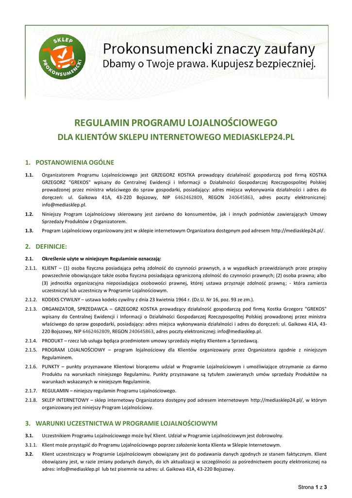 REGULAMIN PROGRAMU LOJALNOŚCIOWEGO DLA KLIENTÓW SKLEPU INTERNETOWEGO MEDIASKLEP24.PL 1. POSTANOWIENIA OGÓLNE 1.1. Organizatorem Programu Lojalnościowego jest GRZEGORZ KOSTKA prowadzący działalność gospodarczą pod firmą KOSTKA GRZEGORZ "GREKOS" wpisany do Centralnej Ewidencji i Informacji o Działalności Gospodarczej Rzeczypospolitej Polskiej prowadzonej przez ministra właściwego do spraw gospodarki, posiadający: adres miejsca wykonywania działalności i adres do doręczeń: ul. Gaikowa 41A, 43-220 Bojszowy, NIP 6462462809, REGON 240645863, adres poczty elektronicznej: [email protected]. 1.2. Niniejszy Program Lojalnościowy skierowany jest zarówno do konsumentów, jak i innych podmiotów zawierających Umowy Sprzedaży Produktów z Organizatorem. 1.3. Program Lojalnościowy organizowany jest w sklepie internetowym Organizatora dostępnym pod adresem http://mediasklep24.pl/. 2. DEFINICJE: 2.1. Określenie użyte w niniejszym Regulaminie oznaczają: 2.1.1. KLIENT – (1) osoba fizyczna posiadająca pełną zdolność do czynności prawnych, a w wypadkach przewidzianych przez przepisy powszechnie obowiązujące także osoba fizyczna posiadająca ograniczoną zdolność do czynności prawnych; (2) osoba prawna; albo (3) jednostka organizacyjna nieposiadająca osobowości prawnej, której ustawa przyznaje zdolność prawną; - która zamierza uczestniczyć lub uczestniczy w Programie Lojalnościowym. 2.1.2. KODEKS CYWILNY – ustawa kodeks cywilny z dnia 23 kwietnia 1964 r. (Dz.U. Nr 16, poz. 93 ze zm.). 2.1.3. ORGANIZATOR, SPRZEDAWCA – GRZEGORZ KOSTKA prowadzący działalność gospodarczą pod firmą Kostka Grzegorz "GREKOS" wpisany do Centralnej Ewidencji i Informacji o Działalności Gospodarczej Rzeczypospolitej Polskiej prowadzonej przez ministra właściwego do spraw gospodarki, posiadający: adres miejsca wykonywania działalności i adres do doręczeń: ul. Gaikowa 41A, 43220 Bojszowy, NIP 6462462809, REGON 240645863, adres poczty elektronicznej: [email protected]. 2.1.4. PRODUKT – rzecz lub usługa będąca przedmiotem umowy sprzedaży między Klientem a Sprzedawcą. 2.1.5. PROGRAM LOJALNOŚCIOWY – program lojalnościowy dla Klientów organizowany przez Organizatora zgodnie z niniejszym Regulaminem. 2.1.6. PUNKTY – punkty przyznawane Klientowi biorącemu udział w Programie Lojalnościowym i umożliwiające otrzymanie za darmo Produktu na warunkach niniejszego Regulaminu. Punkty przyznawane są tytułem zawieranych umów sprzedaży Produktów na warunkach wskazanych w niniejszym Regulaminie. 2.1.7. REGULAMIN – niniejszy regulamin Programu Lojalnościowego. 2.1.8. SKLEP INTERNETOWY – sklep internetowy Organizatora dostępny pod adresem internetowym http://mediasklep24.pl/, w którym organizowany jest niniejszy Program Lojalnościowy. 3. WARUNKI UCZESTNICTWA W PROGRAMIE LOJALNOŚCIOWYM 3.1. Uczestnikiem Programu Lojalnościowego może być Klient. Udział w Programie Lojalnościowym jest dobrowolny. 3.1.1. Klient może przystąpić do Programu Lojalnościowego poprzez założenie konta Klienta w Sklepie Internetowym. 3.2. Klient uczestniczący w Programie Lojalnościowym obowiązany jest do podawania danych zgodnych ze stanem faktycznym. Klient obowiązany jest, w razie zmiany podanych danych, do ich aktualizacji w szczególności za pośrednictwem poczty elektronicznej na adres: [email protected] lub też pisemnie na adres: ul. Gaikowa 41A, 43-220 Bojszowy. Strona 1 z 3 4. WARUNKI PROGRAMU LOJALNOŚCIOWEGO 4.1. Program Lojalnościowy obowiązuje przez czas nieokreślony. Program obowiązuje do 31.12.2016 r. Klient zachowuje prawo wykorzystania zgromadzonych Punktów przez okres sześciu miesięcy po zakończeniu Programu. 4.2. Klientowi biorącemu udział w Programie Lojalnościowym przyznawane są Punkty tytułem zawieranych przez niego umów sprzedaży Produktów w Sklepie Internetowym. 4.3. Ilość Punktów przyznawanych Klientowi z tytułu zawieranej przez niego umowy sprzedaży Produktu jest wskazywana na stronie Sklepu Internetowego w opisie każdego Produktu biorącego udział w Programie Lojalnościowym. 4.4. Klientowi nie przysługują Punkty w wysokości wskazanej zgodnie z pkt. 4.3, w przypadku zawarcia umowy sprzedaży Produktu, gdy: 4.4.1. w wyniku uzgodnień Klienta ze Sprzedawcą, Klientowi został przyznany dodatkowy rabat na ten Produkt w wysokości co najmniej 5% ceny tego Produktu; 4.4.2. w wyniku uzgodnień Klienta ze Sprzedawcą, Klient otrzymał dodatkowo za darmo inny Produkt (gratis) o wartości co najmn iej 5% ceny Produktu, którego dotyczyła w/w umowa sprzedaży; 4.4.3. przy płatności za ten Produkt, Klient skorzystał z systemu ratalnego 3x0%; 4.4.4. Klient odstąpił od umowy sprzedaży tego Produktu. 4.5. Po zawarciu umowy sprzedaży Produktu Organizator odnotowuje zwiększenie ilości Punktów przypisanych do danego Klienta w jego koncie Klienta w Sklepie Internetowym. Poza możliwością samodzielnego sprawdzenia ilości posiadanych Punktów ramach konta Klienta, Klient jest uprawniony także w każdej chwili uzyskać od Organizatora informację o ilości posiadanych Punktów – w tym celu Klient może kontaktować się z Organizatorem w szczególności za pośrednictwem poczty elektronicznej na adres: [email protected] lub też pisemnie na adres: ul. Gaikowa 41A, 43-220 Bojszowy. 5. WYMIANA PUNKTÓW NA PRODUKT 5.1. Klient jest uprawniony do wymiany przyznanych mu Punktów na Produkt dostępny w Sklepie Internetowym. 5.2. Ilość Punktów potrzebnych do wymiany na dany Produkt wskazana jest w opisie każdego Produktu. 5.3. Klient uprawniony do wymiany Punktów na Nagrodę może dokonać wymiany składając zamówienie w Sklepie Internetowym na Produkt oznaczony ilością Punktów uprawniającą do otrzymania tego Produktu za darmo i wybierając w trakcie składania zamówienia płatność Punktami. Ewentualnie Klient, który chce dokonać wymiany Punktów na Nagrodę może także w tej sprawie skontaktować się z Organi